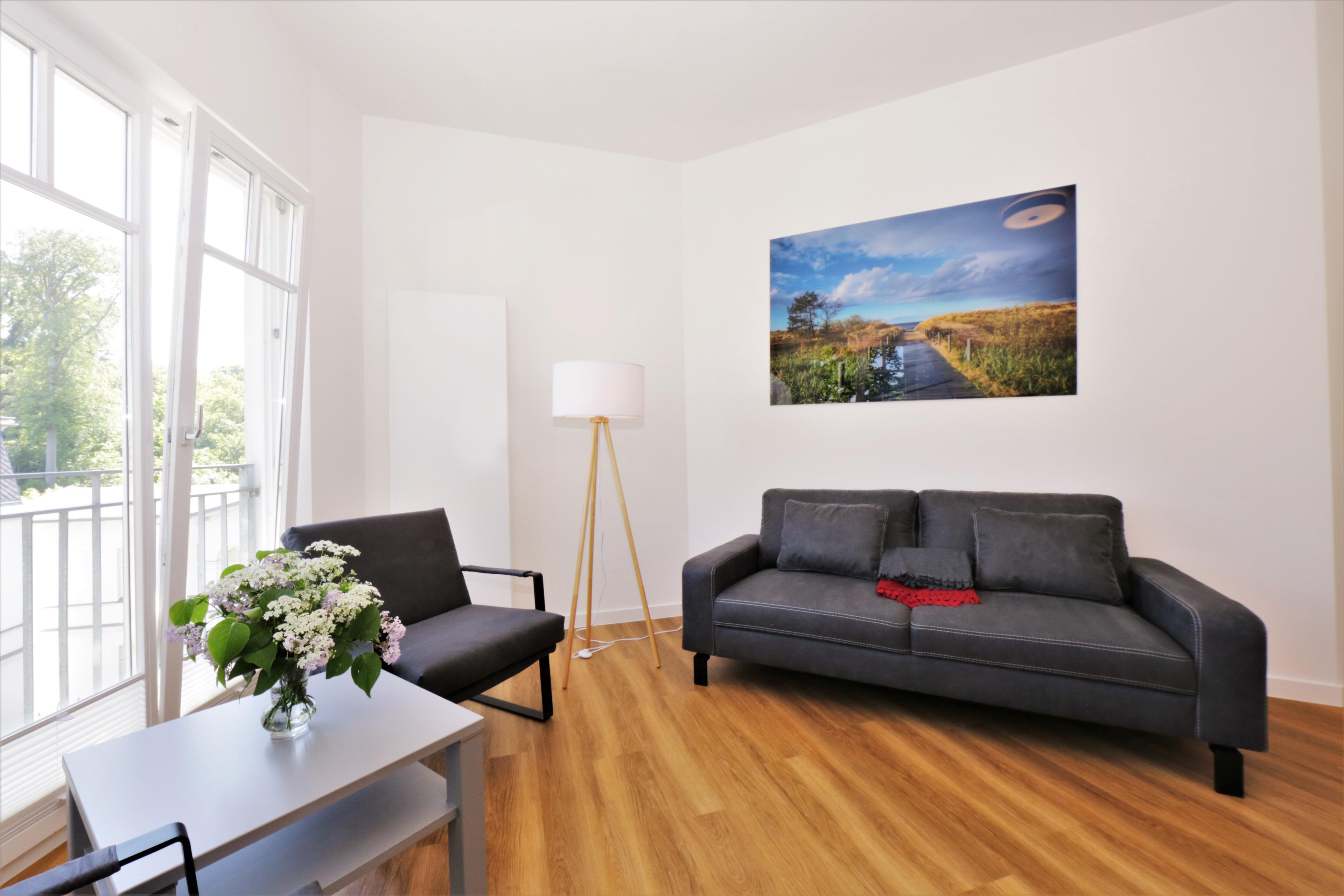 Moderne Ferienwohnung mit Balkon nahe Strand und Bansiner Seebrücke, ideal für erholsamen Ostseeurlaub.