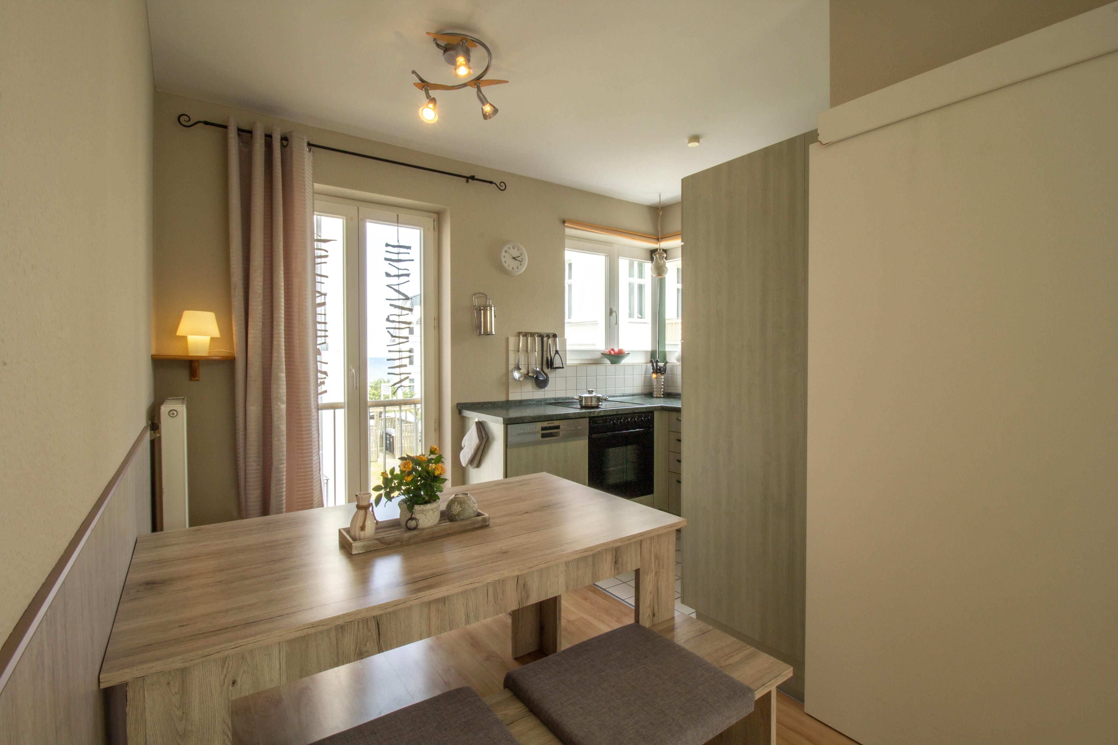 Diese gemütliche 3-Raum-Wohnung liegt im 1. Obergeschoß mit einen sonnigen Balkon in Richtung Buchenwald. Im Wohnbereich befinden sich eine Couchecke, Couchtisch und TV. Die an den Wohnbereich angrenzende Küche ist mit einem Essplatz eingerichtet und verfügt über Herd mit Backofen, Kühlschrank mit Gefrierfach, Mikrowelle, Geschirrspüler etc. Beide Schlafzimmer sind mit einem Boxspringbett (180 x 200) sowie einem Kleiderschrank möbliert. Das Bad ist mit einer Dusche und Waschtisch/WC ausgestattet. Ein Pkw-Stellplatz steht Ihnen auf dem Grundstück zur Verfügung.