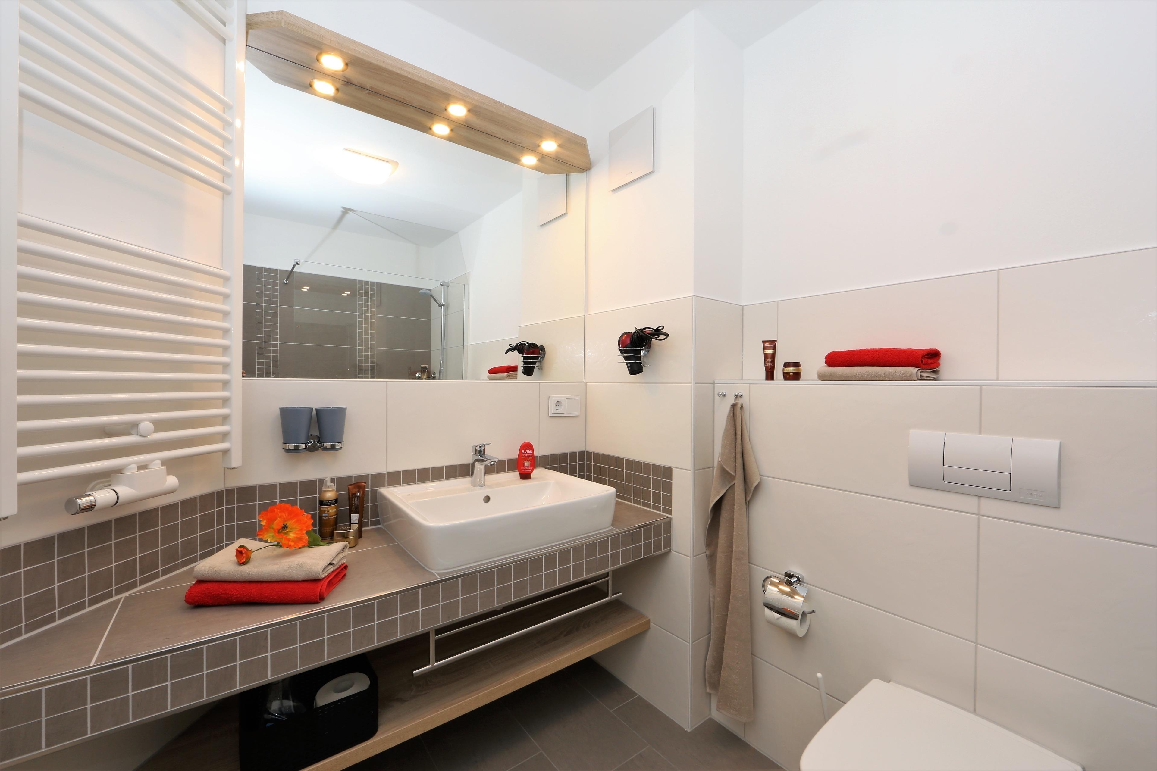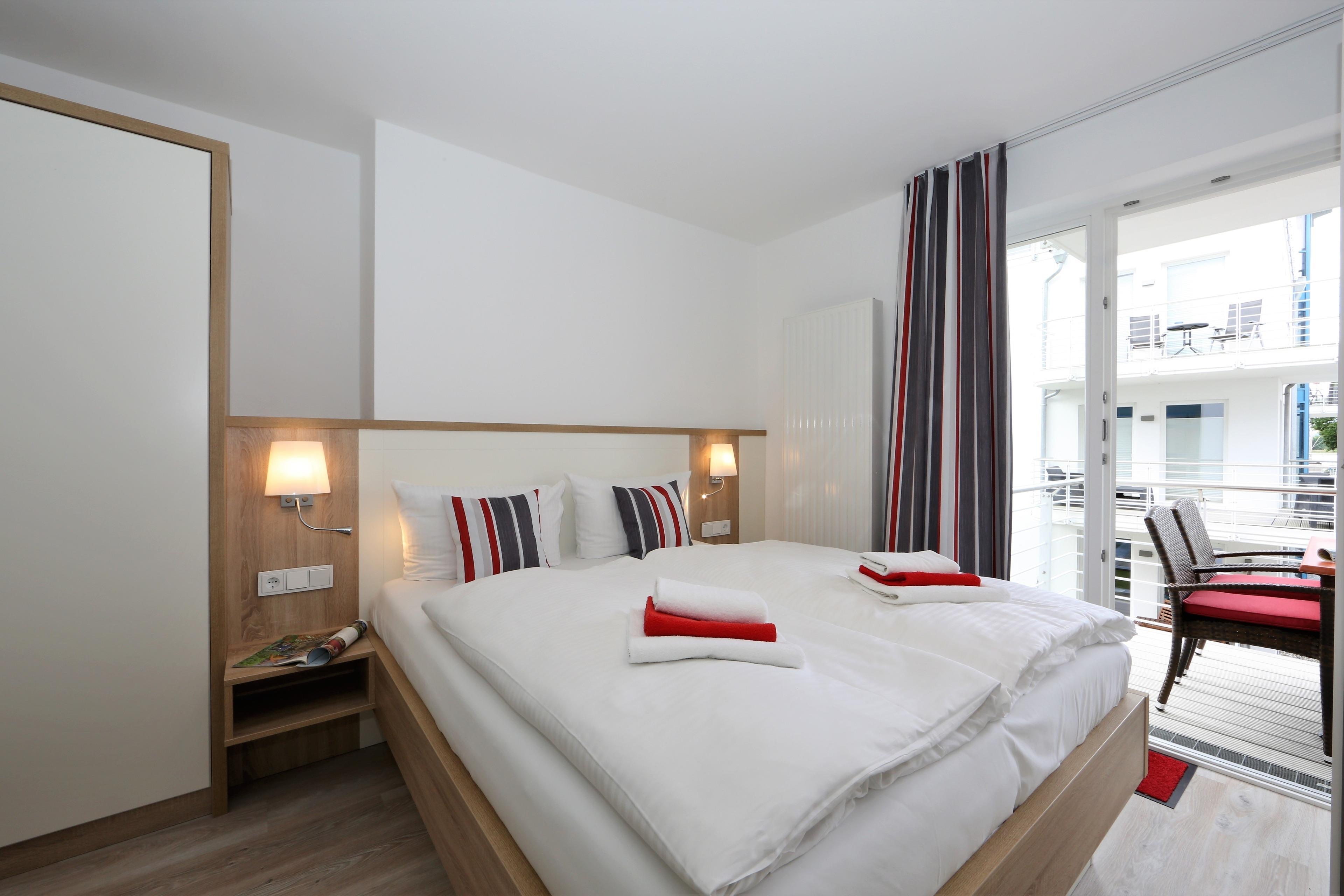 Dieses modern und hochwertig eingerichtete 66 qm große Drei-Zimmer Appartement befindet sich im 1. Obergeschoss mit Ausrichtung zum Südwesten. Das helle Wohnzimmer, mit großer Fensterfront, ist mit einem Esstisch, der bis zu 4 Personen Platz bietet und einer gemütlichen Couchecke eingerichtet. Flat-TV sowie Radio/CD sind selbstverständlich. Die offene Vollküche ist im Wohnraum integriert und mit Backofen/ Ceranfeld, Kühlschrank, Geschirrspüler, Mikrowelle pp. ausgestattet. Der große, zum Süden ausgerichtete, möblierte Balkon ist von beiden Schlafzimmern begehbar und verspricht den ganzen Tag Sonne. Die Schlafzimmer sind mit jeweils einem Doppelbett mit getrennten Matratzen (80 bzw. 90 x 200) und ausreichend Schrankraum eingerichtet. Das Badezimmer ist mit einer ebenerdigen Dusche, Waschbecken und WC ausgestattet. Eine zusätzliche Gästetoilette steht zur Verfügung. Der Pkw-Stellplatz befindet sich auf dem Grundstück in der Tiefgarage und ist der Wohnung zugeordnet. Fahrräder können im Fahrradkeller untergestellt werden.