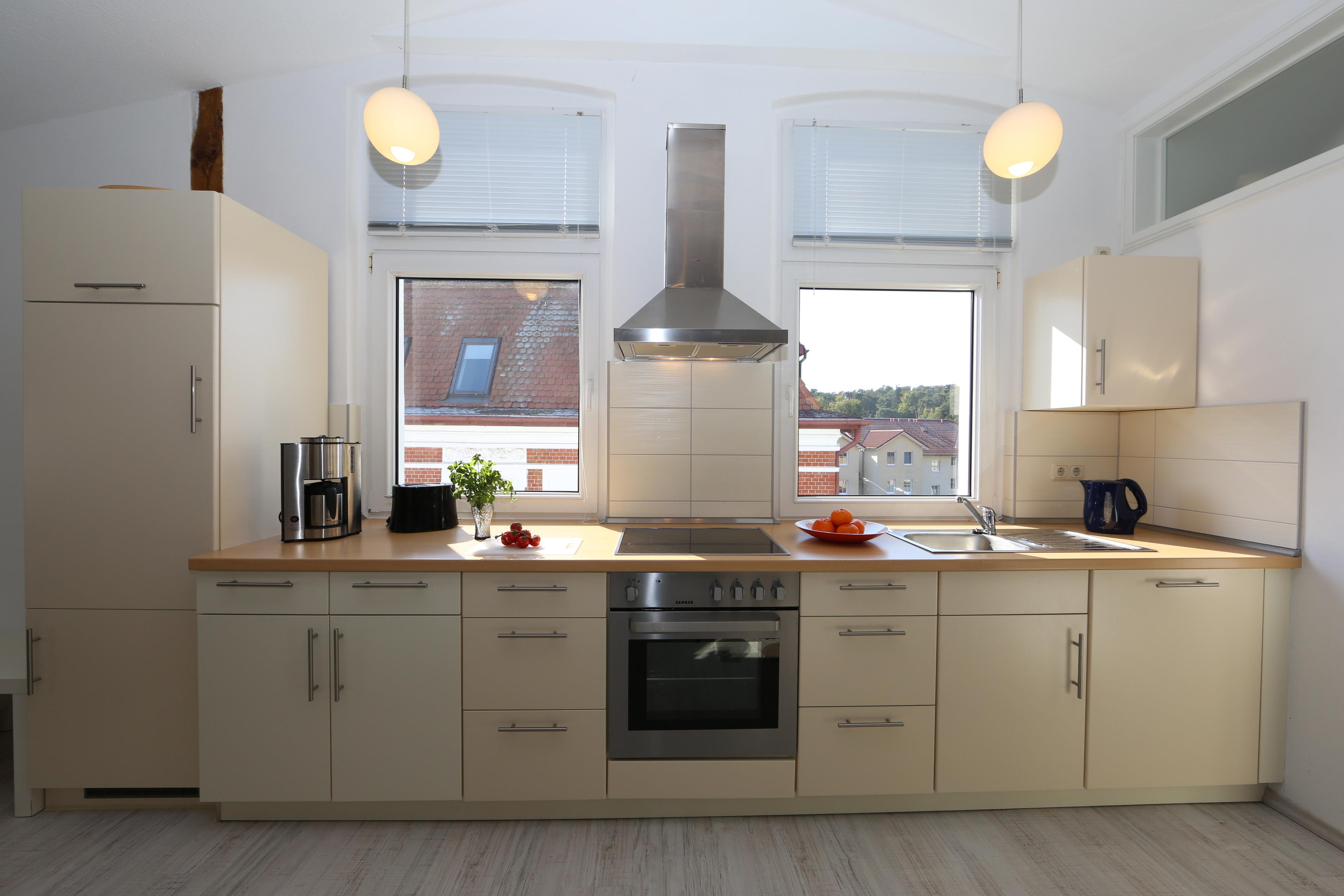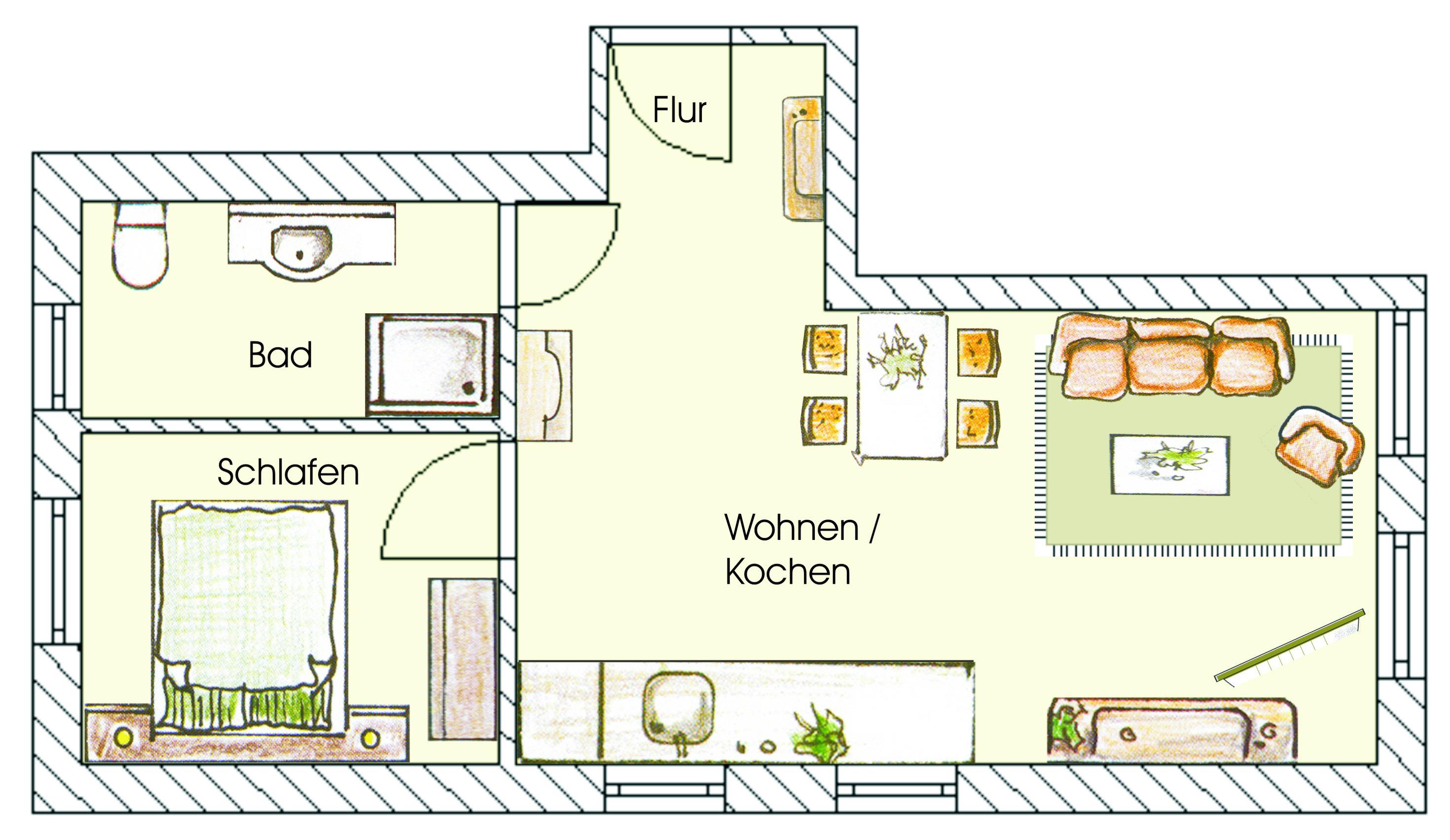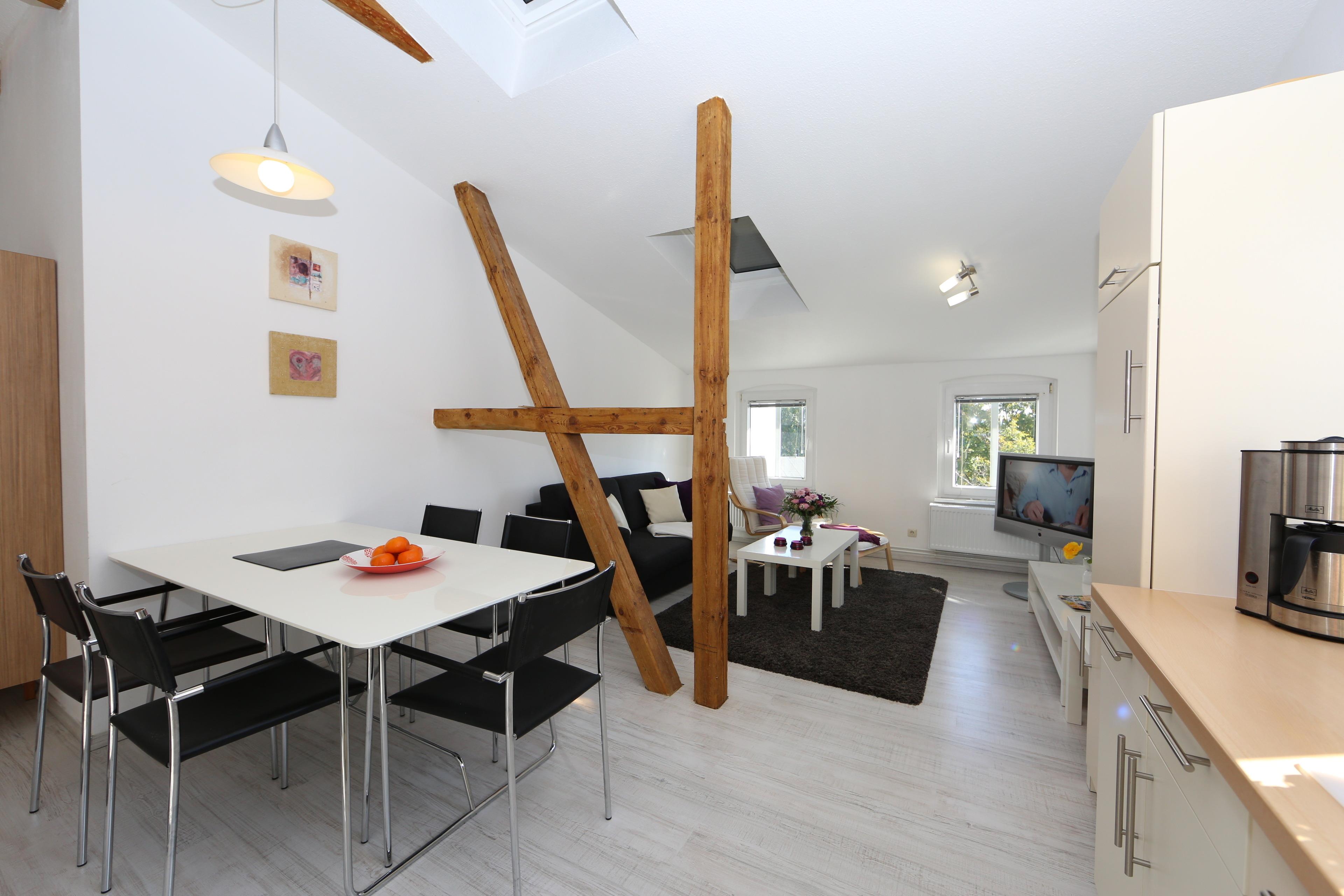Im Dachgeschoss gelegen bietet diese 44 qm große 2-Zimmer Wohnung 2-3 Personen Platz für einen angenehmen Ferienaufenthalt. Der großzügige offene Wohnraum strahlt mit seinen dekorativen Dachbalken einen besonderen Charme aus. Hier finden Sie eine gemütliche Sitzecke mit Couch incl. Schlaffunktion (Liegefläche 150 x 200), einen Relaxsessel und einen großen Flat TV. Der Esstisch für 4 Personen sowie die moderne Einbauküche incl. Ceranfeld mit Backofen, Kühlschrank, Geschirrspüler pp. befinden sich ebenfalls im Wohnraum. Das Schlafzimmer ist mit einem Doppelbett mit getrennten Matratzen (90 x 200) und einem Kleiderschrank eingerichtet. Im Badezimmer steht den Gästen eine Echtglasdusche und Waschtisch/WC zur Verfügung. Ihren Pkw sowie Fahrräder können die Gäste auf dem Grundstück abstellen.