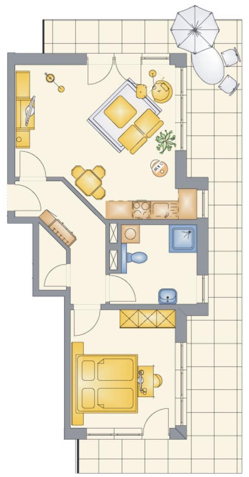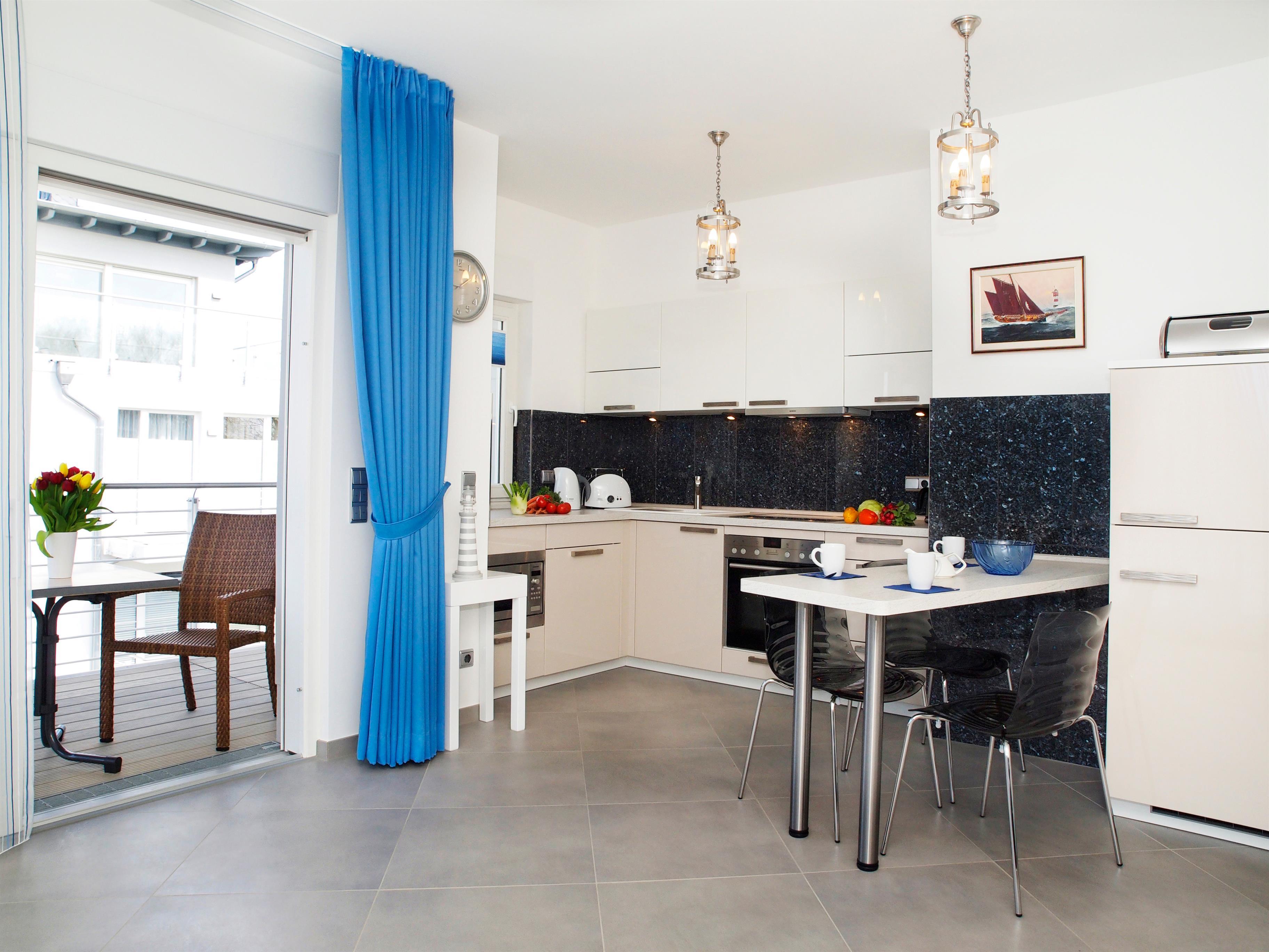 Dieses modern und geschmackvoll eingerichtete großzügige 2-Zimmer Penthouse - Appartement liegt im 3. Obergeschoss und ist 58 qm groß. Das helle Wohnzimmer mit großer Fensterfront zur Ostsee ist mit einem Esstisch, der 2 Personen Platz bietet und einer gemütlichen Couchecke eingerichtet. Ein großer umlaufender Balkon, der zur Seeseite einen Blick auf die Ostsee freigibt, ist ein Highlight dieser Wohnung. Eine im Wohnbereich integrierte moderne Küchenzeile mit Geschirrspüler, Backofen, Mikrowelle p.p verführt zum Kochen. Das Schlafzimmer ist mit Doppelbett und genügend Schrankraum ausgestattet. Im Bad mit Tageslichtfenster finden Sie Dusche, WC und einen Waschtisch. Der Pkw-Stellplatz befindet sich in der Tiefgarage und ist der Wohnung zugeordnet. Fahrräder können im Keller untergestellt werden.