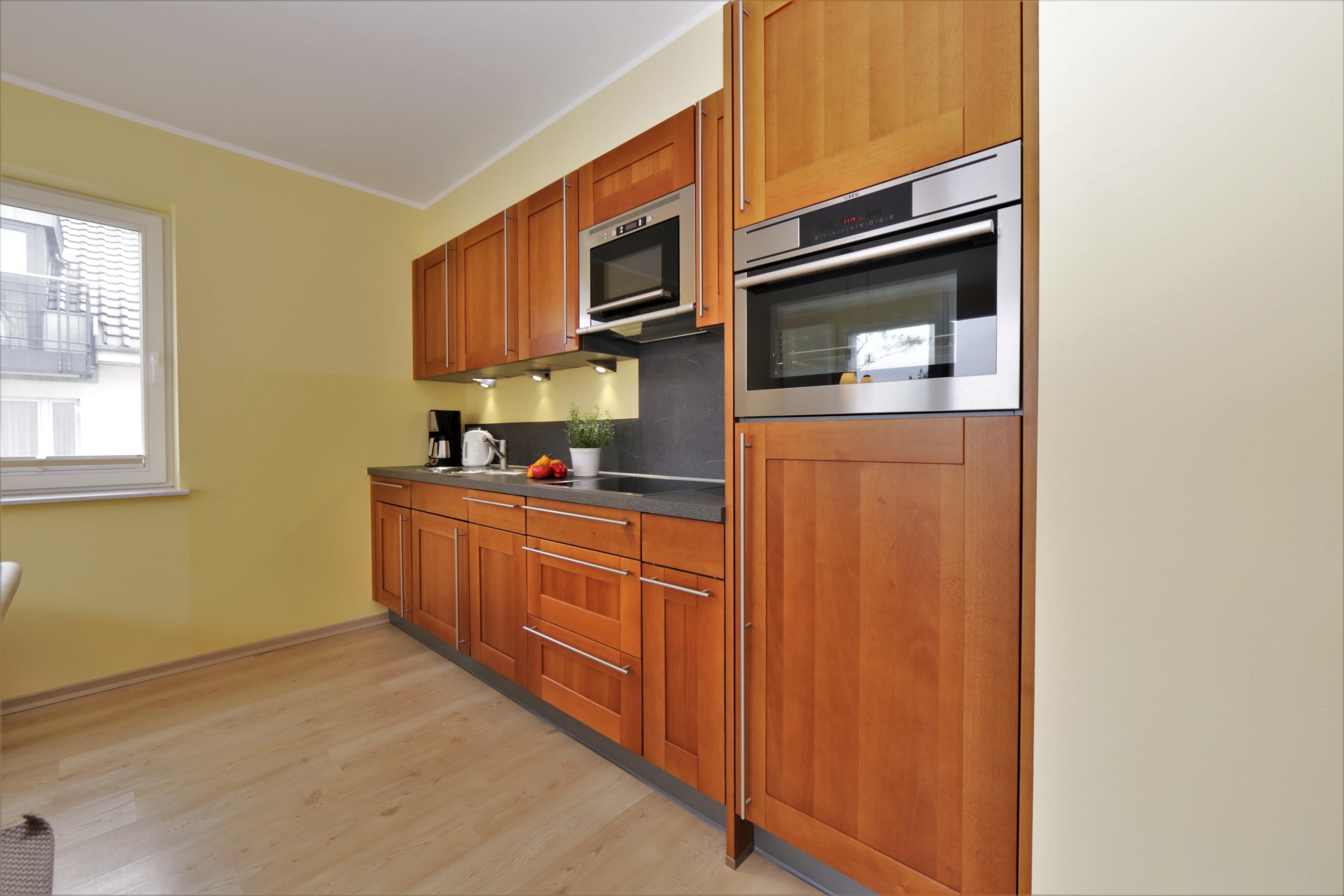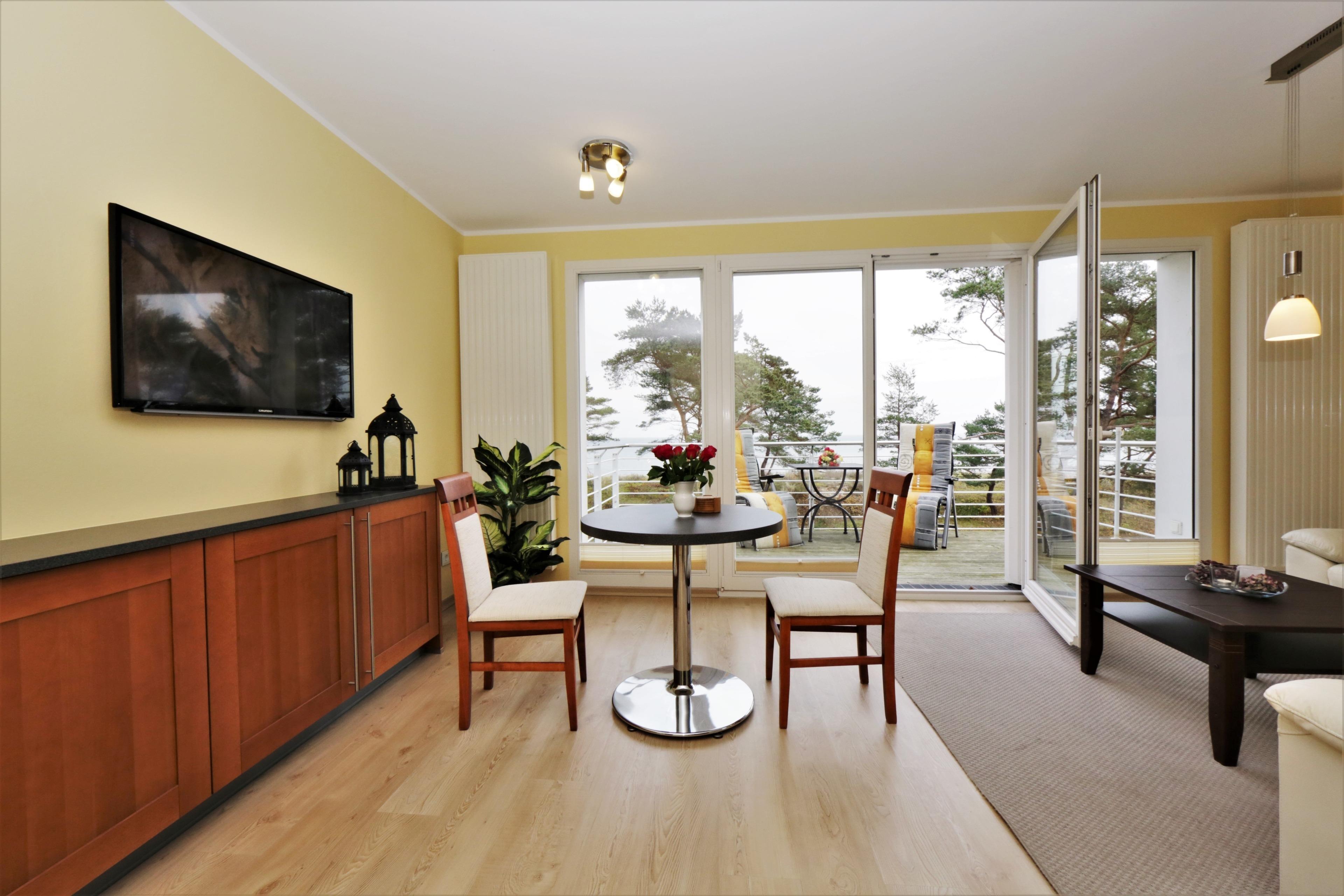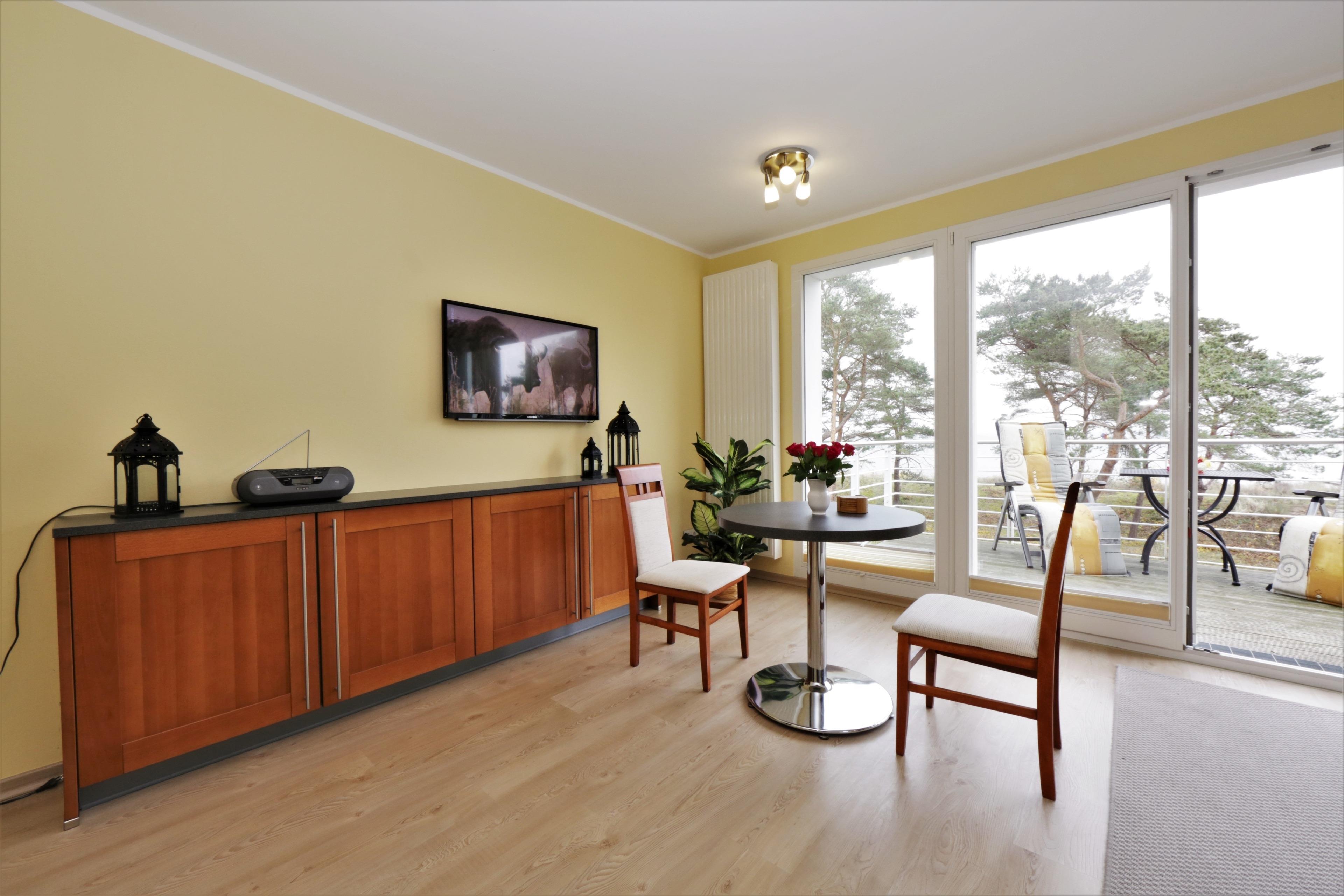 Dieses geschmackvoll eingerichtete 59 qm große Zwei-Zimmer-Appartement befindet sich im 3. Obergeschoss. Das helle Wohnzimmer mit großer Fensterfront zur Ostsee ist mit einem Esstisch, der 2 Personen Platz bietet und einer gemütlichen Couchecke eingerichtet. Flat-TV sowie Radio sind selbstverständlich. Die offene Vollküche ist im Wohnraum integriert und mit Backofen/ Ceranfeld, Kühlschrank, Geschirrspüler, Mikrowelle p.p. ausgestattet. Der große zur Promenade ausgerichtete möblierte Balkon mit herrlichem Seeblick ist vom Wohnraum begehbar. Das Schlafzimmer verfügt über ein Doppelbett und ausreichend Schrankraum. Das Badezimmer ist mit Dusche, Waschbecken, WC und Bidet ausgestattet. Der Pkw-Stellplatz befindet sich auf dem Grundstück und ist der Wohnung zugeordnet. Fahrräder können im Fahrradkeller untergestellt werden.