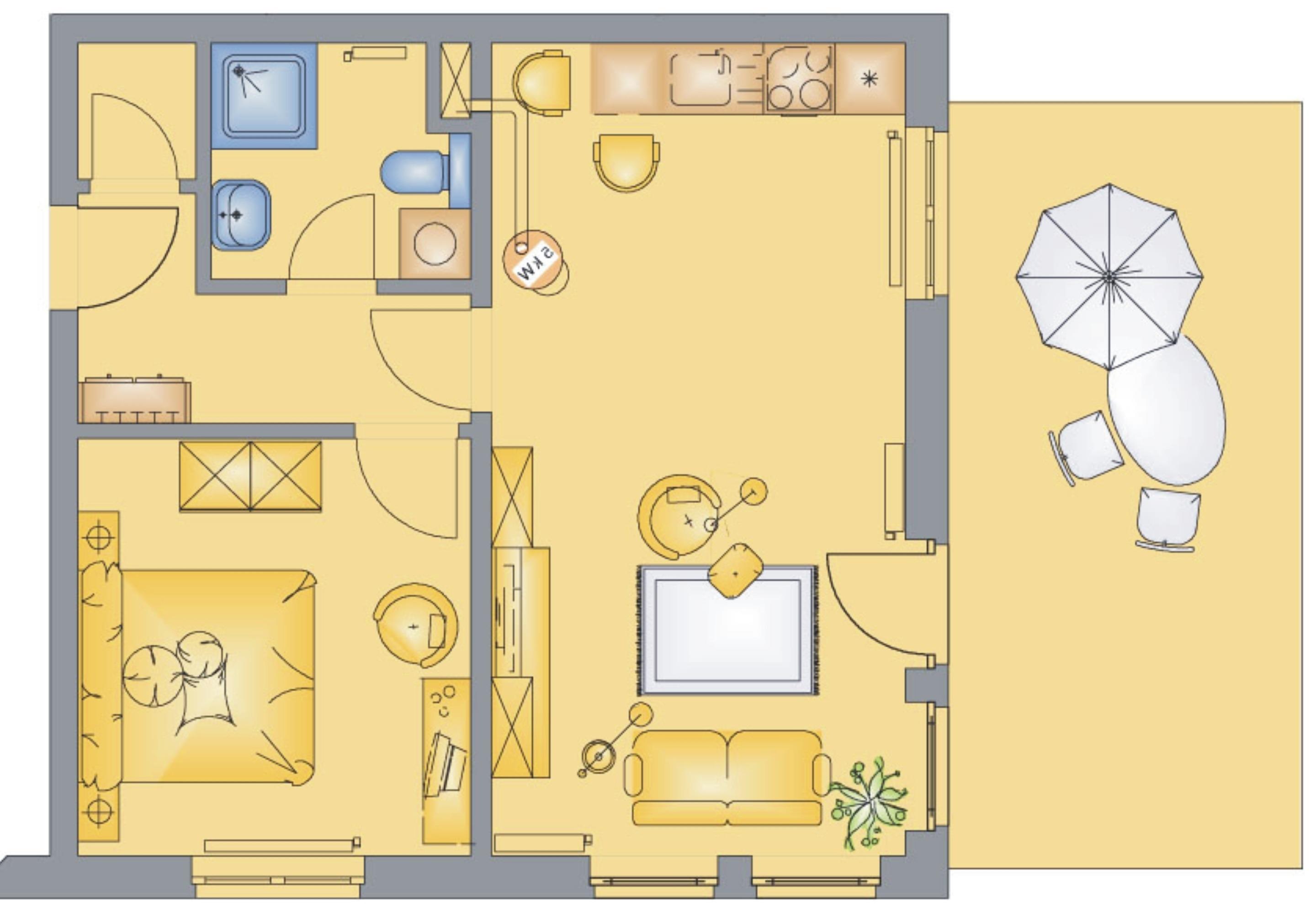 Der hell eingerichtete Wohnraum verfügt über eine gemütliche Sitzecke (mit Schlaffunktion) und einen separaten Essplatz. Eine im Wohnbereich integrierte Küchenzeile mit Geschirrspüler, Backofen, Mikrowelle p.p läßt auch für den Hobbykoch keine Wünsche offen. Das Schlafzimmer ist mit Doppelbett und genügend Schrankraum ausgestattet. Ein Duschbad sowie eine Terrasse runden diese Wohnung ab. TV und Radio stehen zur Nutzung bereit. Der Pkw-Stellplatz befindet sich auf dem Grundstück und ist der Wohnung zugeordnet. Fahrräder können im Keller untergestellt werden.