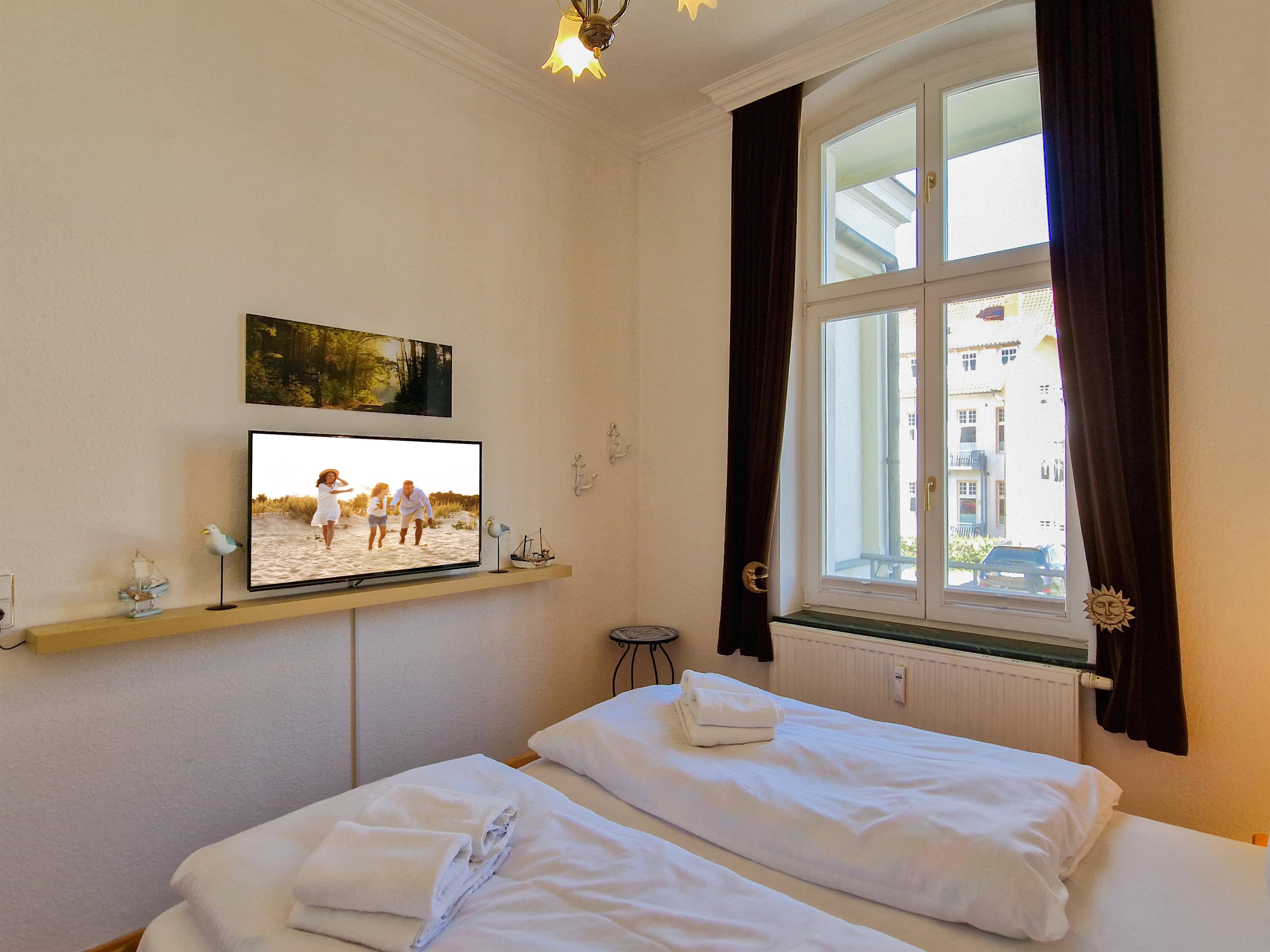 Dieses 45 qm große 2-Zimmer Appartement befindet sich im Erdgeschoss zur Meerseite. Sie können vom Wohnzimmer vorbei an der ersten Häuserreihe einen Blick auf die Ostsee erhaschen. Der Wohnraum ist mit einer gemütlichen Couch mit Schlaffunktion (Liegefläche 140x200) und einem Sessel sowie TV eingerichtet. Ebenfalls im Wohnraum integriert sind eine Küchenzeile inklusive Ceranfeld, Kühlschrank mit Gefrierfach, Geschirrspüler, Mikrowelle mit Grill und Backfunktion sowie ein Essplatz für 3 Personen. Das Schlafzimmer bietet den Gästen ein Doppelbett mit getrennten Matratzen (90 x 200) und einen zusätzlichen TV. Das Bad ist mit Dusche und Waschbecken/WC ausgestattet. Im Keller befinden sich Waschmaschine und Trockner. Der Pkw-Stellplatz befindet sich auf dem Grundstück direkt am Haus.