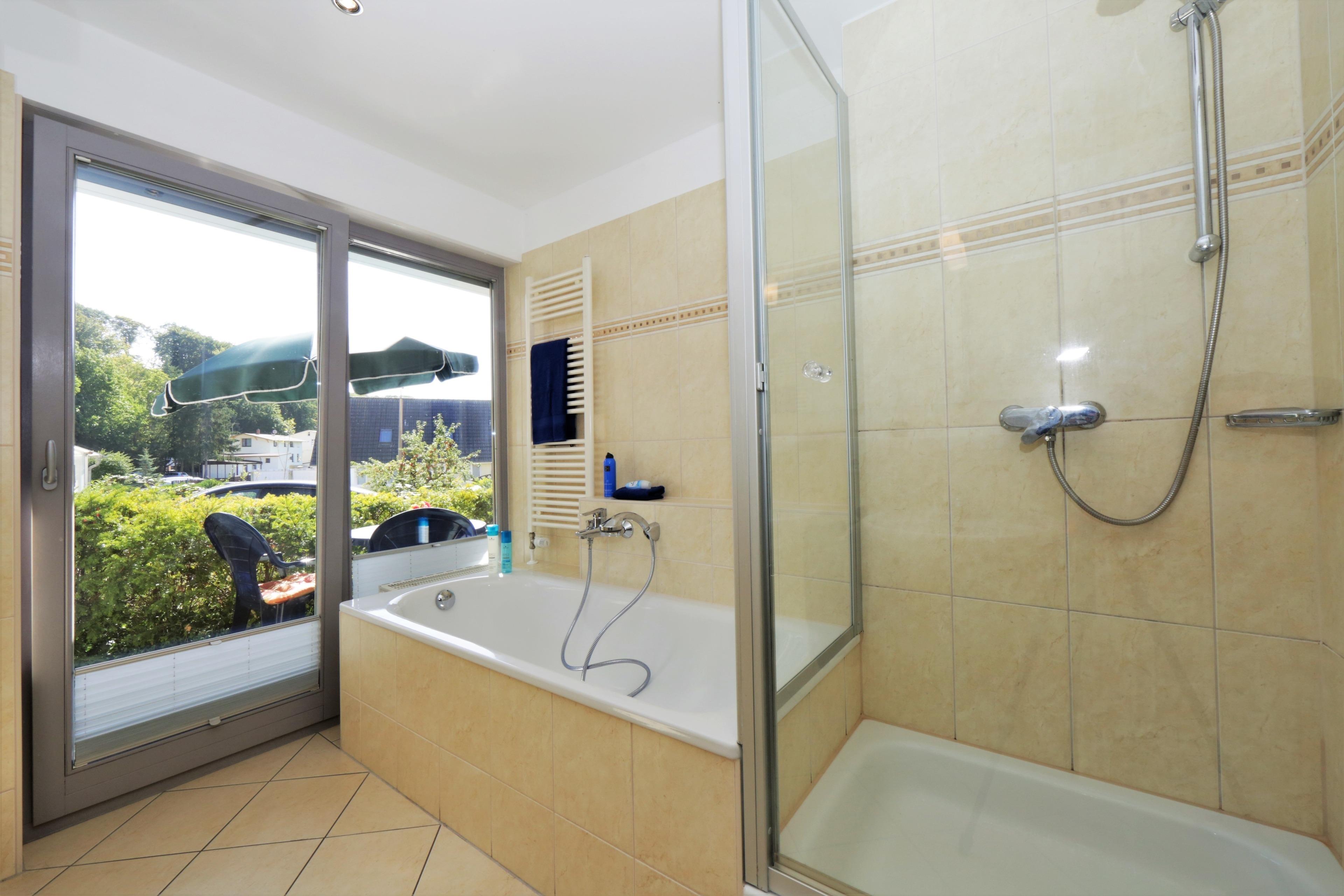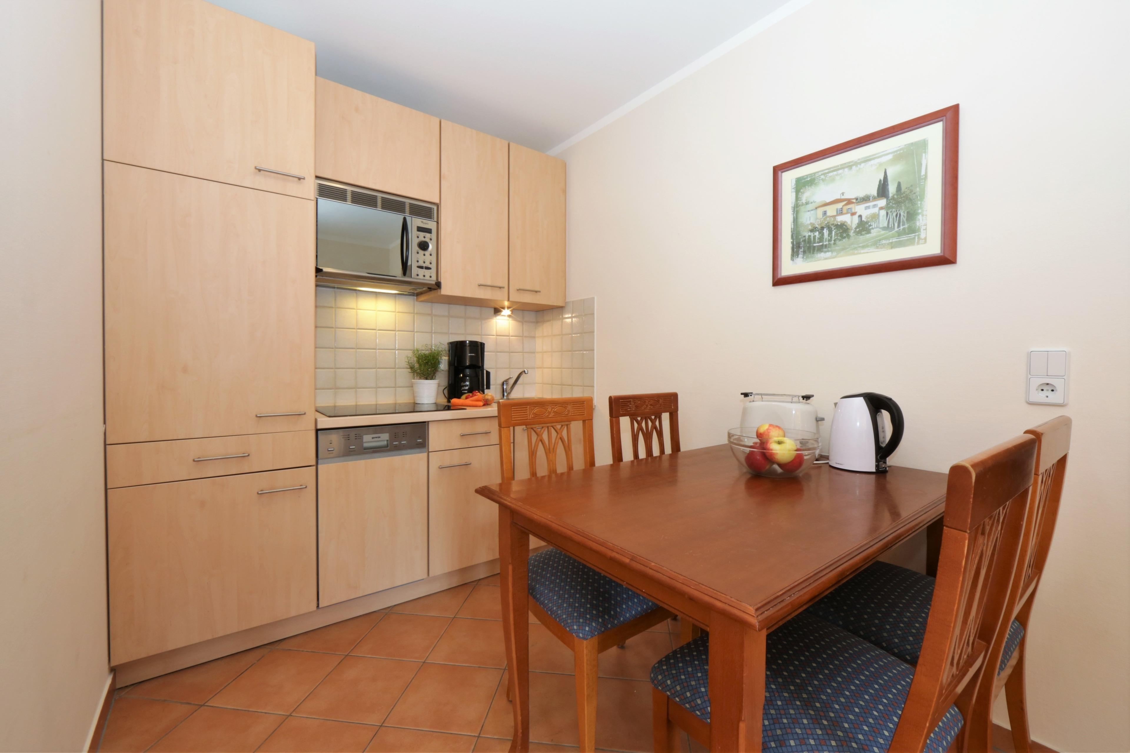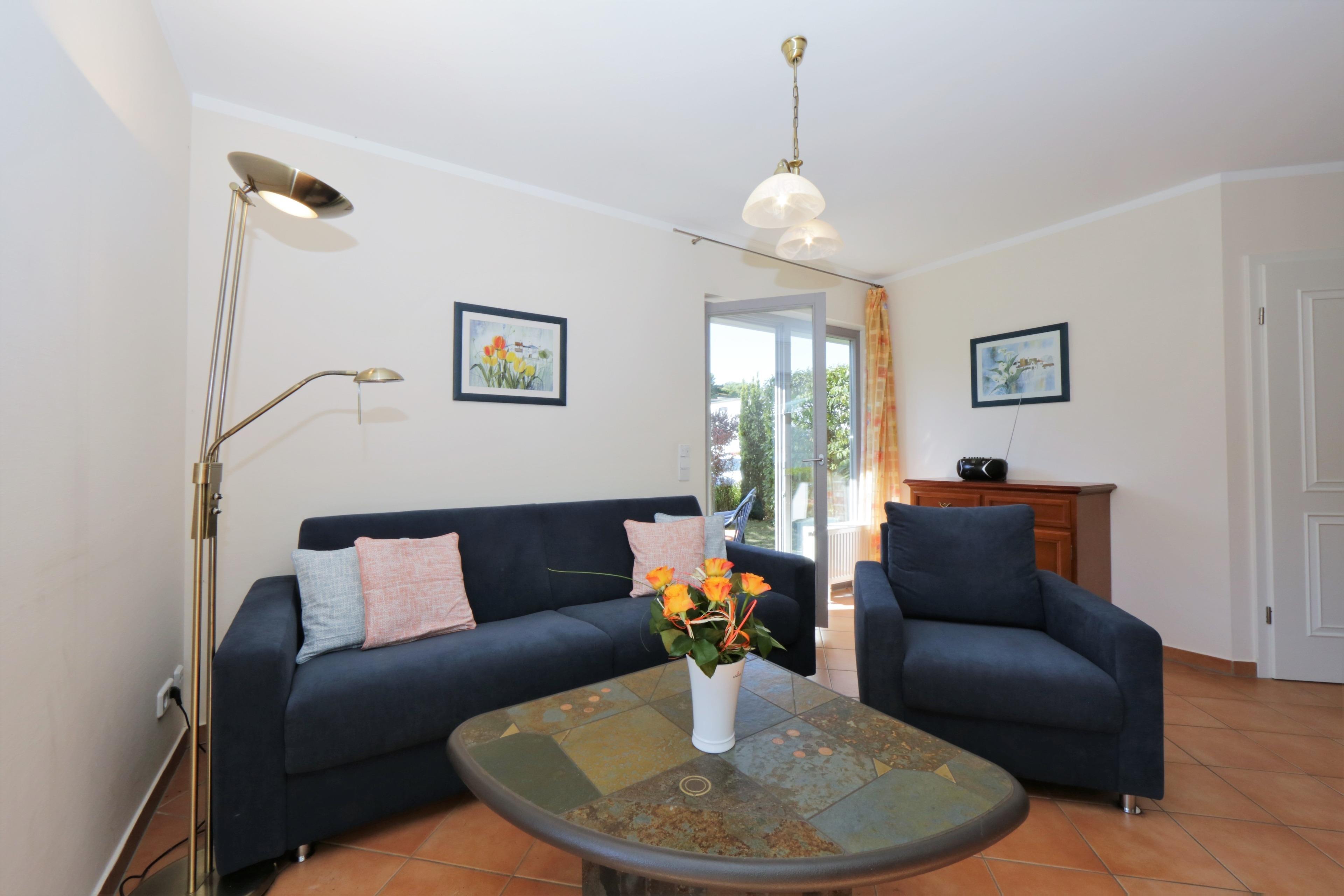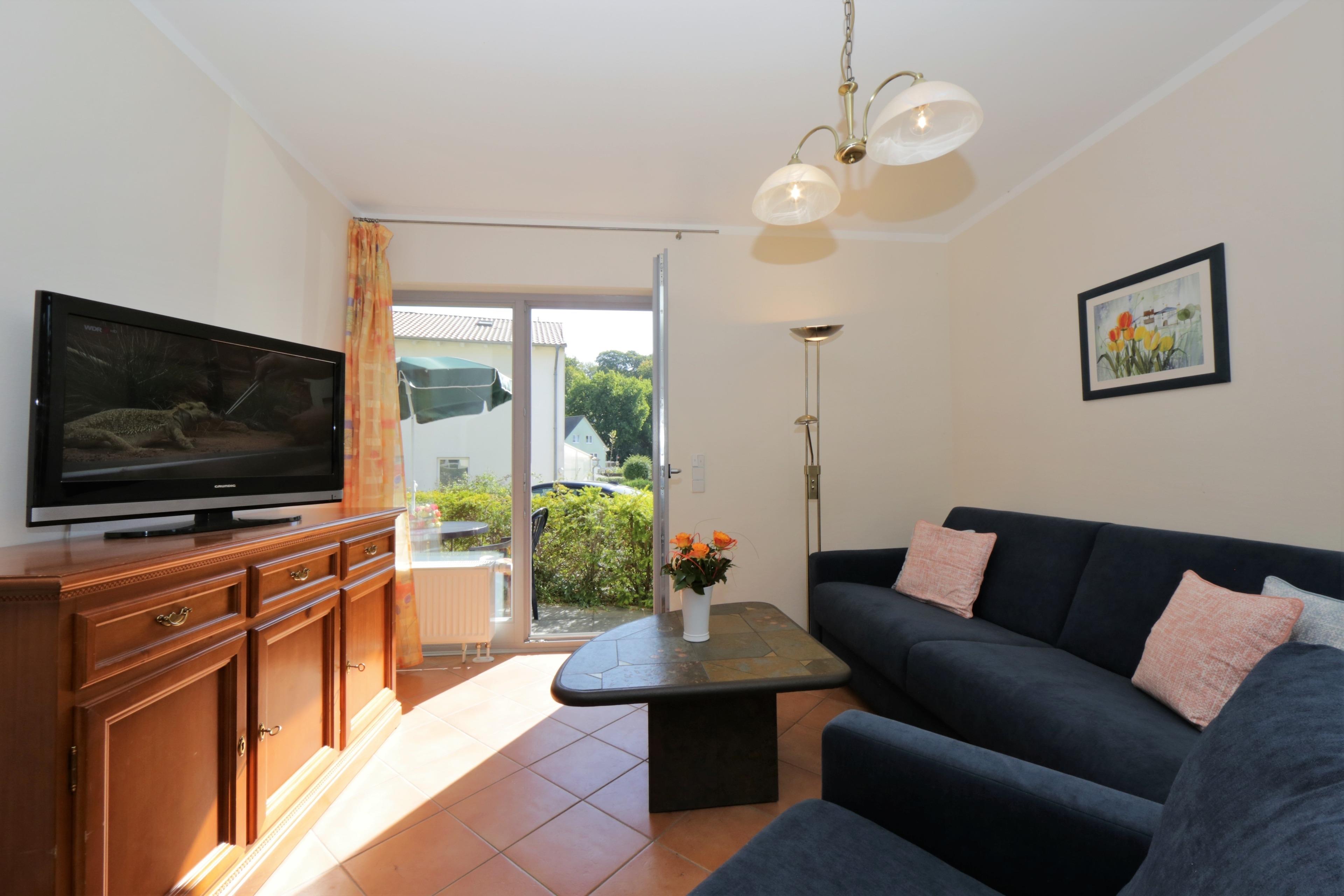 Dieses 62 qm große 3-Zimmer Appartement mit zwei Terrassen befindet sich im Erdgeschoss und eignet sich für 2 bis maximal 5 Personen. Im Wohnzimmer finden Sie eine gemütliche Couchecke mit Radio/TV sowie einen separaten Essplatz. Von hier aus können Sie auch die Terrasse zum Hof/Parkplatz mit südöstlicher Ausrichtung begehen. Die Vollküche mit Geschirrspüler, Cerankochfeld, Mikrowelle etc. ist ebenfalls offen im Wohnraum integriert. Das größere Schlafzimmer ist mit einem Doppelbett mit getrennten Matratzen (90 x 200), Kleiderschrank und Kommoden sowie einem zweiten TV ausgestattet, das kleinere Schlafzimmer mit einem Stockbett und kleinerem Stauraum. Die Terrasse ist zusätzlich vom kleineren Schlafzimmer zu begehen. Das Bad bietet Dusche sowie Badewanne und Doppelwaschbecken, die Toilette befindet sich separat gegenüber. Der Pkw-Stellplatz befindet sich auf dem Grundstück und ist der Wohnung zugeordnet. Im Keller finden Sie einen Fahrrad-Abstellraum, Münzwaschmaschine und Münztrockner.