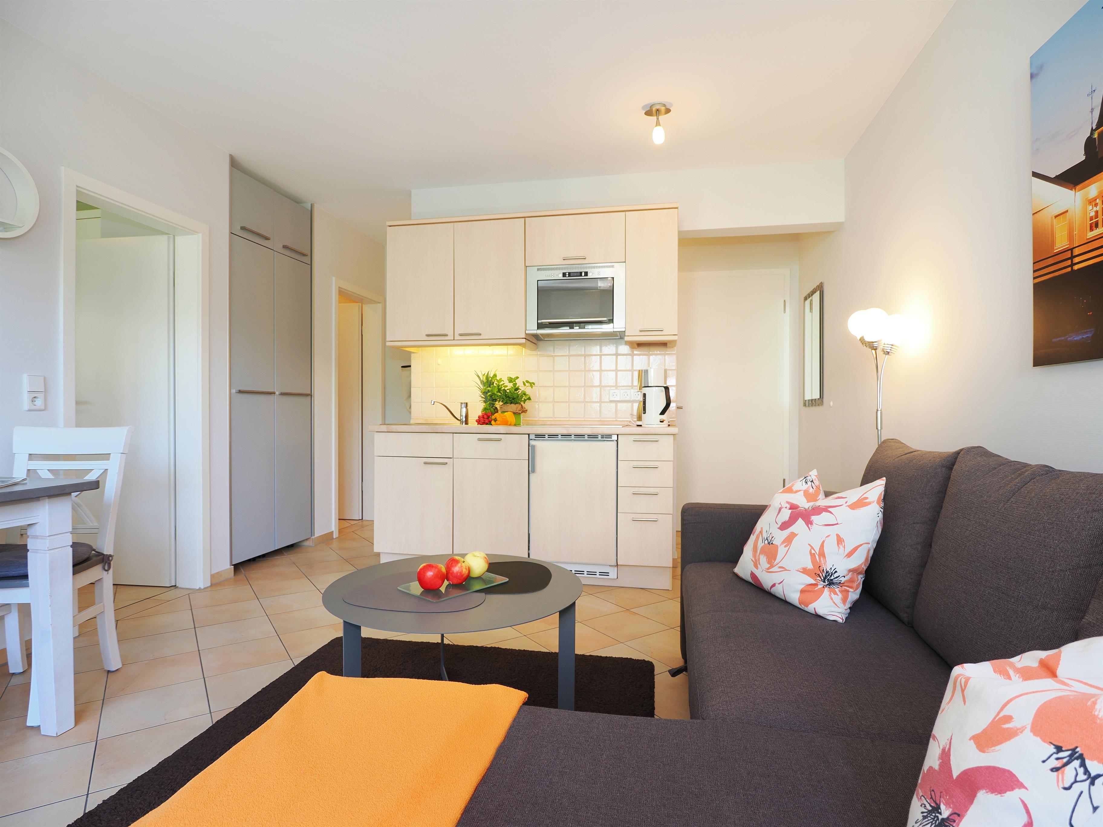 Dieses 37 qm große 2 Zimmer Appartement befindet sich im Hochparterre und ist für 2 Personen und max. ein Kind geeignet. Der geschmackvoll eingerichtete Wohnraum ist mit seiner breiten Fensterfront vom Licht verwöhnt und bietet den Gästen eine gemütliche Eckcouch mit Schlaffunktion (Liegefläche 140 x 185) zum Entspannen. Flat-TV und Radio sind selbstverständlich. Der Essplatz sowie die Küchenzeile incl. Geschirrspüler, Kühlschrank, Mikrowelle, Cerankochfeld etc. befinden sich ebenfalls im Wohnraum. Den Balkon in westlicher Ausrichtung können die Gäste vom Wohnraum begehen. Das Schlafzimmer ist mit einem Doppelbett mit getrennten Matratzen (80 x 200) und reichlich Schrankraum eingerichtet. Im modernen hochwertigen Bad steht den Gästen eine Dusche sowie Waschtisch/WC zur Verfügung. Im Keller finden Sie eine Sauna, einen Fahrradraum, Waschmaschine und Trockner. Der Pkw-Stellplatz befindet sich auf dem abgeschlossenen Grundstück und ist der Wohnung zugeordnet.