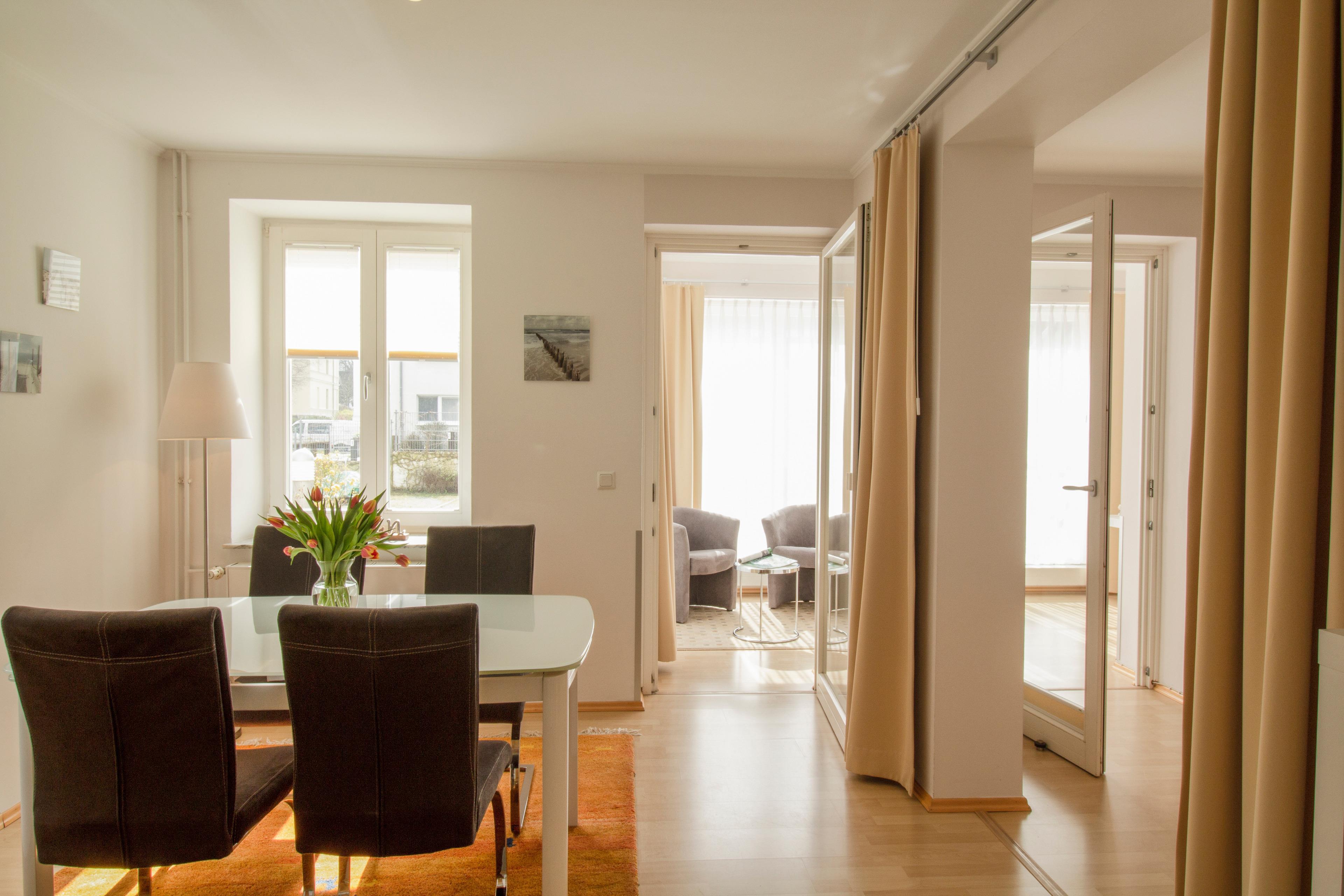 Dieses gemütliche Appartement ist 43 qm groß und liegt im Souterrain. Der Wohnbereich mit offener Pantryküche und einem Esstisch ausgestattet. Die angrenzende Loggia (geschlossen, aber Fenster lassen sich öffnen) ist mit einer gemütlicher Couch mit Schlaffunktion (Liegefläche 135 x 200) sowie eine kleinen Sitzecke mit zwei Sesseln und Flat TV eingerichtet. Der an das Wohnzimmer angrenzende, nicht völlig separate Schlafbereich ist mit einem Doppelbett und einem Kleiderschrank ausgestattet. Das Bad ist mit einer Dusche und Waschbecken/WC ausgestattet. Ein Pkw-Stellplatz befindet sich auf dem Grundstück und ist der Wohnung zugeordnet. Waschmaschine, Trockner und Fahrradabstellraum finden Sie im Keller.