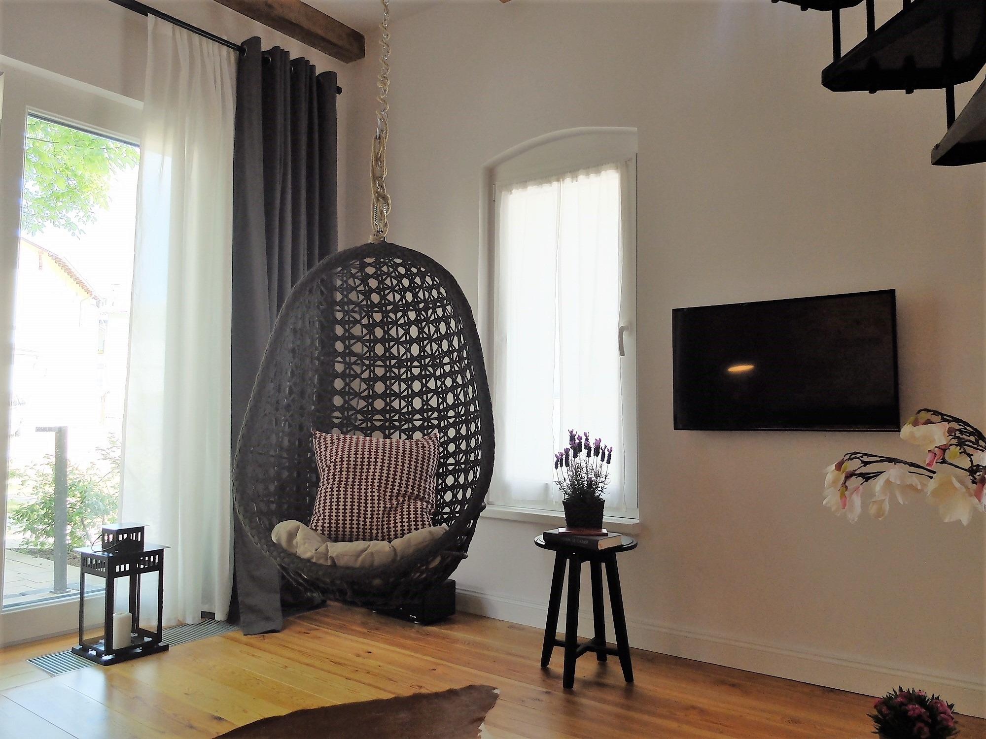 Beim Betreten der Wohnung gelangen Sie direkt in den gemütlichen Wohnbereich im Erdgeschoss, der durch eine durchdachte Raumaufteilung und liebevolle Details besticht. Die Sitzecke mit komfortablem Sofa lädt nach einem erlebnisreichen Tag zum Entspannen ein. Ein besonderes Highlight ist der Hänge-Relaxsessel, der den Raum mit seinem einzigartigen Design aufwertet und gleichzeitig einen idealen Ort bietet, um in Ruhe ein Buch zu lesen oder einfach zu entspannen. Ein moderner Flat-TV sorgt zudem für Unterhaltung und gemütliche Abende. Vom Wohnbereich aus haben Sie direkten Zugang zu einer gemütlichen Terrasse, die nach Westen ausgerichtet ist. Hier können Sie die Abendsonne genießen und bei einem Glas Wein den Tag ausklingen lassen.
