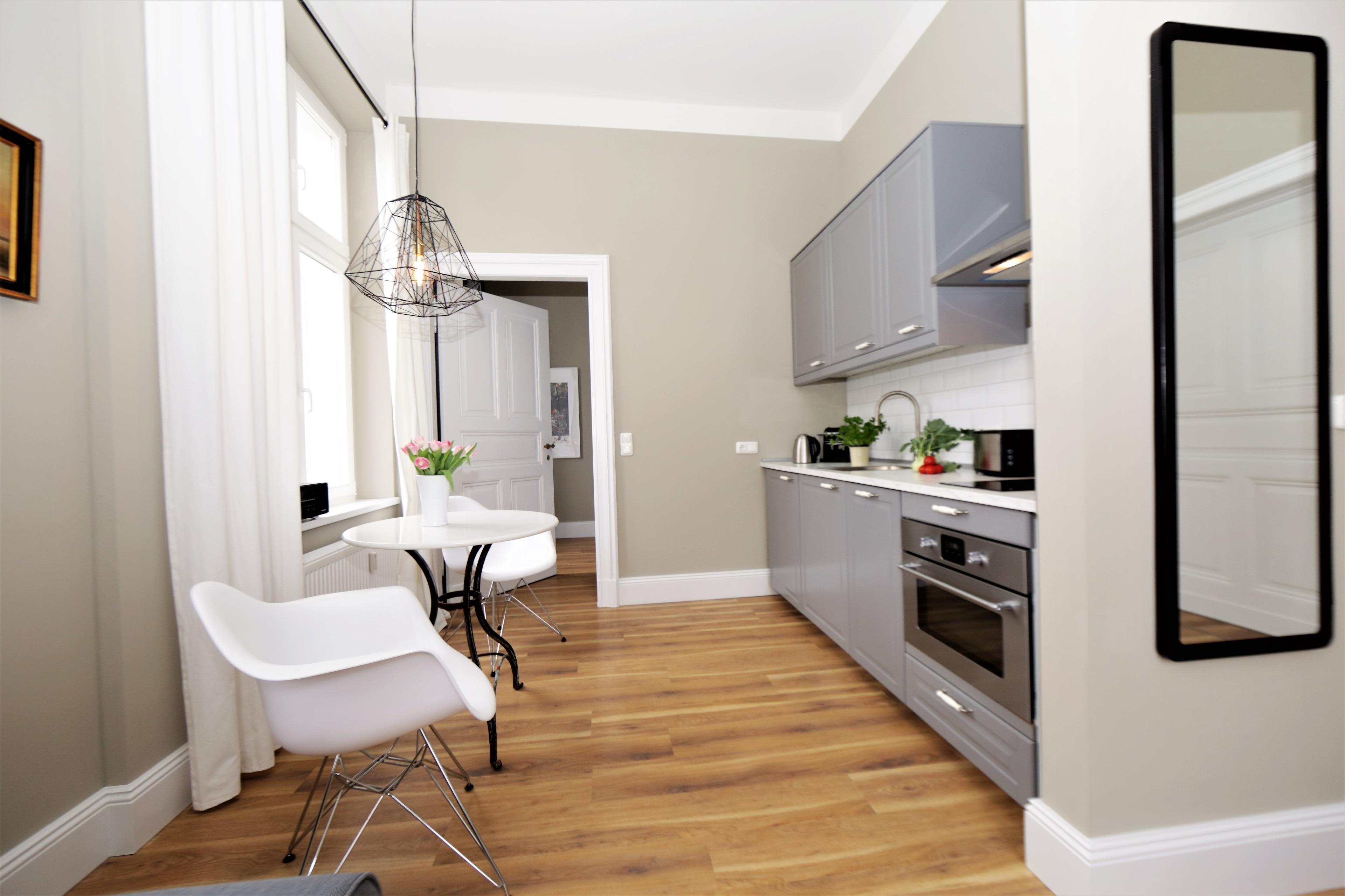 Moderne Einrichtung harmoniert mit dem Charme vergangener Zeiten – hier werden Sie sich wohl fühlen. Mit ihren 34m² ist diese 2-Zimmer-Wohnung perfekt für 2 Personen geeignet. Im hellen Wohnraum finden Sie eine gemütliche Sitzecke mit Flat-TV, Esstisch sowie die moderne Küchenzeile mit 2fach Cerankochfeld, Kühlschrank mit Gefrierfach, Backofen und Geschirrspüler. Das Schlafzimmer bietet Ihnen ein komfortables Boxspringbett sowie ausreichend Schrankraum. Das aufwendig geflieste Duschbad verfügt über einen modernen Waschtisch, ausreichend Aufbewahrungsmöglichkeiten, einem beleuchteten Spiegel und WC.
