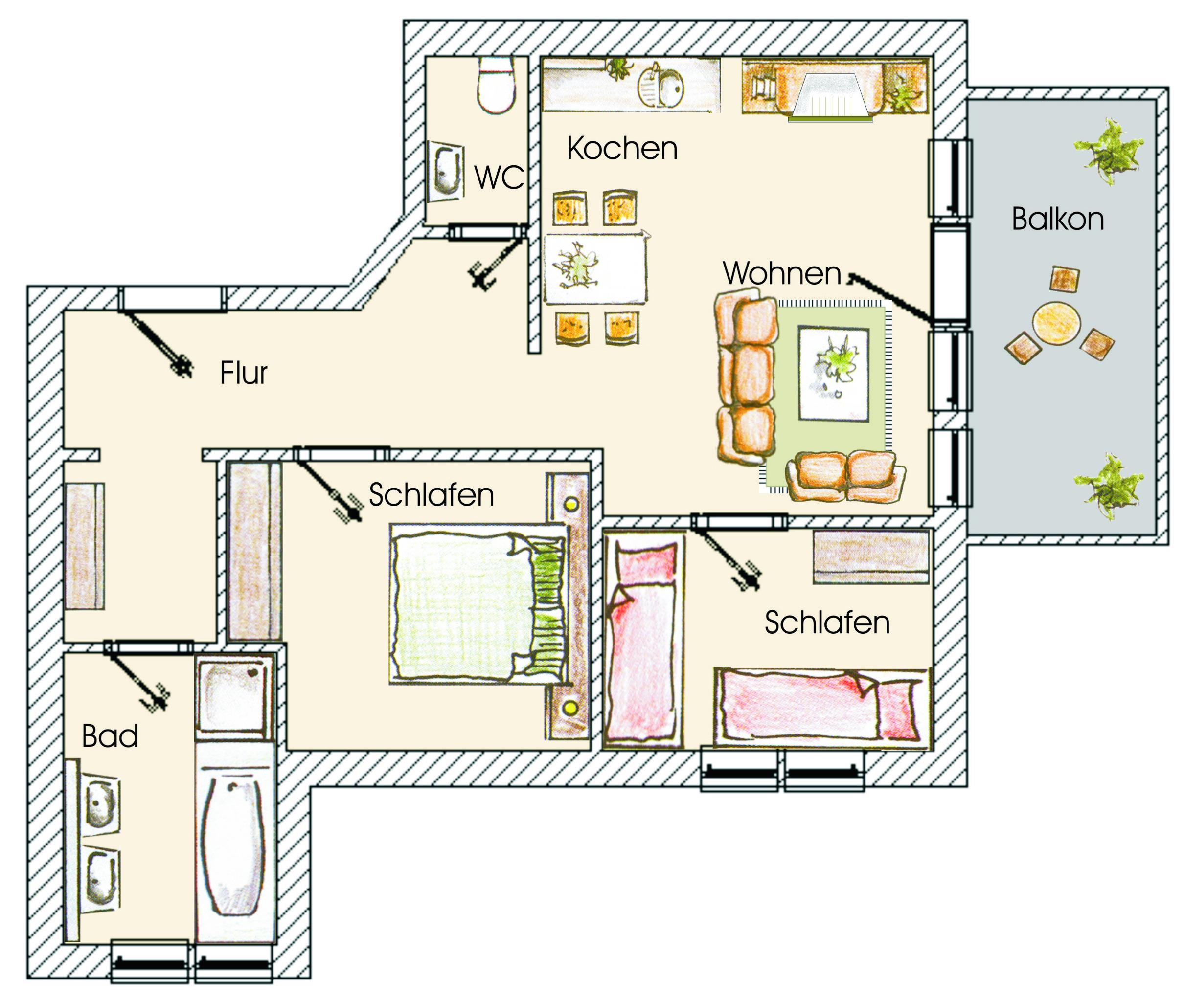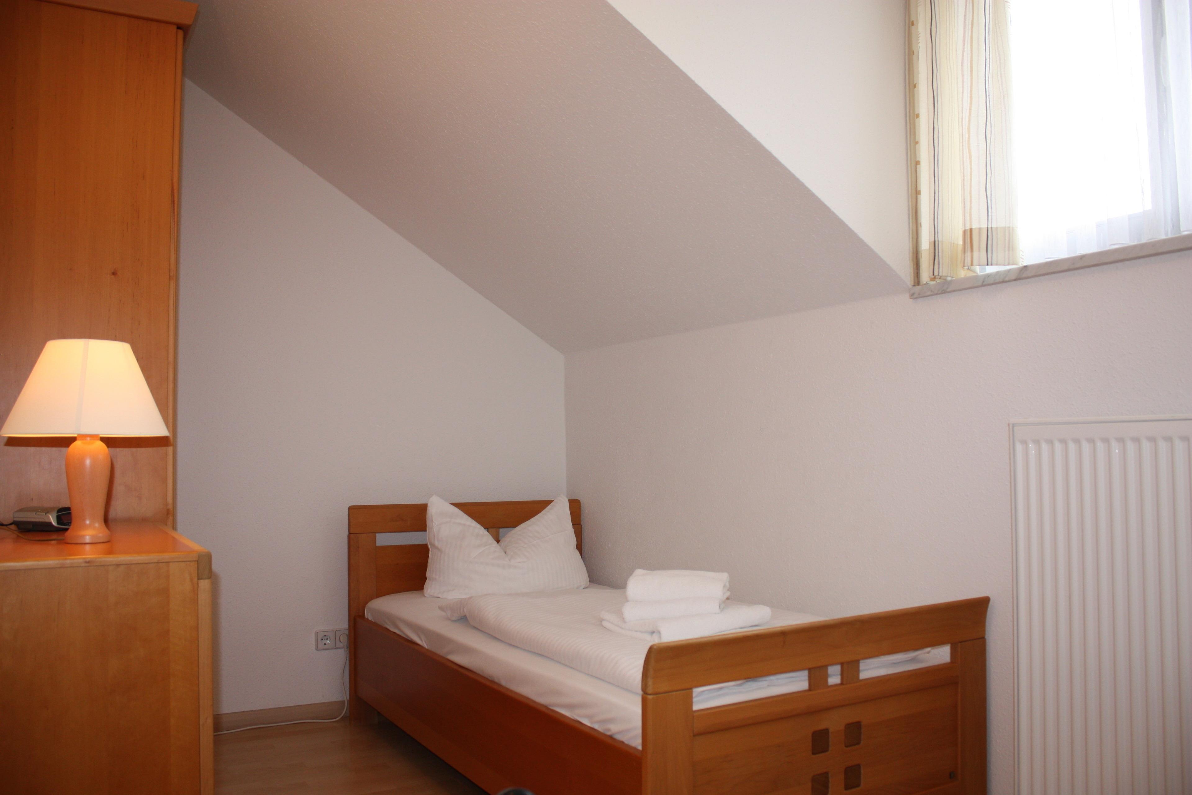 Dieses 57 qm große 3-Zimmer Appartement im 2. Obergeschoss eignet sich für 2 bis maximal 5 Personen. Im Wohnzimmer finden Sie eine gemütliche Couchecke mit Radio/TV, sowie einen separaten Essplatz. Die Vollküche mit Geschirrspüler, 4 Kochplatten, Mikrowelle pp. ist ebenfalls offen im Wohnraum integriert. Der zum Süden ausgerichtete Balkon ist vom Wohnraum zu begehen. Das größere Schlafzimmer mit zusätzl. TV ist mit einem Doppelbett mit getrennten Matratzen, das kleinere mit zwei Einzelbetten jeweils 0,90 x 2,00 m und einem Kleiderschrank ausgestattet. Die 5. Person findet ihren Schlafplatz auf dem Sofa. Das Bad bietet Dusche sowie Badewanne und einen Doppelwaschtisch. Das WC mit Waschgelegenheit ist separat. Der Pkw-Stellplatz befindet sich auf dem Grundstück und ist der Wohnung zugeordnet. Im Keller finden Sie einen Fahrrad-Abstellraum, Münzwaschmaschine und Münztrockner.