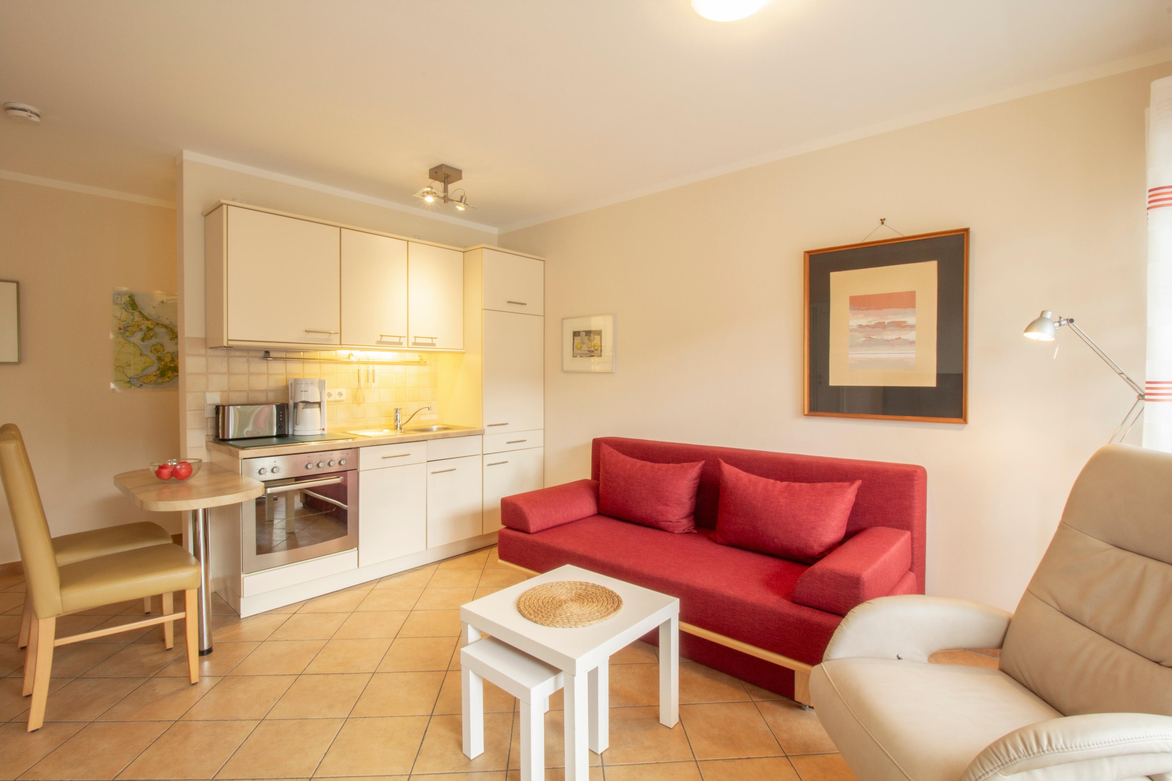 Diese liebevoll eingerichtete Zwei Zimmerwohnung ist 37 qm groß und liegt im 1. Obergeschoss. Der lichtdurchflutete Wohnraum mit seiner breiten Fensterfront ist mit einem Sofa, dass gleichzeitig die dritte Schlafgelegenheit bietet und einem Relaxsessel eingerichtet. Flat TV sowie Radio mit CD-Player sind selbstverständlich. Die Küchenzeile incl. Geschirrspüler, Kühlschrank, Cerankochfeld, Backofen p.p. und der angrenzende Essplatz sind ebenfalls offen im Wohnraum integriert. Das Schlafzimmer ist mit einem Doppelbett mit getrennten Matratzen (90x200) und einem Kleiderschrank eingerichtet. Das moderne Bad ist mit einer ebenerdigen Dusche sowie Waschtisch/WC ausgestattet. Ein Balkon zum Westen, der vom Wohnraum begehbar ist, rundet diese Wohnung ab. Im Keller finden Sie eine Sauna, die im Winterhalbjahr kostenfrei genutzt werden kann. Einen Fahrradraum und einen Waschraum mit Waschmaschine und Trockner steht den Gästen ebenfalls zur Nutzung zur Verfügung. Der Pkw-Stellplatz befindet sich auf dem abgeschlossenen Grundstück und ist der Wohnung zugeordnet.