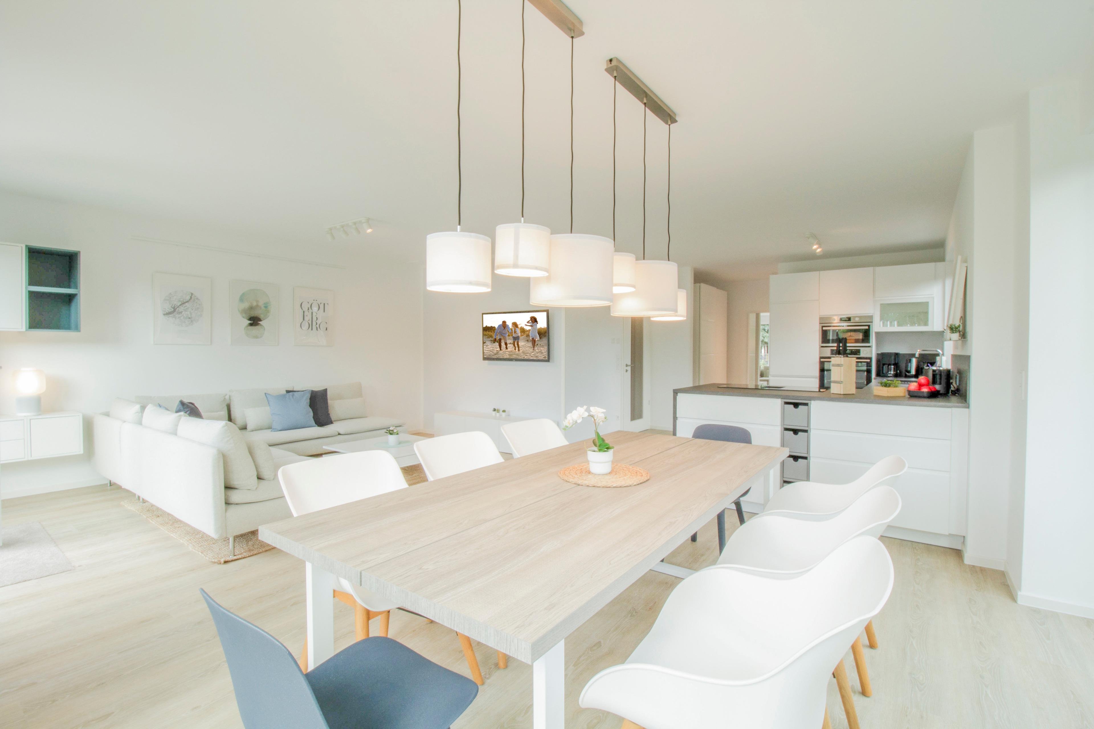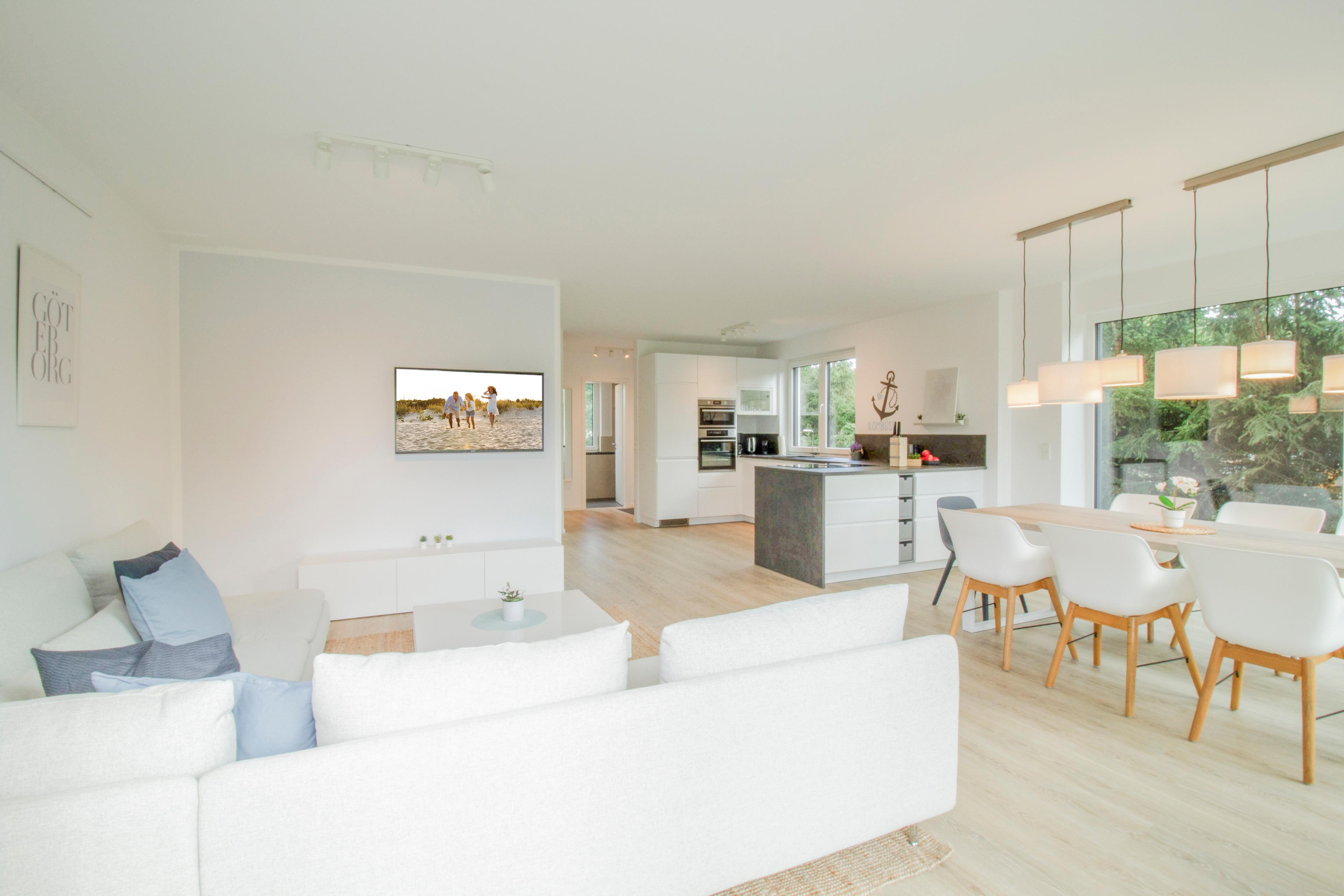 Herzlich willkommen in unserem exquisiten Ferienhaus "Up de Insel", einem wahrhaft modernen Rückzugsort für Ihre kommende Auszeit! Mit großzügigen 140 m2 Wohnfläche auf einem weitläufigen 1000 m2 Grundstück ist dieses neugebaute Domizil der Inbegriff von Luxus, Stil und Komfort. Schon beim Betreten dieser Oase wird Ihnen die hochmoderne, lichtdurchflutete Einrichtung ins Auge fallen, die eine einladende und entspannende Atmosphäre schafft. Die Klimaanlage in allen Räumen sorgt dafür, dass Sie stets eine angenehme Raumtemperatur genießen können, unabhängig von der Witterung. Der weitläufige Wohn- und Essbereich ist das Herzstück der Wohnung. Ein großer Esstisch für bis zu 8 Personen lädt zu gemeinsamen Mahlzeiten und geselligem Beisammensein ein. Ein gemütliches Ecksofa und ein Flachbildfernseher sorgen für unterhaltsame Abende. Die moderne Küche ist komplett ausgestattet und verfügt über einen großzügigen Geschirrspüler, Backofen, Mikrowelle und einem Induktionskochfeld mit integriertem Abzug. Hier können Sie Ihre kulinarischen Fähigkeiten entfalten und sich wie zu Hause fühlen. Vom Wohnbereich gelangen Sie auf die großzügige Terrasse, die von einem liebevoll gepflegten Garten umgeben ist. Hier finden Sie auch einen Elektrogrill, der perfekt für entspannte Grillabende im Freien ist. Die Saunaliebhaber unter Ihnen werden die Fasssauna lieben, die nach einem erlebnisreichen Tag pure Entspannung verspricht. Im Obergeschoss und im Studio unter dem Dach erwarten Sie vier wundervolle Schlafzimmer – drei mit gemütlichen Boxspringbetten (1,60 m x 2 m) und eines mit zwei Einzelbetten (0,90 m x 2 m) – alle liebevoll gestaltet, um Ihnen erholsame Nächte zu bescheren. Für Ihr absolutes Wohlbefinden stehen zwei Badezimmer zur Verfügung. Das großzügige Obergeschoss beherbergt ein luxuriöses Badezimmer mit ebenerdiger Dusche, einer großzügigen Badewanne und einem Doppelwaschtisch. Im Erdgeschoss finden Sie ein weiteres Bad mit Dusche für zusätzlichen Komfort. Für Ihre Fahrzeuge stehen zwei komfortable Parkplätze zur Verfügung. Wenn Sie die Region gerne auf zwei Rädern erkunden, bieten wir Ihnen die Möglichkeit, Ihre Fahrräder und E-Bikes in einem modern gestalteten Container sicher aufzubewahren und aufzuladen.