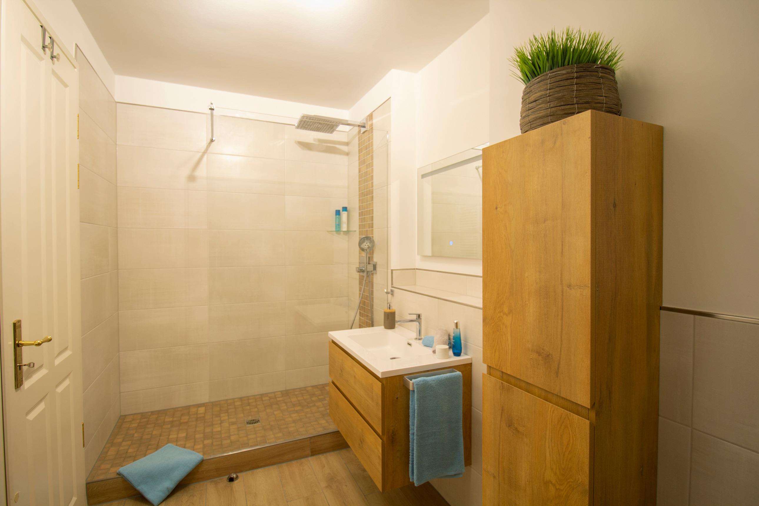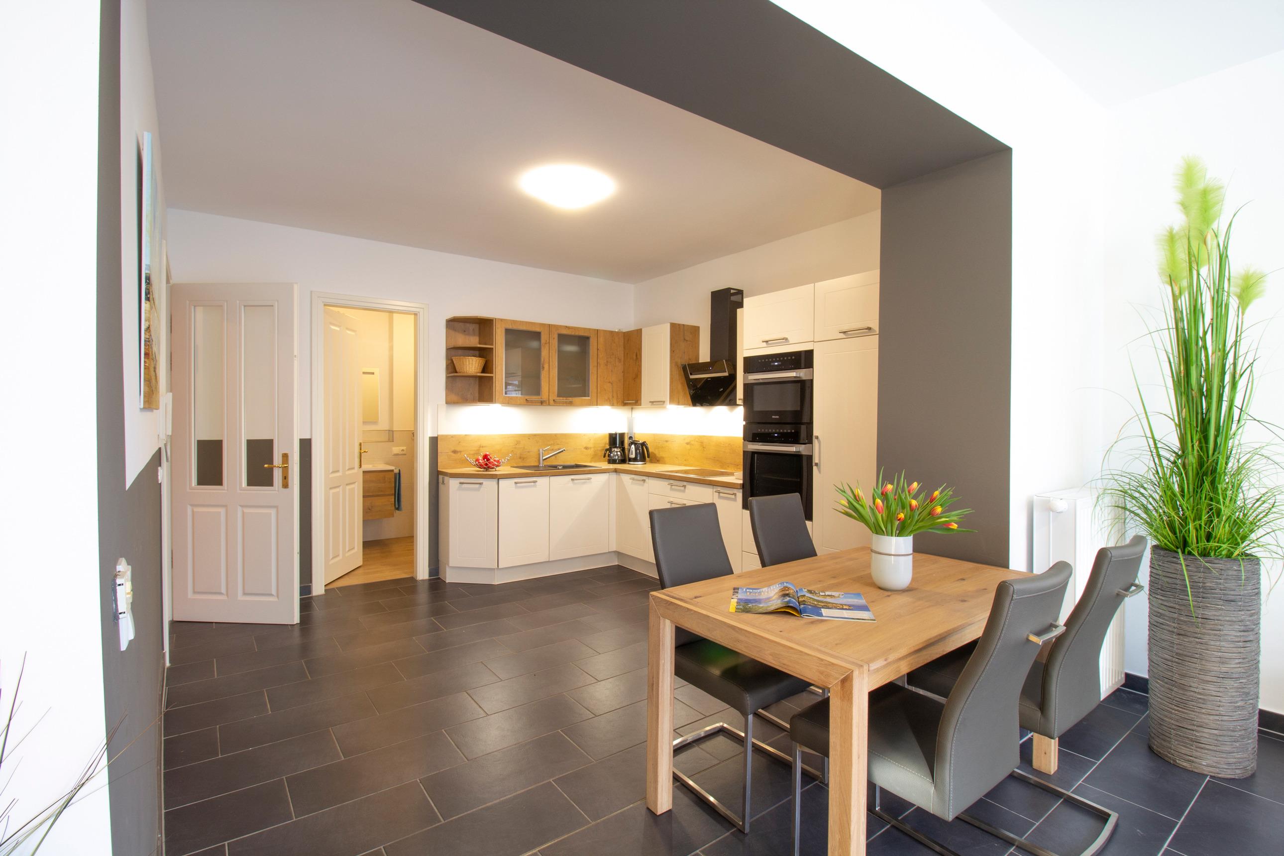 Die Wohnung Nr. 1 liegt auf der Rückseite des Hauses im nach Süden ausgerichteten Souterrain. Eine große Fensterfront fängt viel Tageslicht für den offenen und großzügigen Wohnbereich ein. Die sehr schöne Terrasse lädt mit ihren komfortablen Gartenmöbeln zum Verweilen ein und verlängert so das Wohnzimmer nach draußen. Mit der voll ausgestatteten Küche können Sie sich und Ihre Familie verwöhnen und am gemütlichen Esstisch gemeinsame Mahlzeiten oder Spieleabende verbringen. Das modern sanierte Bad verfügt über eine große Dusche, Waschtisch und Waschmaschine. In zwei Schlafzimmern finden, in den gemütlichen Doppelbetten, bis zu vier Personen viel Platz.