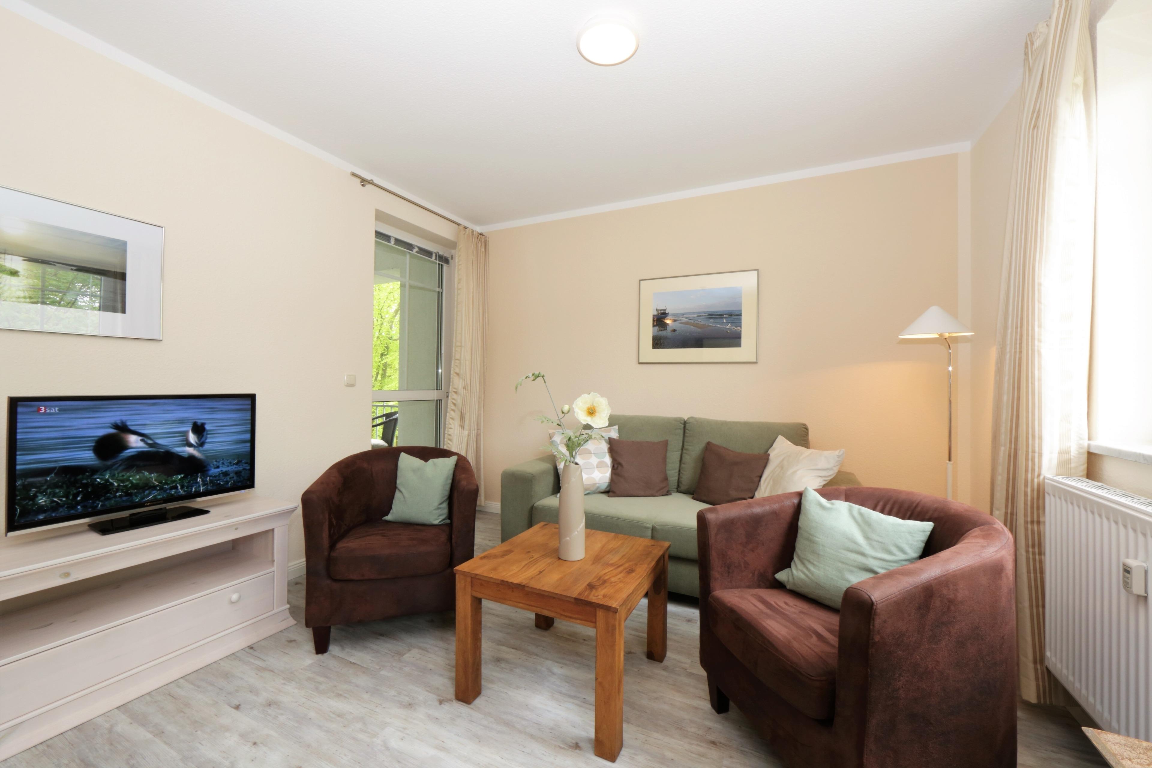 Dieses 45 qm große gemütliche Zwei-Zimmer-Appartement befindet sich im 2. Obergeschoss und bietet Ihnen einen schönen Blick in den Buchenpark von Heringsdorf. Im Wohnraum steht den Gästen ein Sofa und zwei Sessel sowie ein Essplatz für gemeinsame Mahlzeiten zur Verfügung. Ein Flat-TV ist selbstverständlich. Die im Wohnraum offen integrierte Einbauküche mit Fenster verfügt über ein Cerankochfeld, Geschirrspüler, Kühlschrank mit Gefrierfach sowie Backofen mit Mikrowellenfunktion. Das Schlafzimmer ist mit einem Doppelbett und ausreichend Schrankraum ausgestattet. Den geschützten Balkon zum Süden können Sie über das Wohn- als auch das Schlafzimmer betreten Das innenliegende Bad ist mit einer Dusche 80x110 und Waschtisch/WC ausgestattet. Ein Pkw-Stellplatz befindet sich auf dem Nachbargrundstück. Zum Be- und Entladen steht ein Platz vor dem Haus zur Verfügung.
