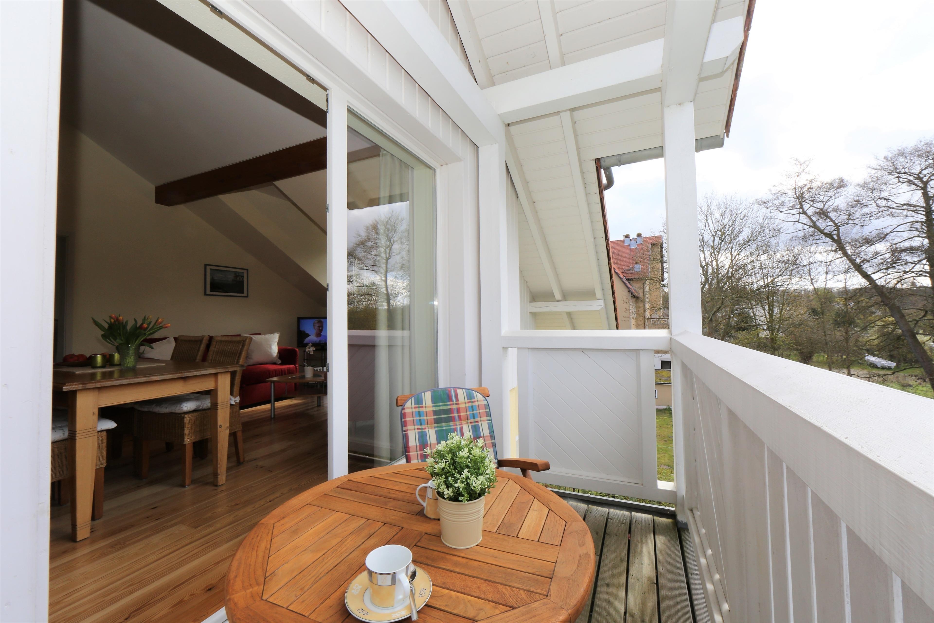 Dieses gemütliche Zwei-Zimmer-Appartement für 2-4 Personen befindet sich im 2. Obergeschoss. Der großzügige Wohnraum ist mit einem Essplatz für 4 Personen sowie einer Couch (mit Schlaffunktion), Sesseln, Couchtisch und Flat eingerichtet. Der zum Hof gehende größere Balkon in südlicher Ausrichtung ist vom Wohnzimmer zu begehen. Die im Wohnraum integrierte offene Vollküche ist gut ausgestattet und verfügt über einen Backofen mit Ceran-Kochfeld, Geschirrspüler, Mikrowelle, Kühlschrank, Kaffeemaschine etc. Das Schlafzimmer ist mit einem Doppelbett mit getrennten Matratzen (90x200) und ausreichend Schrankraum eingerichtet. Im großzügigen Bad finden Sie sowohl eine Badewanne als auch eine Dusche, Waschtisch und WC. Eine Waschmaschine steht den Gästen in der Küche zur Verfügung. Ein Pkw-Stellplatz befindet sich auf dem Grundstück und ist der Wohnung zugeordnet, die Fahrräder können die Gäste in einem vorgesehenen Schuppen verschließen.