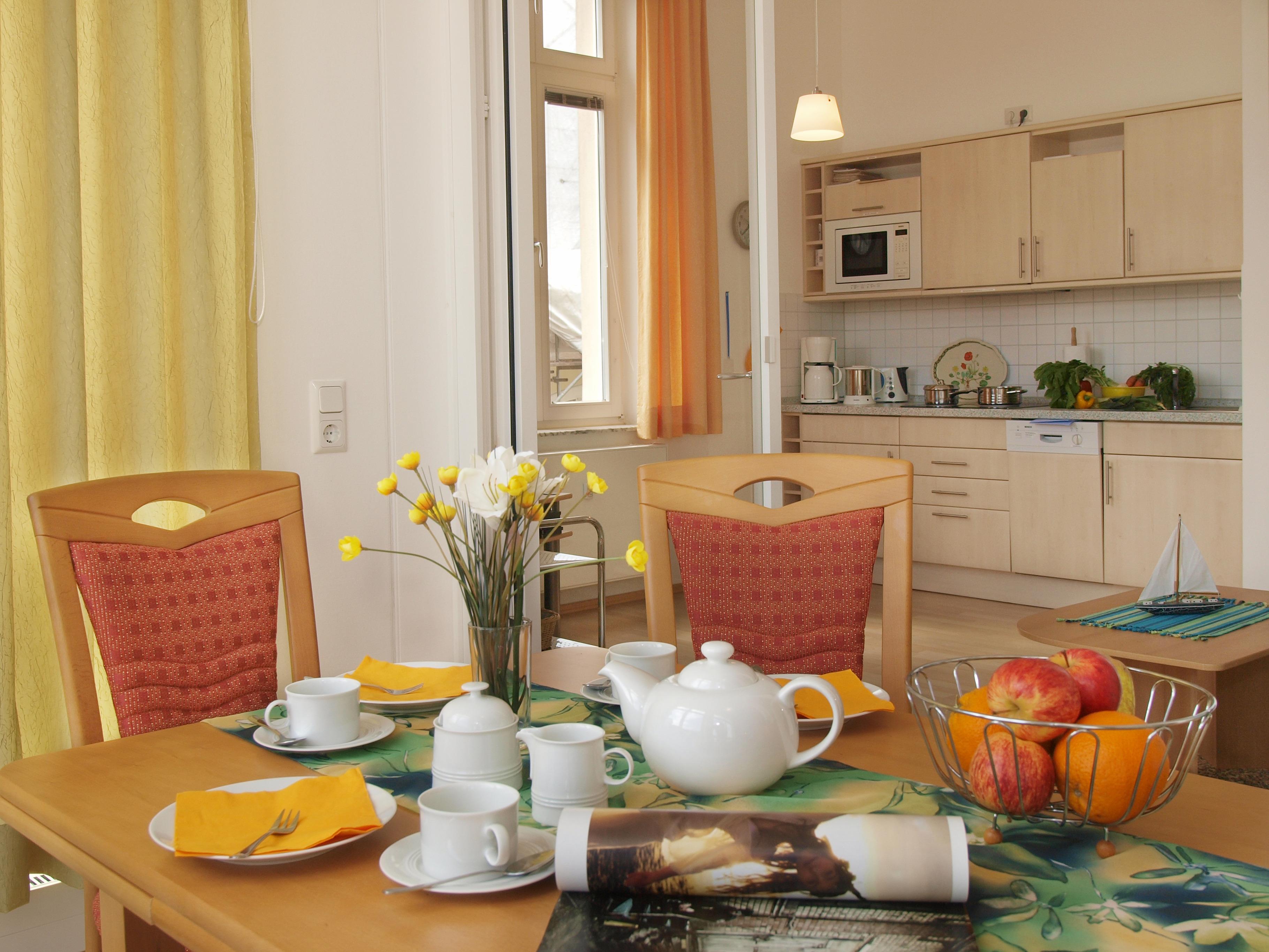 Dieses 58 qm große 2-Zimmer-Appartement befindet sich im 1. Obergeschoss und eignet sich für 2-3 Personen. Der großzügige Wohnraum in östlicher Ausrichtung beherbergt eine gemütliche Sitzgruppe mit Schlaffunktion (Liegefläche 150 x 200). Ein Flat-TV ist selbstverständlich. In der lichtdurchfluteten, geschlossenen Loggia (Fenster lassen sich öffnen) mit östlicher Ausrichtung lädt ein Essplatz zu gemeinsamen Mahlzeiten ein. Die Einbauküche inkl. Cerankochfeld, Geschirrspüler, Kühlschrank, Mikrowelle etc. ist offen im Wohnraum integriert. Das Schlafzimmer, ist mit einem Doppelbett mit getrennten Matratzen (90 x 200) sowie genügend Schrankraum eingerichtet. Das Bad ist mit Dusche und Waschbecken/WC ausgestattet. Ein Pkw-Stellplatz befindet sich auf dem Grundstück und ist der Wohnung zugeordnet. Waschmaschine, Trockner und Fahrradabstellraum finden Sie im Keller.