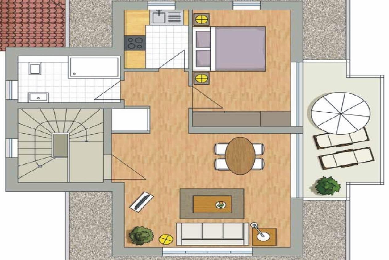 Dieses gemütliche Zwei-Zimmer-Appartement ist 57 m² groß und befindet sich im Staffelgeschoss. Hier können zwei Personen einen entspannten Inselurlaub verleben. In diesem Appartement wurde besonderer Wert auf die Verwendung natürlicher Materialien gelegt. Der lichtdurchflutete Wohnraum ist mit einer bequemen Couch, Sessel, Couchtisch und TV sowie einem Essplatz eingerichtet. Der große Balkon in südlicher Ausrichtung ist vom Wohnraum begehbar und verspricht erholsame Sonnenstunden und gemütliche Mahlzeiten im Freien. Die separate Vollküche mit Fenster verfügt über Geschirrspüler, Kochfeld, Backofen, Kühlschrank etc. Das Schlafzimmer ist mit einem Doppelbett mit getrennten Matratzen (90 x 200) und ausreichend Schrankraum sowie einem zusätzlichen TV ausgestattet und grenzt ebenfalls an den Balkon. Im Bad steht den Gästen eine Dusche und Waschbecken/WC zur Verfügung. Ein Pkw-Stellplatz befindet sich auf dem Grundstück und ist der Wohnung zugeordnet.