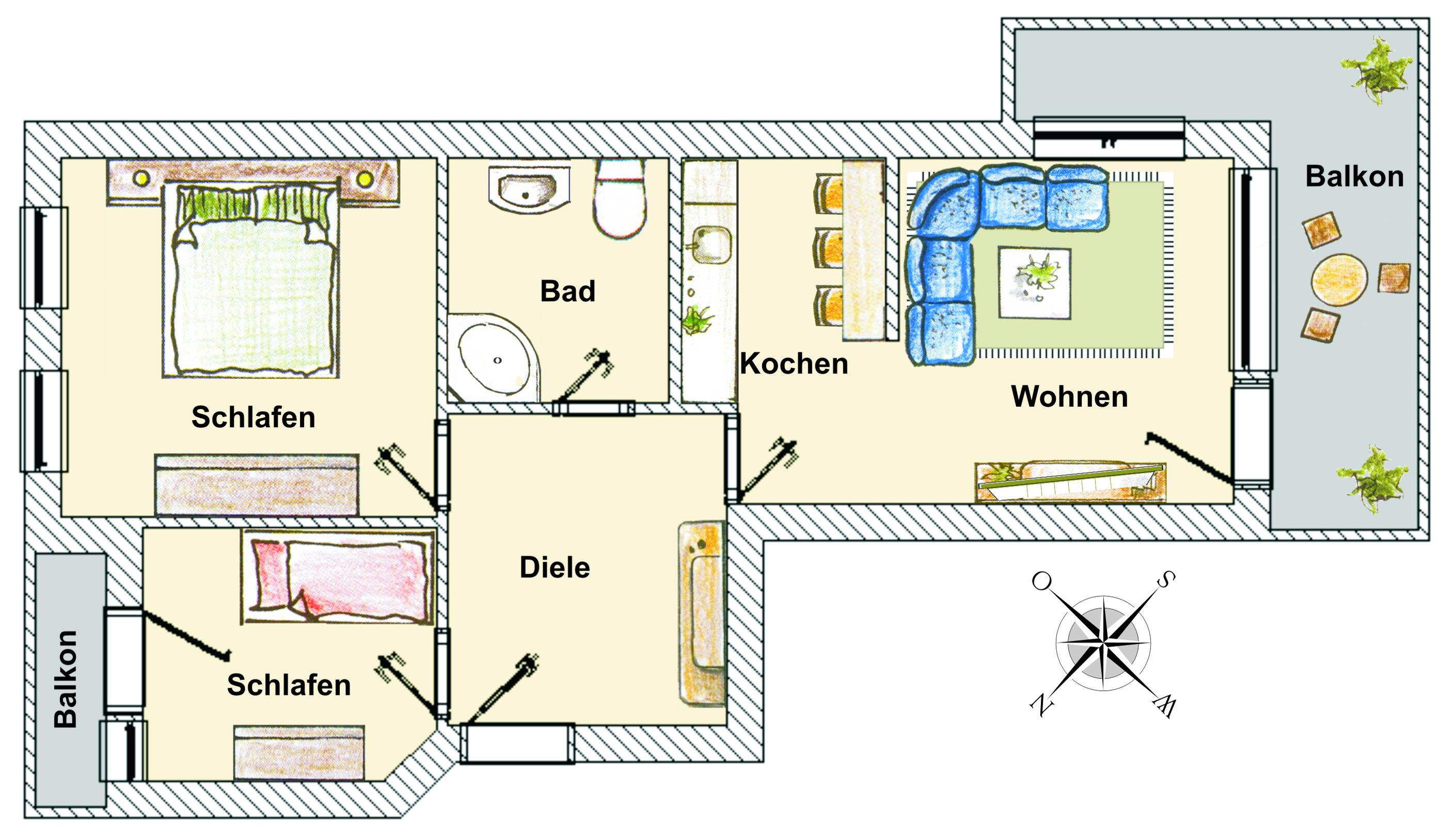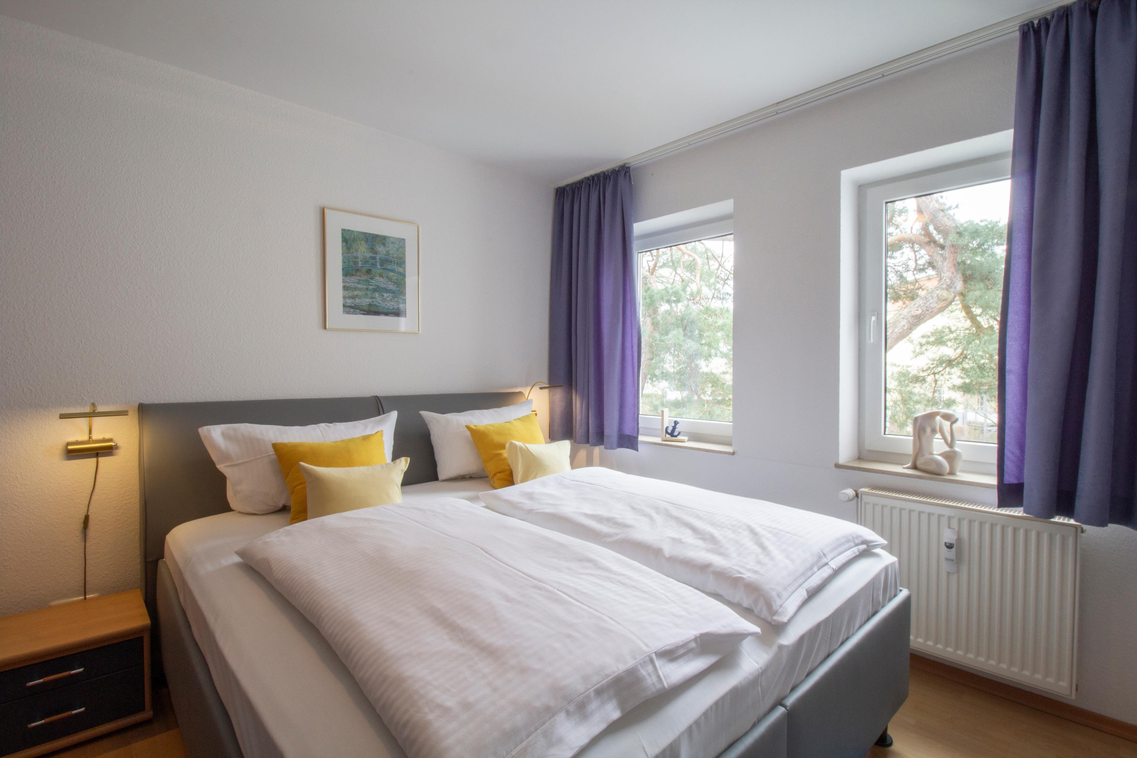 Dieses gepflegte Drei-Zimmer Appartement ist 68 qm groß und befindet sich im 1. Obergeschoss. Der helle Wohnraum ist mit einer bequemen Wohnlandschaft eingerichtet, Flat TV und Radio sind selbstverständlich. Der angrenzende Balkon in südlicher Ausrichtung verspricht viele entspannte Sonnenstunden. Der herrliche Blick ins Grüne lässt Sie den Trubel auf der Promenade gerne vergessen. Von hier aus können Sie einen Blick auf den Schloonsee erhaschen. Ebenfalls im Wohnraum offen integriert befindet sich eine Küchenzeile incl. Zwei-Flächen-Ceranfeld, Kühlschrank, Geschirrspüler, Mikrowelle pp. sowie ein Tresen, der 3 Personen einen Platz zu den Mahlzeiten bietet. Das geräumige Schlafzimmer ist mit einem Doppelbett mit getrennten Matratzen (90 x 200) und einem großen Kleiderschrank eingerichtet. Das zweite Schlafzimmer ist ausgestattet mit einem Einzelbett. Im Badezimmer stehen den Gästen Dusche und Waschbecken/ WC zur Verfügung. Ihren PKW können die Gäste in der zur Wohnung gehörigen Garage auf dem Grundstück abstellen.