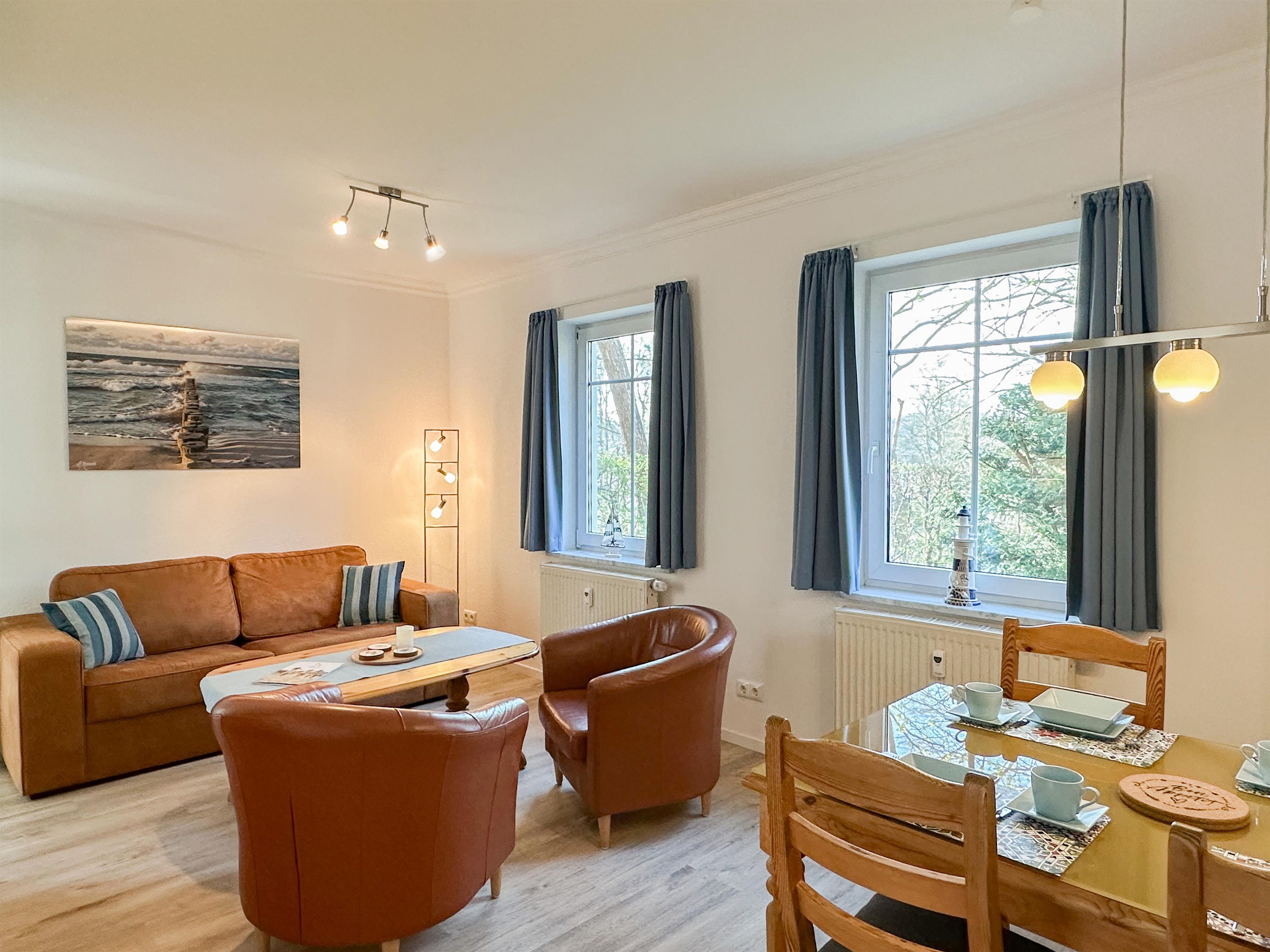 Gemütliche Ferienwohnung mit Balkon und Blick in den Buchenpark nahe Strand und Kurpark.