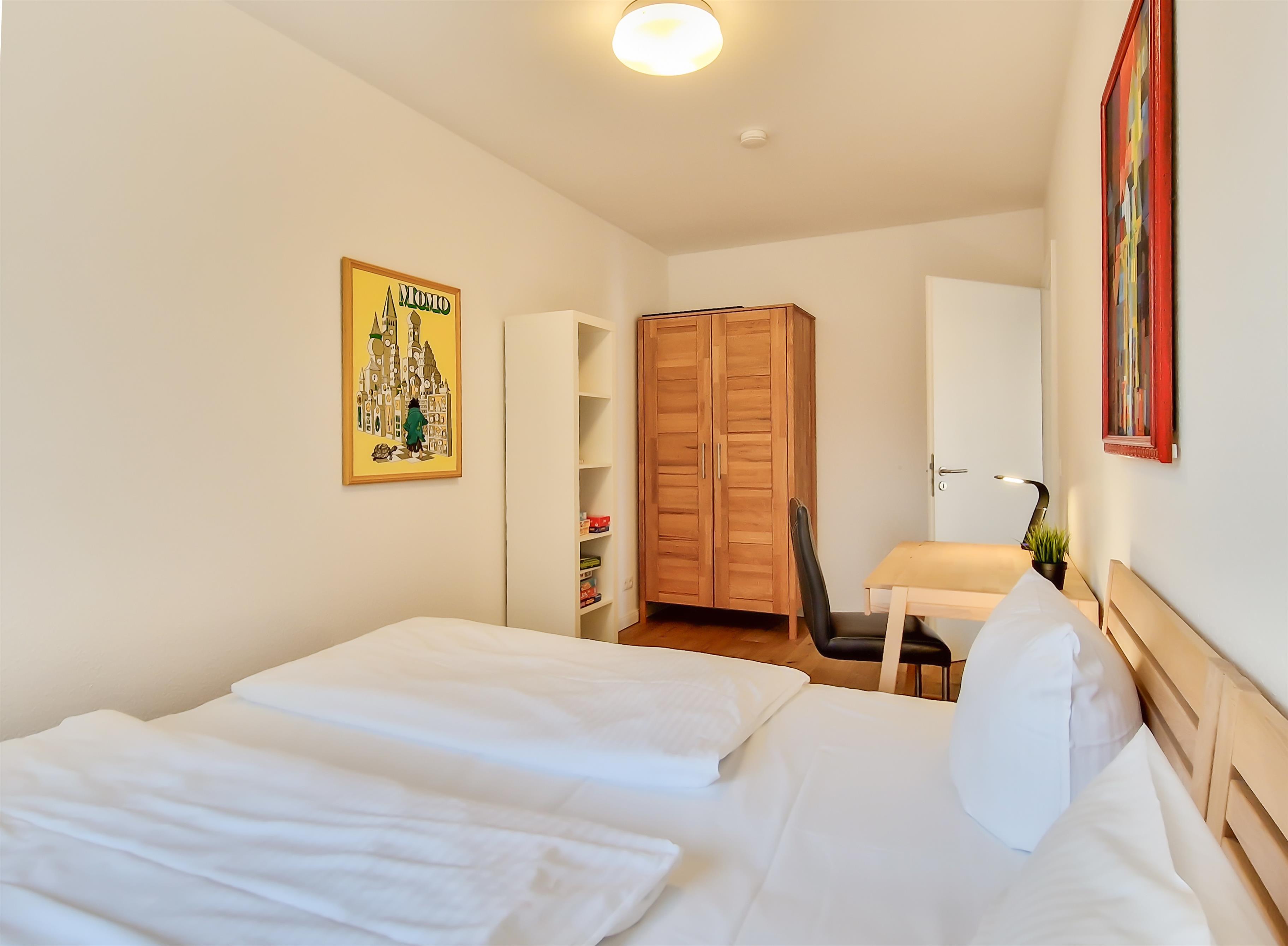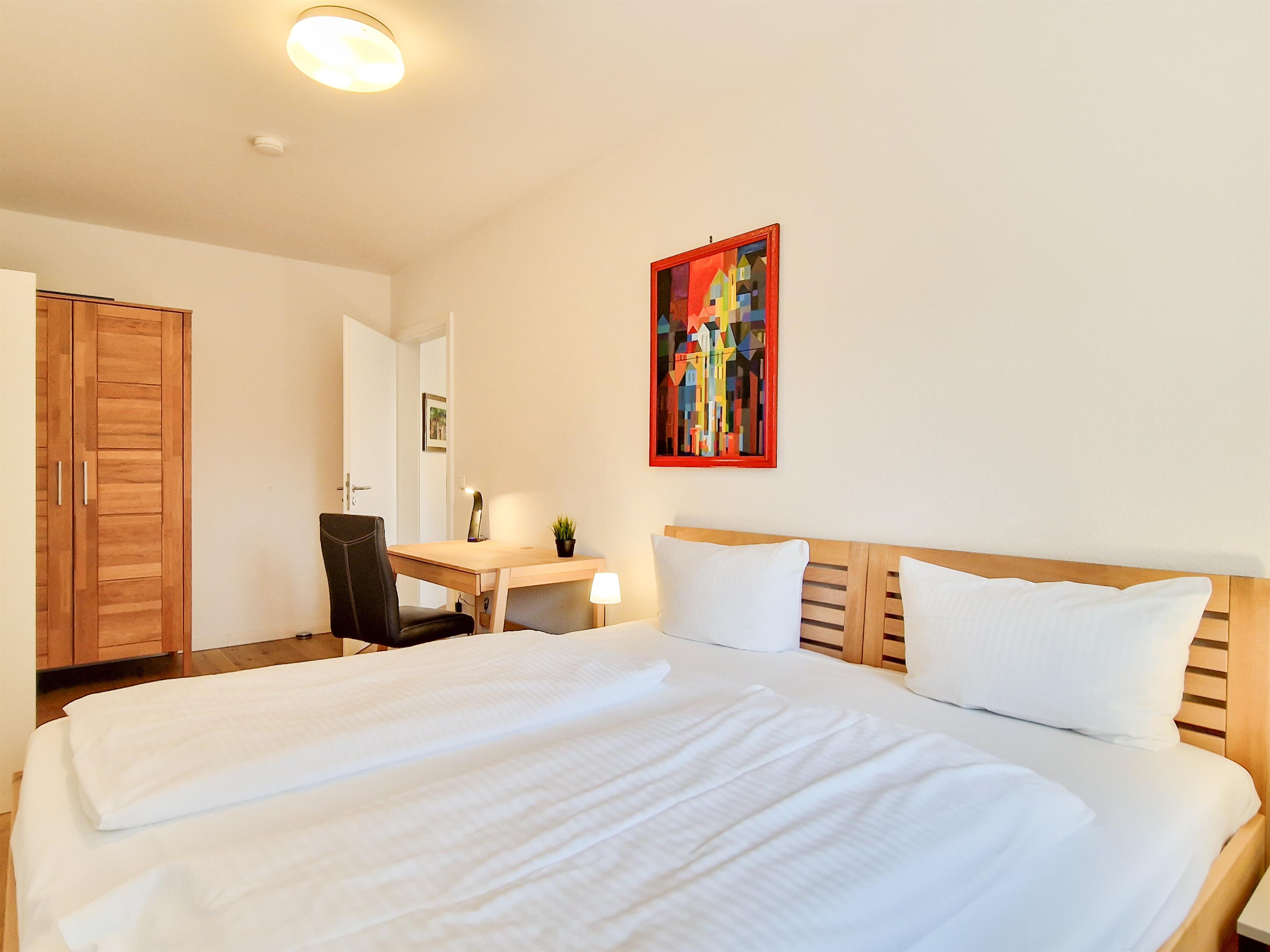 Dieses mit 90 qm großzügige 3-Zimmer Appartement befindet sich im 1. Obergeschoss und eignet sich für 4 Personen. Der helle Wohnraum erwartet seine Gäste mit einer modernen Ledergarnitur zum Relaxen. Flat- TV ist selbstverständlich. Der Essplatz sowie die Küche befinden sich ebenfalls im Wohnraum. Die Küche ist mit Cerankochfeld, Backofen, Mikrowelle, Geschirrspülmaschine und Kühlschrank ausgestattet. Der nordöstlich ausgerichtete Balkon lockt Sie bereits zum Frühstück ins Freie. Die Schlafzimmer sind mit einem Doppelbett, einem Kleiderschrank und einmal mit Schreibtisch eingerichtet. Das moderne Badezimmer ist mit einer Dusche, einem Waschtisch und WC ausgestattet. Hier stehen den Gästen außerdem Waschmaschine und Trockner zur Verfügung. Dem Appartement ist ein Pkw-Stellplatz in der Tiefgarage zugeordnet.