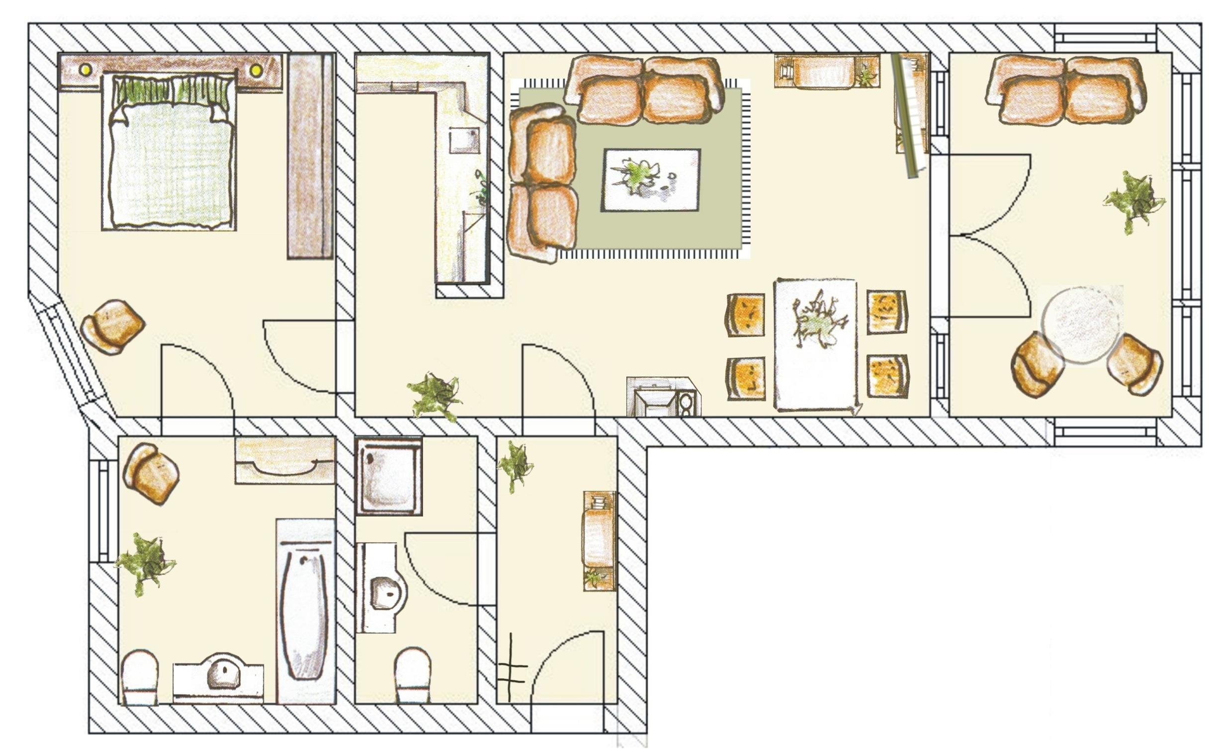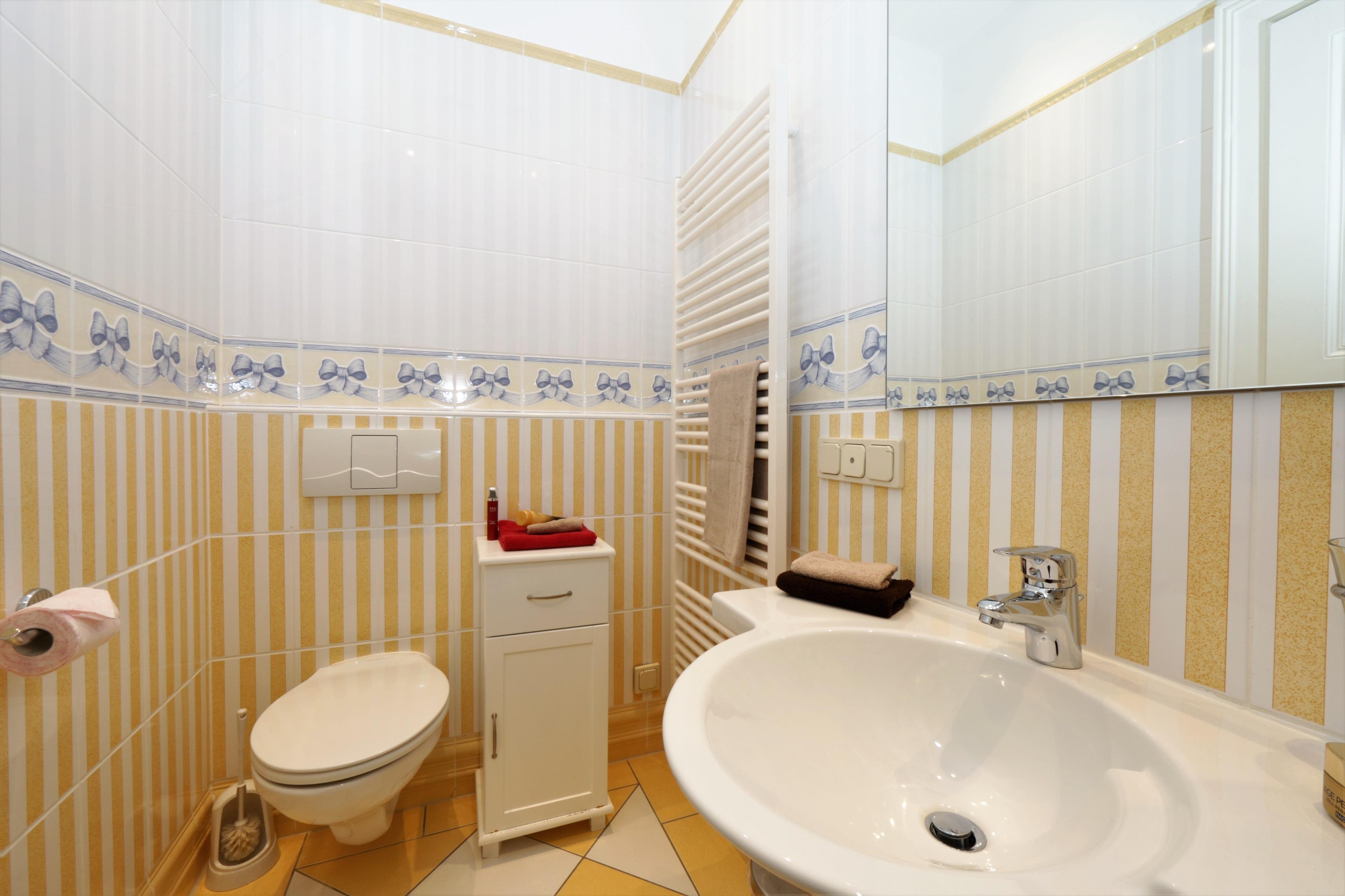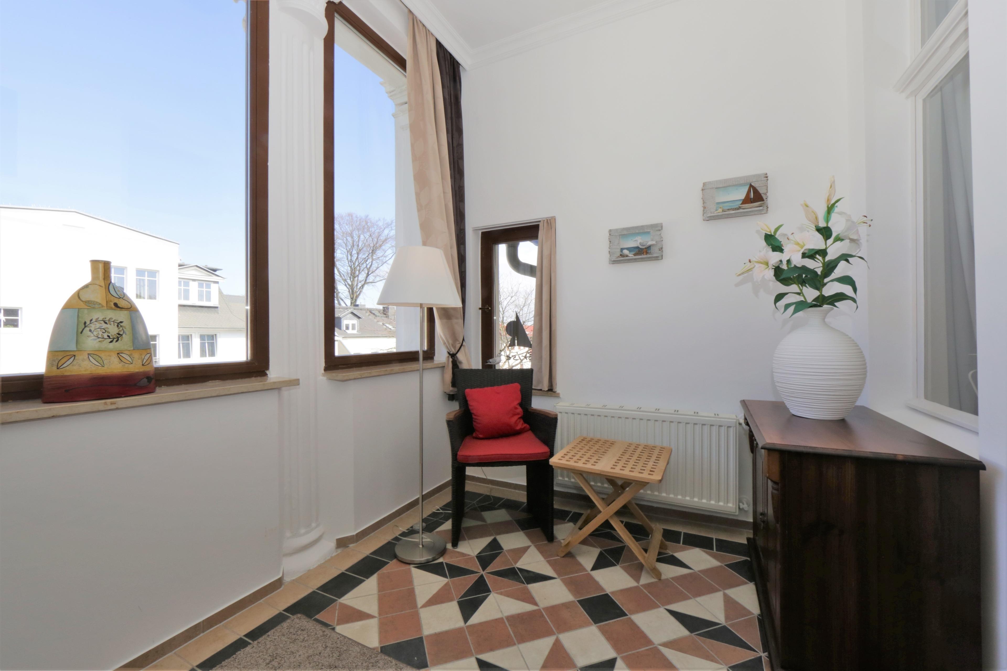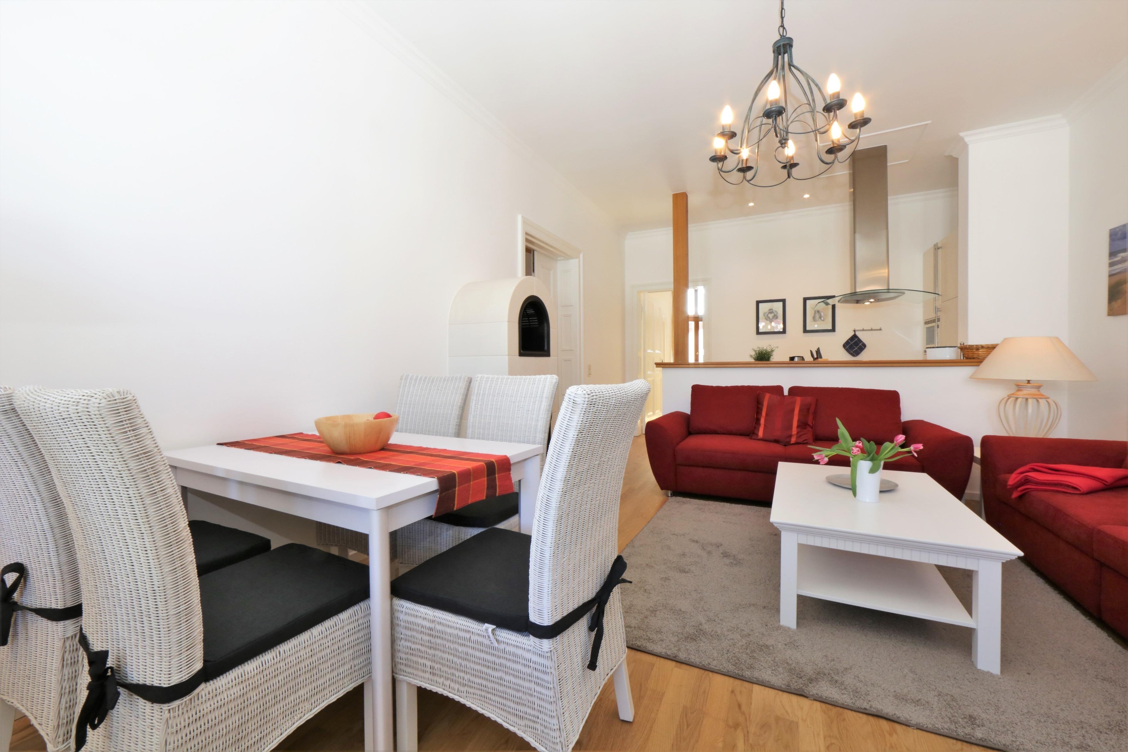 Diese 80 m² große 2,5-Zimmer Wohnung befindet sich im 2. Obergeschoss und bietet 2-4 Personen ausreichend Platz für einen erholsamen Urlaub. Das große helle Wohnzimmer ist mit 2 bequemen Sofas, einen Kamin und einen Essplatz eingerichtet. Flat-TV sowie eine HiFi-Anlage mit CD-Player sind selbstverständlich. Vom Wohnzimmer aus erreicht man die lichtdurchflutete, geschlossene Loggia (Fenster lassen sich öffnen), die zur Ostsee ausgerichtet ist. Der Boden hier lässt die guten alten Zeiten erahnen. Machen Sie es sich hier gemütlich bei einem guten Buch oder einem Glas Wein. Alternativ dient das komfortable Schlafsofa mit einer Matratze von 160 x 200 als Schlafgelegenheit für zwei Personen. Mit lichtdichten Gardienen lässt sich die Loggia abdunkeln. Die offene Vollküche ist im Wohnraum integriert und mit Backofen, Ceranfeld, Geschirrspüler, Mikrowelle etc. ausgestattet. Das großzügige, ruhige und modern eingerichtete Schlafzimmer mit Bad en suite befindet sich auf der Rückseite des Hauses und ist mit einem komfortablen Doppelbett mit getrennten Matratzen (90 x 200) und einem großen Kleiderschrank ausgestattet. Genießen Sie das aufwendig geflieste und großzügige Tageslichtbad mit Badewanne, Waschbecken/WC und Waschmaschine. Zusätzlich verfügt die Ferienwohnung über ein Gästebad mit Dusche und Waschtisch/WC.