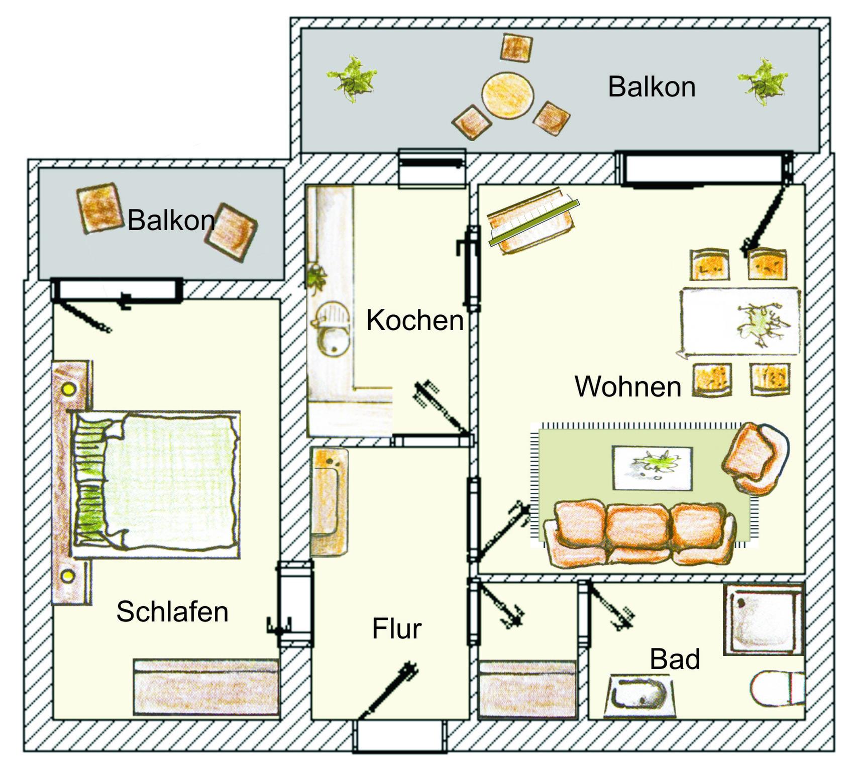 Diese Zwei-Zimmer-Wohnung bietet Ihnen allen Komfort, den Sie sich für Ihren Ferienaufenthalt wünschen. Das Wohnzimmer verfügt über eine gemütliche Couchecke (mit Schlaffunktion) und einen Essplatz für 4 Personen. Die separate Vollküche ist mit Geschirrspüler, Mikrowelle, p.p. ausgestattet. Im Schlafzimmer finden Sie ein Doppelbett und genügend Schrankraum. Im funktionellen Bad (ohne Fenster) finden Sie Waschtisch/WC und Dusche. Zwei Balkone laden zum Verweilen ein. Der PKW-Stellplatz ist am Haus. Waschmaschine, Trockner und Fahrradabstellmöglichkeit befinden sich im Keller. Die eigenen oder geliehenen Fahrräder können aber auch auf dem Grundstück in einer überdachten Abstellmöglichkeit untergebracht werden.