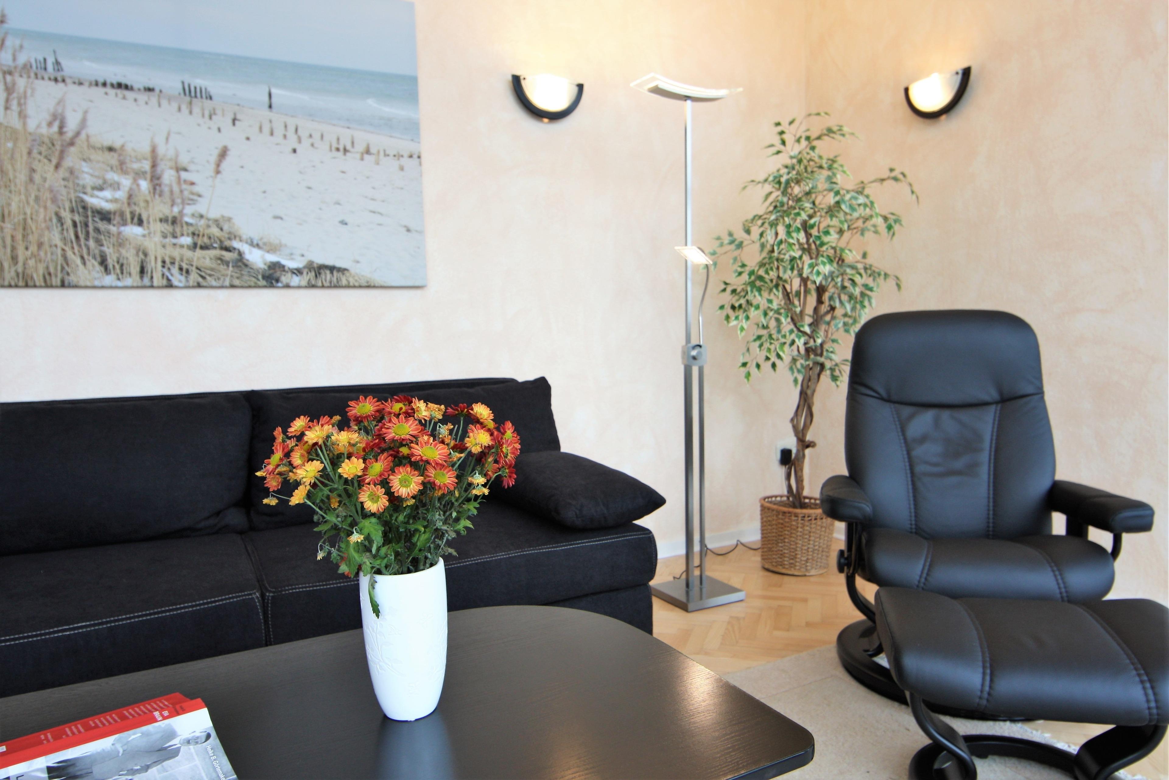 Dieses gepflegte Ferienappartement vereint Charme einer alten Villa und den Komfort einer modernen Wohnung. Das ca.65 m² große Appartement bietet zwei bis vier Personen ausreichend Platz für einen angenehmen Aufenthalt. Das Besondere an dieser Wohnung ist die breite Fensterfront im Wohnzimmer, von der Sie einen wunderschönen Blick auf das Meer haben. Vor der gesamten Fensterfront befindet sich eine in ihren Maßen ausgesprochen üppig ausgefallene Terrasse. Der Wohnraum ist einerseits mit einer Couch mit Schlaffunktion (Liegefläche 160x200) sowie zwei bequemen Relaxsesseln und sehr großem Flat-TV, andererseits mit einem Esstisch für 4 Personen eingerichtet. Die voll ausgestattete etwas separate Küche verfügt über Geschirrspüler, Mikrowelle, Kühlschrank, Backofen mit Ceranfeld etc. Das moderne in weiß gehaltene Schlafzimmer ist mit einem Doppelbett mit getrennten Matratzen (90 x 200), reichlich Schrankraum und einem zusätzlichen Flat-TV eingerichtet. Die Böden im Wohn- und Schlafbereich sind mit Echtholzparkett belegt. Im geräumigen Bad finden Sie einen doppelten Waschtisch, Dusche und WC. Der Pkw- Stellplatz befindet sich auf dem abgeschlossenen Grundstück und ist der Wohnung zugeordnet, die Fahrräder können in der Remise untergestellt werden.