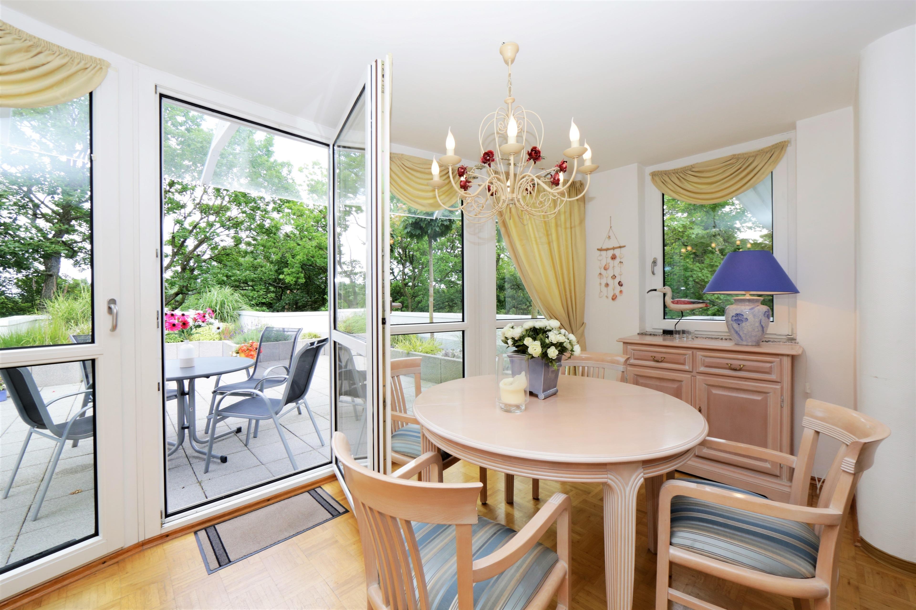 Dieses außergewöhnliche Appartement besticht nicht nur durch seine 1A Lage, sondern auch durch seine geschmackvolle und hochwertige Ausstattung. Erreichen können Sie dieses 111 qm große 3-Zimmer Appartement in der 3. Etage über einen Fahrstuhl. Sie betreten die Wohnung über einen kleinen Vorraum mit Garderobe und können durch die Glastür bereits den großzügigen Wohnbereich einsehen. Im Wohnraum erwartet Sie eine opulente Leder-Sitzgarnitur, Flat-TV und Radio/CD. Die große CD-Sammlung ist breit gefächert. Im Erker desselben Raumes steht ein Esstisch für 4 Personen, der zu Mahlzeiten in gemütlicher Atmosphäre einlädt. Zubereiten können Sie die Mahlzeiten in der vom Wohnraum abgehenden, separaten Küche mit einem Fenster. Die moderne Vollküche verfügt über alle Annehmlichkeiten wie Backofen mit Induktionsfeld, Geschirrspüler, Kühlschrank, Mikrowelle etc. Das Highlight dieser Wohnung ist die ca. 40 qm große Dachterrasse zur Seeseite von der aus Sie die Ostsee erahnen können. Mit ihrer ganzjährigen Bepflanzung stellt die Terrasse eine kleine Oase dar. Der Größe der Terrasse ist es zu verdanken, dass sie trotz ihrer Ausrichtung lange von der Sonne verwöhnt werden. Lassen auch Sie sich verwöhnen! Diese Wohnung verfügt darüber hinaus über zwei geräumige Schlafzimmer, ausgestattet mit jeweils einem Doppelbett mit getrennten Matratzen (100 x 200) und reichlich Stauraum. Den Schlafzimmern ist jeweils ein Bad zugeordnet, das mit Dusche und Waschtisch/WC ausgestattet ist. Das größere Bad bietet zusätzlich eine Badewanne. Der gesamte Wohn- und Schlafbereich ist mit Echtholzparkett ausgelegt. Ein Stellplatz für Ihr Fahrzeug befindet sich auf dem Grundstück und ist der Wohnung zugeordnet. Waschmaschine, Trockner und Fahrradabstellraum finden Sie im Keller.