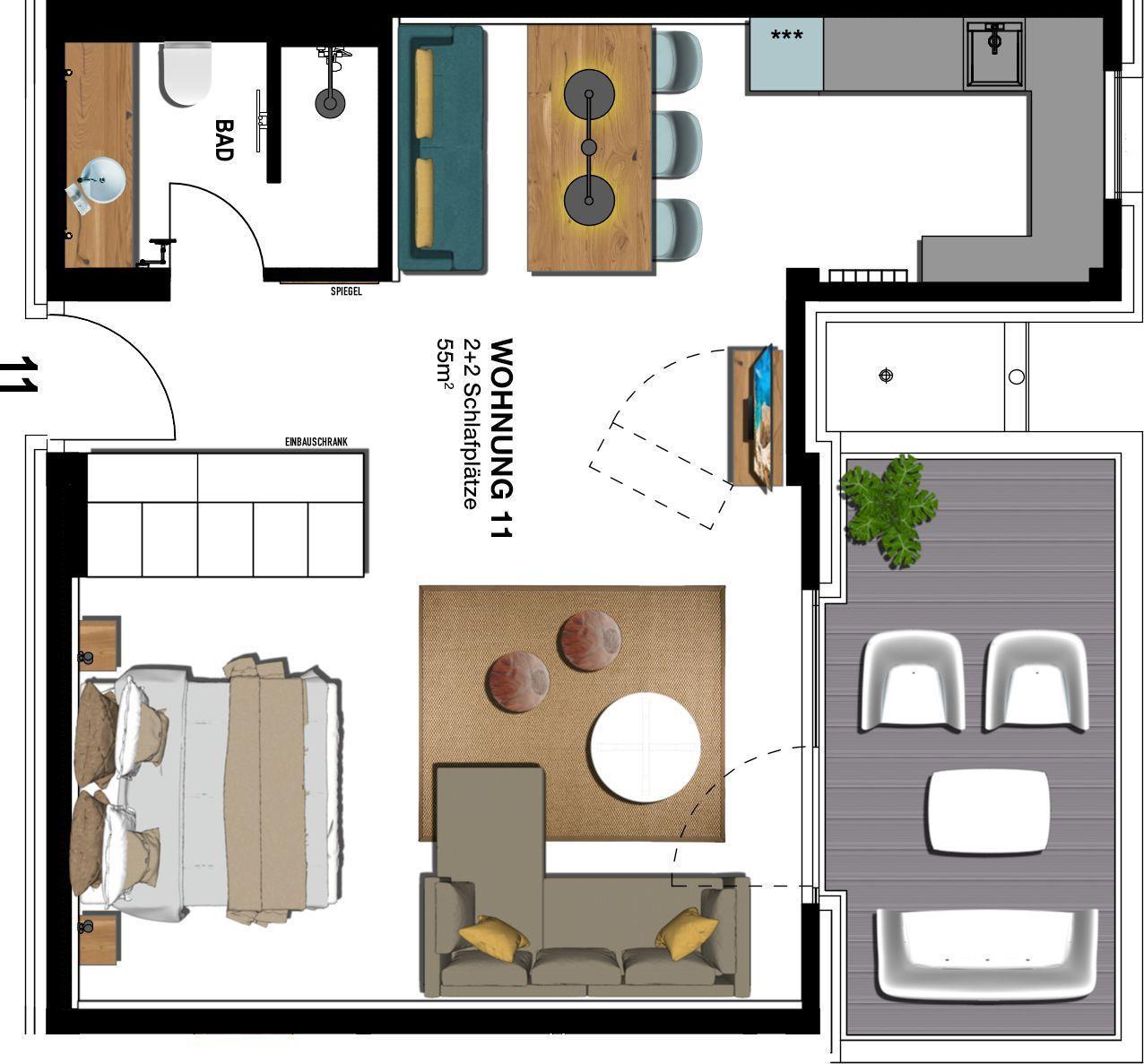 1-Raum Ferienwohnung mit Balkon, Bad mit Dusche, Küche mit Cerankochfeld, Backofen, Kühl-Gefrierkombination, Geschirrspüler und Mikrowelle, Smart-TV, Eckschlafsofa und Boxspringdoppelbett, Nichtraucher, Haustiere gestattet