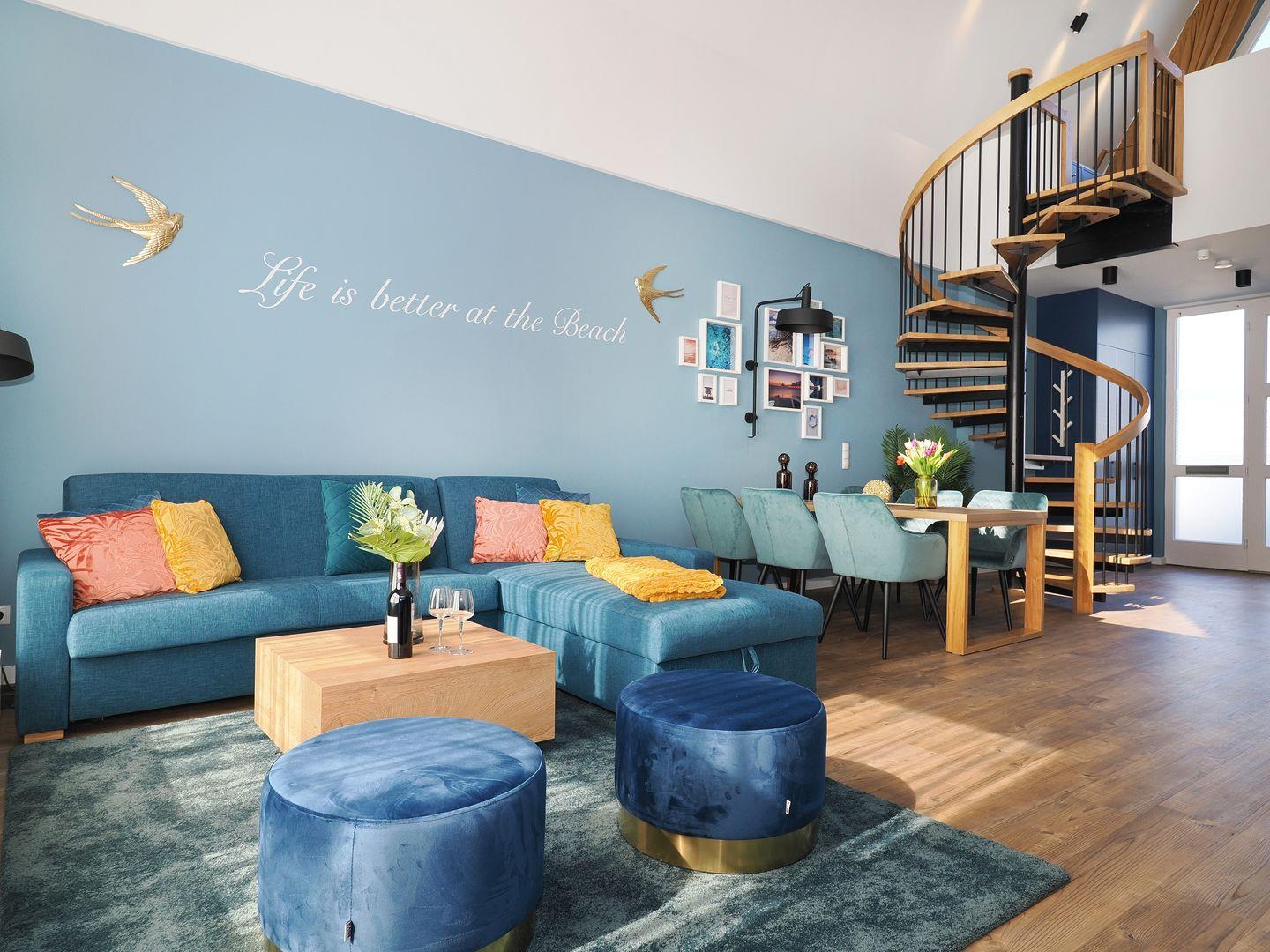 Entspannen Sie auf Ihre Terrasse mit Seeblick! Die 2023 renovierte, lichtdurchflutete Ferienwohnung ist auf zwei Ebenen, mit einer Empore auf der oberen Etage konzipiert und vom darunter liegenden Wohnbereich aus über eine Treppe zu betreten. Sowohl der separate Schlafbereich auf der Empore mit dem Boxspringdoppelbett, als auch das gemütliche Eckschlafsofa im Wohnzimmer mit Smart-TV bieten Ihnen angenehme Nächte. Neben dem komfortablen Esstisch im Wohnbereich finden Sie auch genügend Platz für Ihre Garderobe und haben einen direkten Ausgang auf die Terrasse mit Sitzgarnitur, wo Sie den herrlichen Weitblick auf die Ostsee genießen können. Die offene Küchenzeile im Wohnraum ist mit Ceranfeld, Backofen, Geschirrspüler, Kühl-Gefrierkombination, Spülmaschine, Toaster, Mikrowelle, Wasserkocher und alle erforderliche Küchenutensilien ausgestattet. Das Badezimmer überzeugt mit einer ebenerdigen Dusche, einem Waschbecken, einem WC sowie einem großen Spiegel mit Kosmetikspiegel. Für Ihren Komfort sind Bettwäsche, Handtücher, Reinigungs- und Waschmittel als Erstausstattung inklusive. Der WLAN-Zugang ist kostenfrei nutzbar. Auf Wunsch stellen wir ein Kinderreisebett und einen Kinderhochstuhl gegen einen Aufpreis zur Verfügung. Vor dem Haus gibt es nur Be-und Endladeparkplätze, als Alternative bieten wir für das örtliche Parkhaus in Heringsdorf ermäßigte Parkkarten gemäß aktueller Preise. Die Parkkarte erhalten Sie bei Anreise in unserem Servicebüro. Haustiere sind in dieser Ferienwohnung herzlich willkommen, hierfür berechnen wir Gebühr gemäß aktueller Preise. Im Untergeschoss der Seebrücke steht Ihnen ein abschließbarer Fahrradraum sowie ein kleiner Waschraum mit Waschmaschine, Trockner, Bügelbrett und Bügeleisen kostenfrei zur Verfügung.