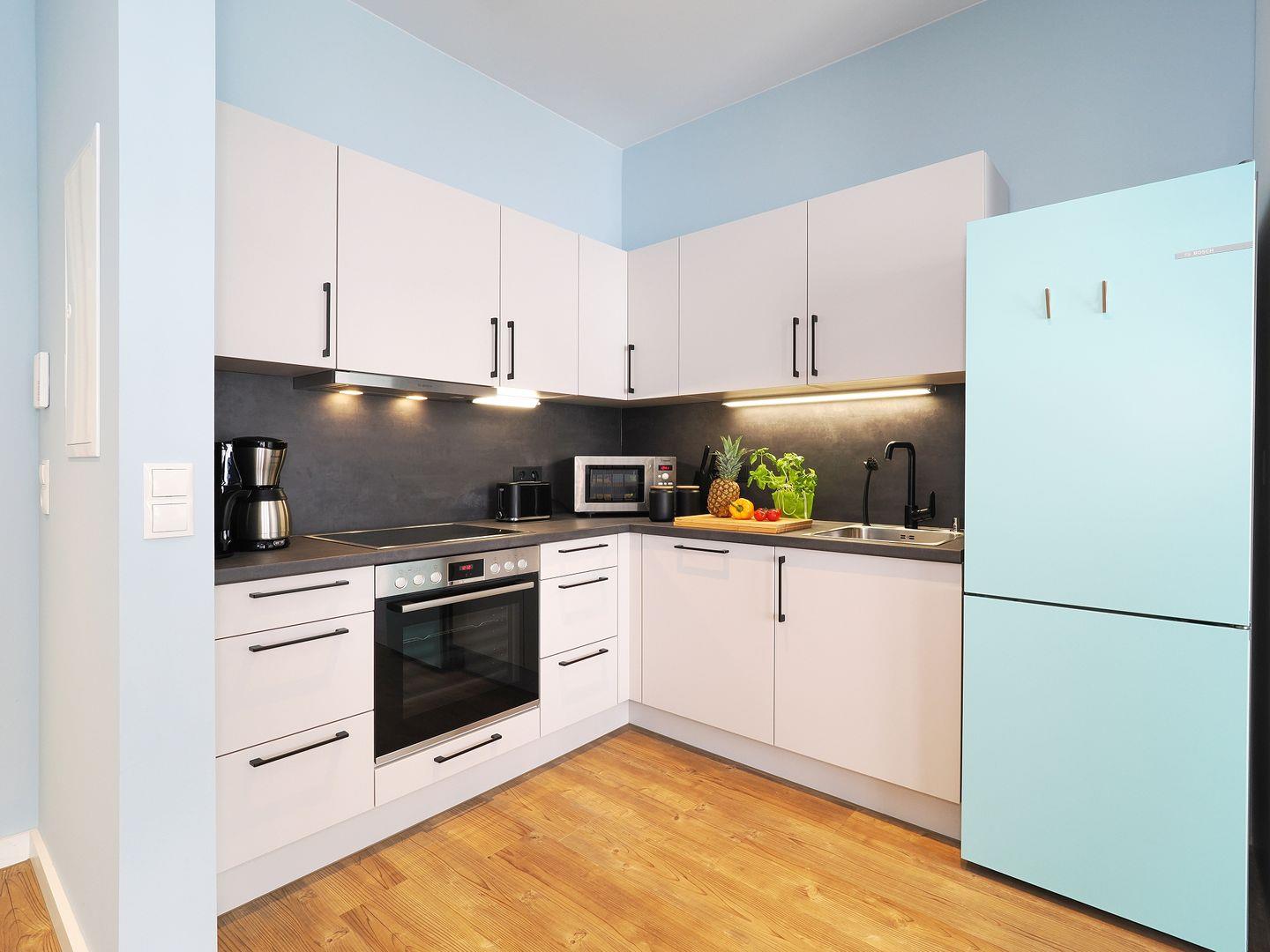 2-Raum Ferienwohnung mit Empore und Balkon, Bad mit Dusche, Küche mit Cerankochfeld, Backofen, Kühl-Gefrierkombination, Geschirrspüler und Mikrowelle, Smart-TV, Eckschlafsofa und Boxspringdoppelbett, Nichtraucher, Haustiere gestattet