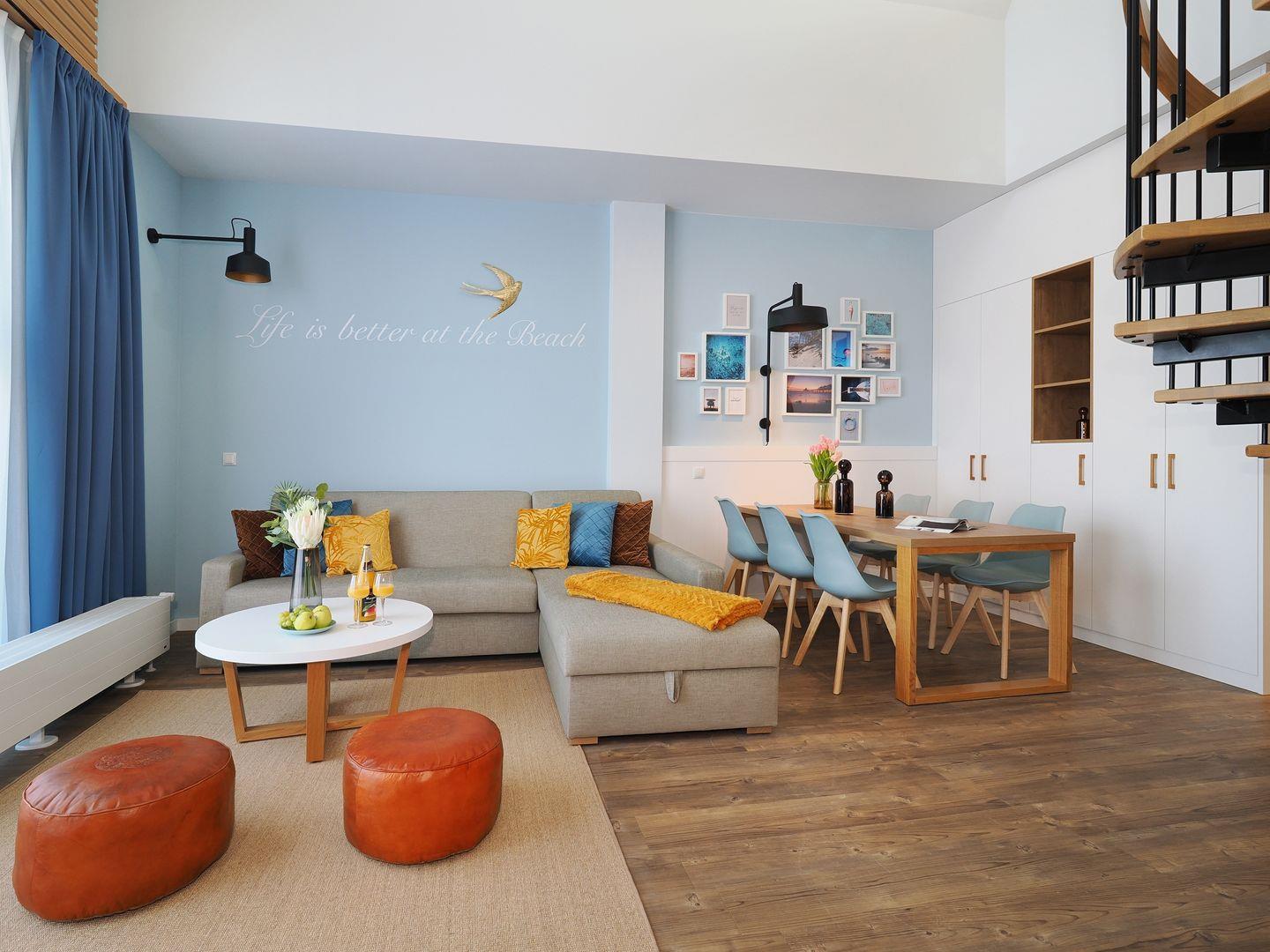 2-Raum Ferienwohnung mit Empore und Balkon, Bad mit Dusche, Küche mit Cerankochfeld, Backofen, Kühl-Gefrierkombination, Geschirrspüler und Mikrowelle, Smart-TV, Eckschlafsofa und Boxspringdoppelbett, Nichtraucher, Haustiere gestattet