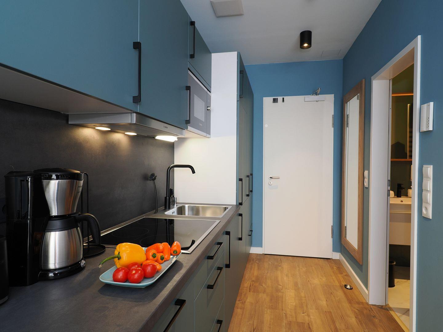 1-Raum Ferienwohnung mit Balkon, Bad mit Dusche, Küche mit Cerankochfeld, Kühl-Gefrierkombination, Geschirrspüler und Mikrowelle, Smart-TV, Boxspringdoppelbett, Nichtraucher