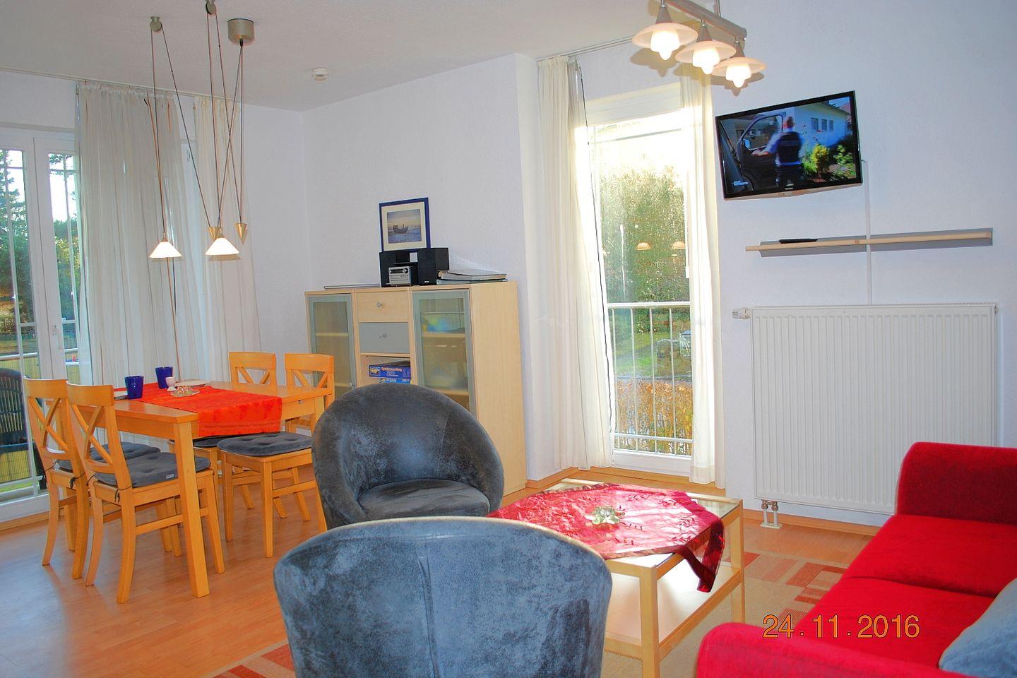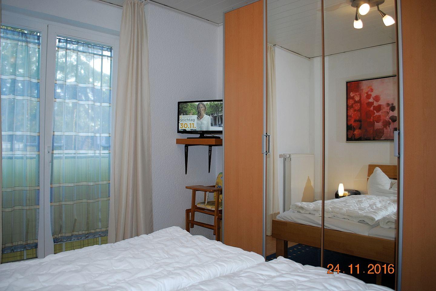Die gut ausgestattete 55 m² große Hochparterre-Ferienwohnung 16 verfügt über zwei separate Schlafzimmer (Doppelbetten), einen Balkon, einen Wohnbereich mit kompletter Küchenzeile, Essplatz und Schlafcouch sowie ein Duschbad. Es stehen kostenfreies WLan und ein PKW-Stellplatz zur Verfügung. Haustiere sind auf Anfrage gestattet.