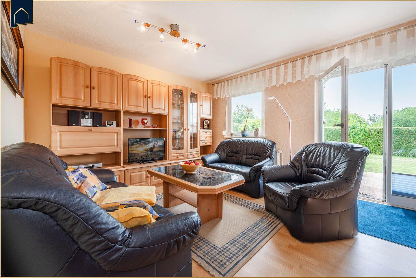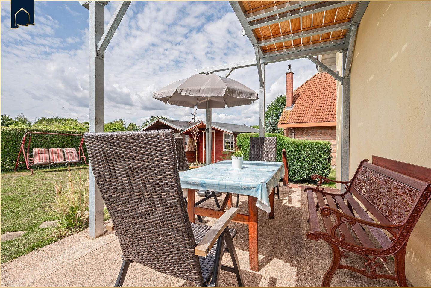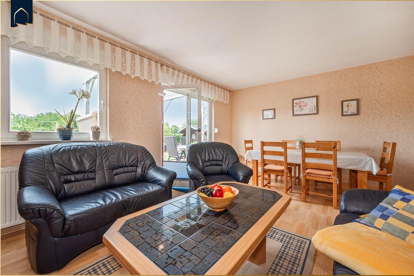 Der große Wohnbereich lädt mit bequemer Sofaecke, TV und Kamin zum Entspannen ein. Die voll ausgestattete Küche mit Backofen, Herd, Mikrowelle, Geschirrspüler, Kühlschrank und Kaffeemaschine lässt keine Wünsche offen. Vom Essbereich mit großem Esstisch gelangt man direkt auf die möblierte Terrasse – perfekt für ein Frühstück im Grünen oder einen Grillabend im Sonnenuntergang. WLAN, Bücher, Radio und Fliegengitter an den Fenstern sorgen für zusätzlichen Komfort.