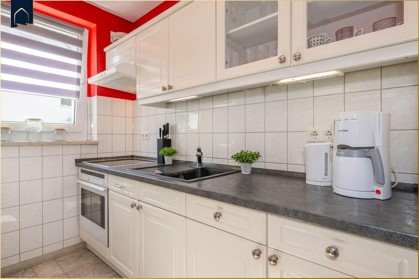 Die separate Küche ist bestens ausgestattet mit Herd, Backofen, Kühlschrank, Spülmaschine, Mikrowelle, Wasserkocher, Kaffeemaschine, Toaster und umfangreichem Geschirr sowie Küchenutensilien – ideal, um auch im Urlaub selbst zu kochen. Der offene Essbereich mit großem Esstisch lädt zu gemeinsamen Mahlzeiten ein.