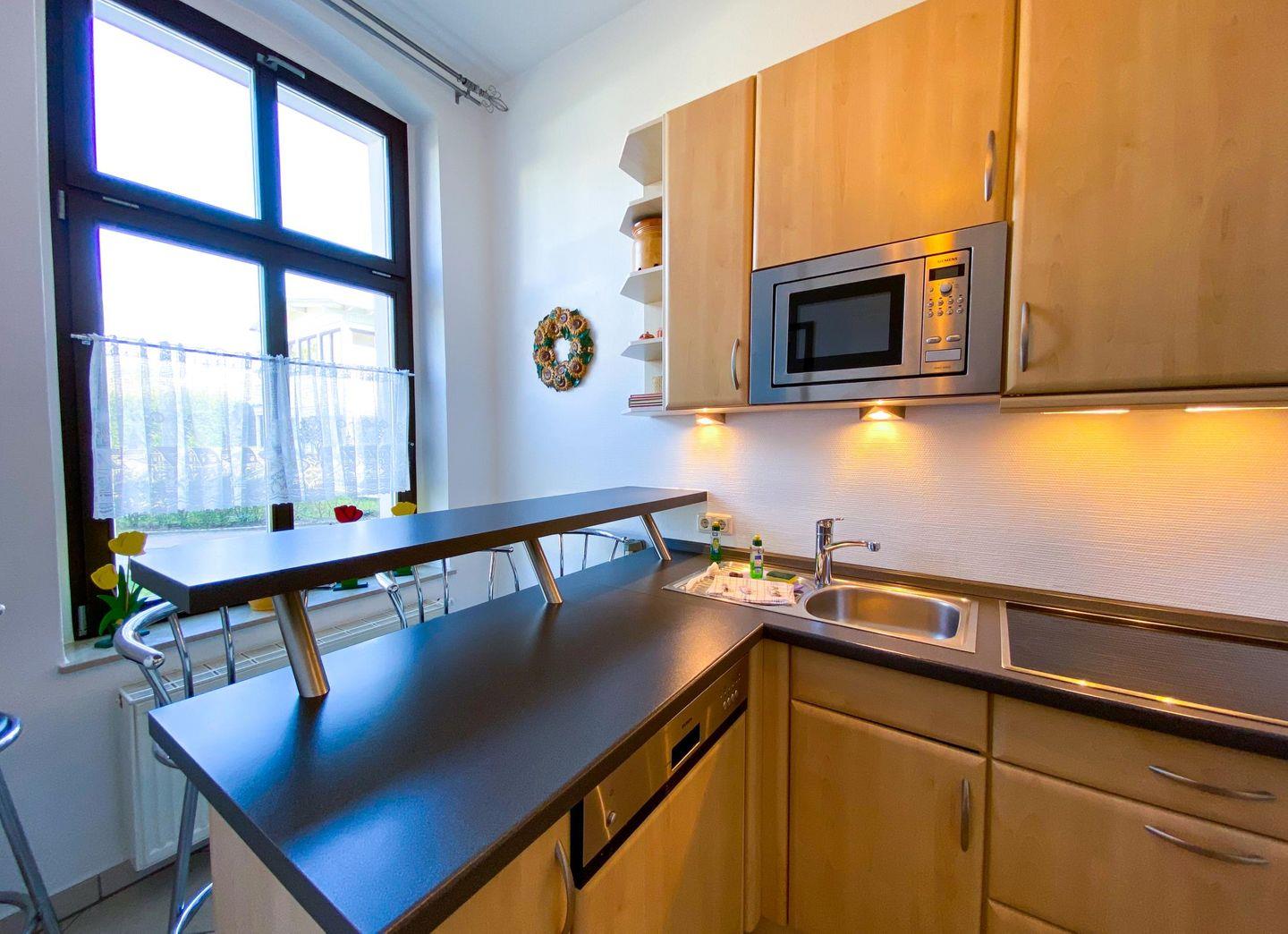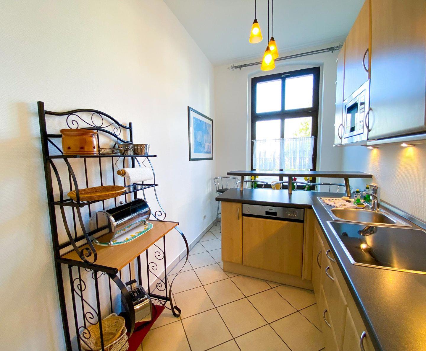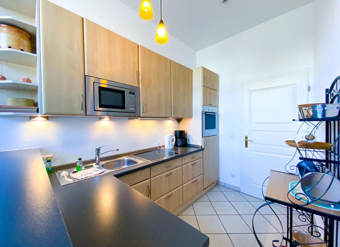 In der gemütlichen separaten Küche lässt es sich herrlich kochen, ohne die Miturlauber zu stören. Für helfende Hände gibt es ein schönes Sitzplätzchen am Küchentresen. Hier kann auch die schnelle Mahlzeit eingenommen werden. Der Wohnbereich ist mit einer komfortablen Sitzecke sowie einem stilvollen Essplatz ausgestattet. Durch die großen Fenster kann viel Licht in die hohen Räume dringen.
