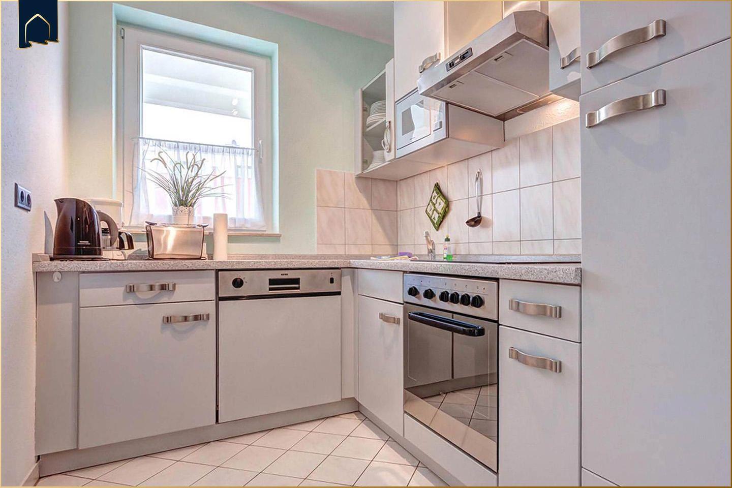 Die Wohnung verfügt über zwei separate Schlafzimmer mit bequemen Schlafmöglichkeiten, ein stilvoll eingerichtetes Wohnzimmer mit gemütlicher Sofaecke, TV und Radio sowie einen hellen Essbereich mit Esstisch. Die offene Küche lässt mit Backofen, Ceranherd, Kühlschrank mit Gefrierfach, Spülmaschine, Kaffeemaschine, Wasserkocher, Toaster und Mikrowelle keine Wünsche offen. Das Tageslichtbad ist modern ausgestattet mit Dusche, Waschbecken, WC und Haartrockner. Besonders schön: Der überdachte Balkon bietet auch bei wechselhaftem Wetter einen wunderbaren Ort zum Entspannen.