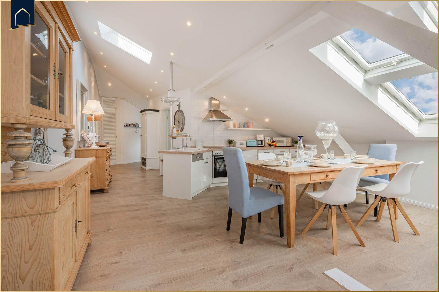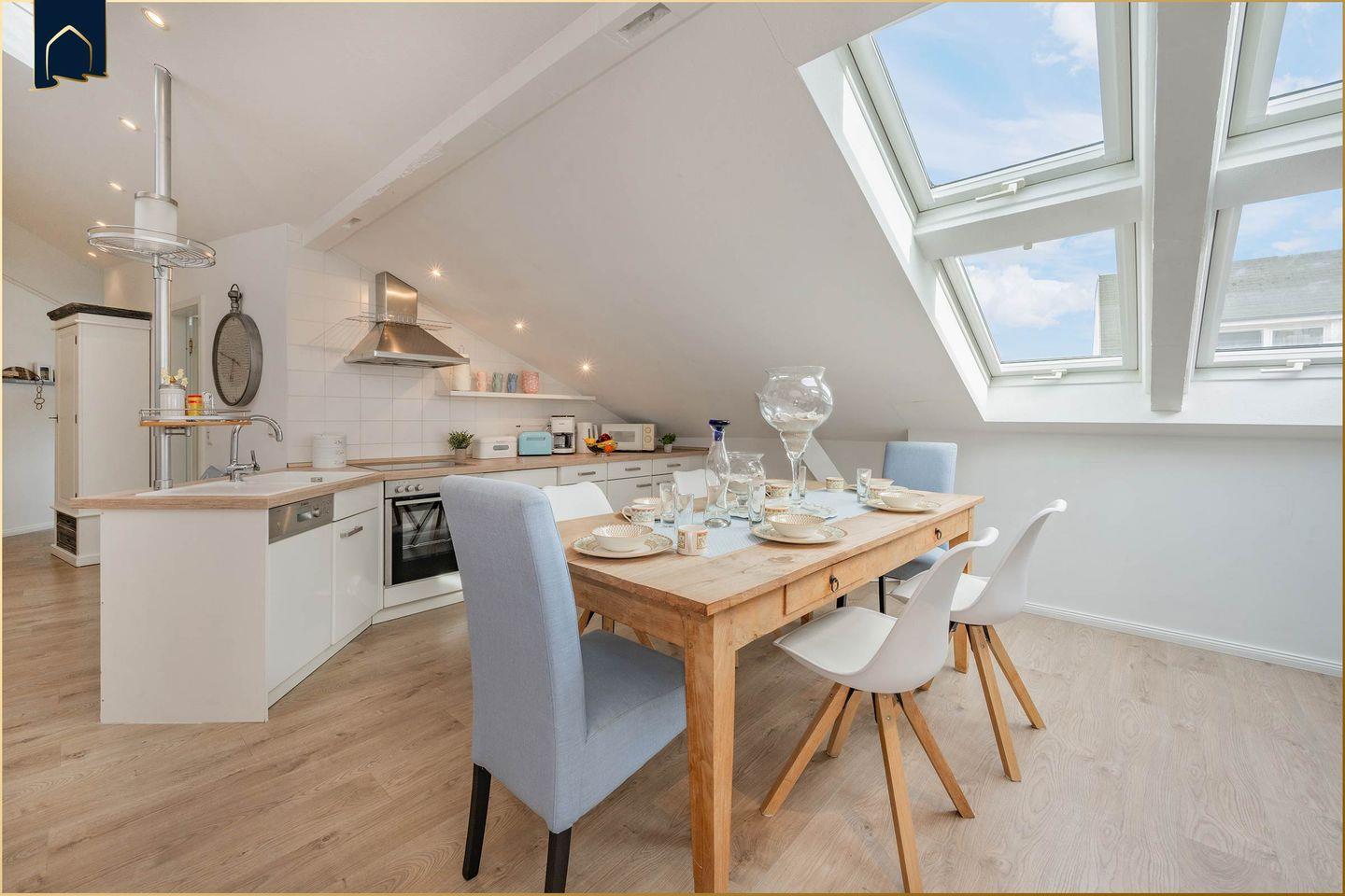 Die Ferienwohnung überzeugt mit einer modernen, offenen Küche, die keine Wünsche offenlässt. Zur Ausstattung gehören ein Herd, Backofen, Mikrowelle, Gefrierfach, Spülmaschine, Wasserkocher, Toaster, Kaffeemaschine und natürlich Geschirr und Besteck. Am großzügigen Esstisch finden alle Gäste bequem Platz. Dank der praktischen Aufteilung eignet sich die Unterkunft hervorragend für Familien oder Paare, die auch im Urlaub nicht auf Komfort verzichten möchten. Für gemütliche Abende stehen ein CD- und DVD-Spieler sowie kostenloses WLAN zur Verfügung.