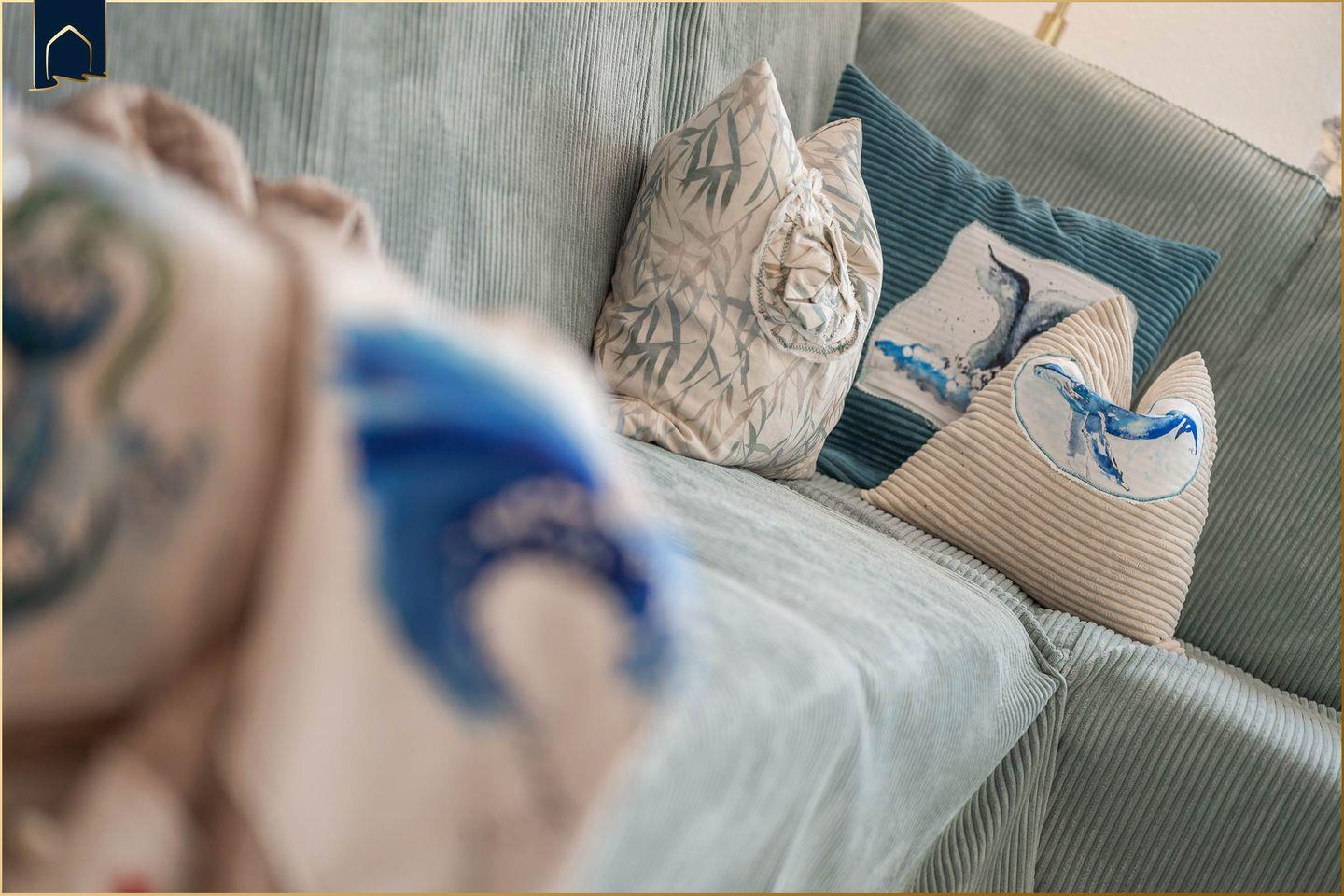 Im stilvoll eingerichteten Wohnzimmer mit gemütlicher Sofaecke, TV, CD- und DVD-Player können Gäste entspannte Abende verbringen. Die voll ausgestattete Küche bietet alles, was für die Selbstversorgung nötig ist – inklusive Herd, Backofen, Mikrowelle, Spülmaschine, Wasserkocher, Kaffeemaschine und Toaster. Auch ein Esstisch ist vorhanden – perfekt für gemeinsame Mahlzeiten nach einem sonnigen Tag am Meer.