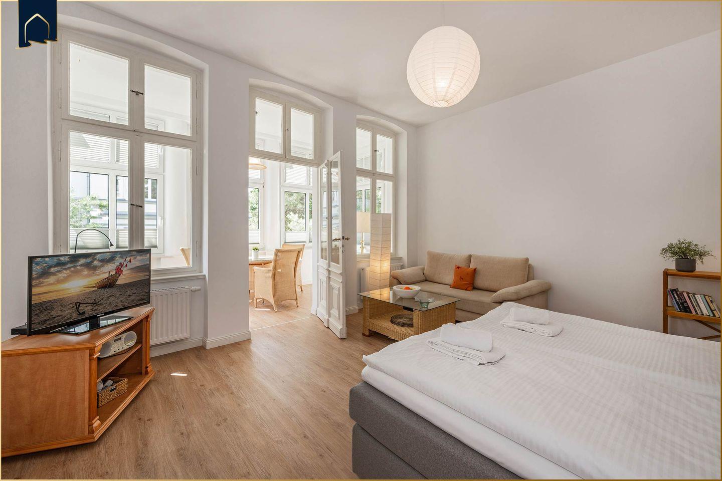 Auf 46?m² erwartet Sie ein stilvoll eingerichtetes Wohnzimmer mit komfortablem Sofa, TV und Radio sowie ein separates Schlafzimmer mit Doppelbett. Die moderne Küche verfügt über alles, was Sie für die Selbstversorgung benötigen – inkl. Herd, Backofen, Mikrowelle, Kühlschrank, Spülmaschine, Wasserkocher, Toaster und Kaffeemaschine. Ein schönes Bad mit Dusche und WC rundet das Angebot ab.