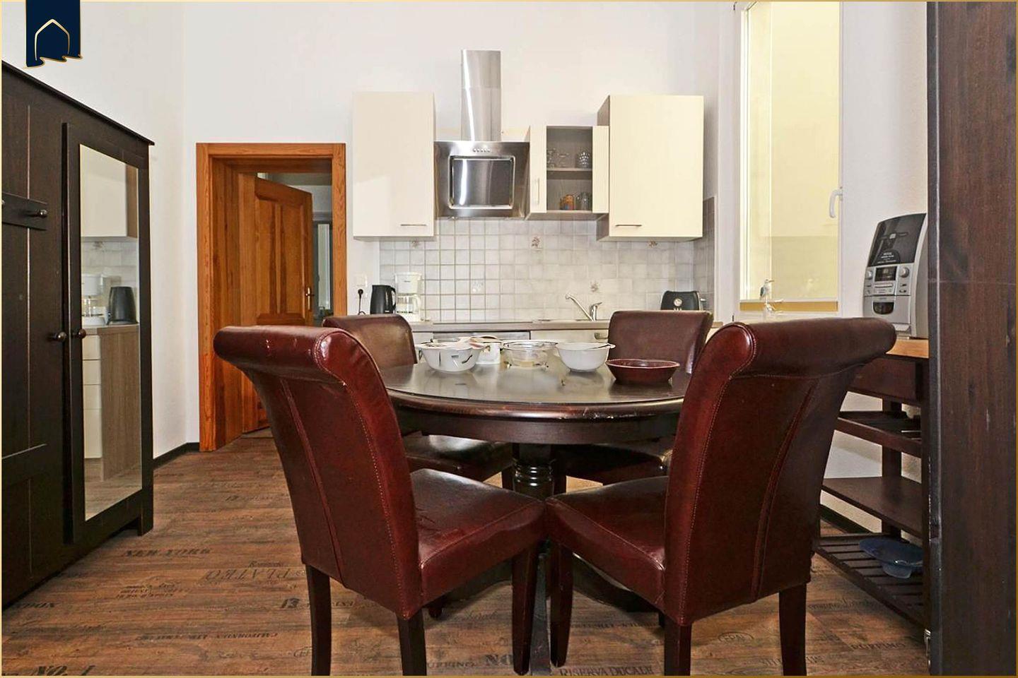 Der gemütliche Wohnbereich ist mit einem Sofa, Sessel, TV und Radio ausgestattet und lädt zu entspannten Abenden ein. Die voll ausgestattete Küche bietet alles, was Sie für die Selbstverpflegung benötigen: Kühlschrank, Gefrierfach, Herd, Backofen, Kaffeemaschine, Toaster, Wasserkocher, Geschirrspüler und ausreichend Küchenutensilien. Ein Esstisch bietet Platz für gemeinsame Mahlzeiten. Auch praktische Extras wie ein Haartrockner, Staubsauger und Schuhschrank sind vorhanden. Alle Fenster verfügen über Sichtschutz, sodass Sie Ihre Privatsphäre jederzeit genießen können.