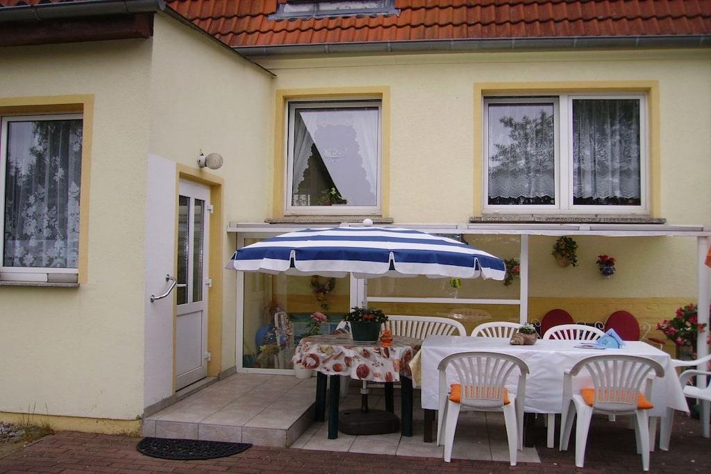 Die Ferienwohnung befindet sich unten, direkter Zugang zur Terrasse. Belegung 1- 5 Personen Im Schlafzimmer , 2 Betten und 1 Liege sowie 1 Schrank, 2 Nachttische mit Nachttischlampen. Im 2. Schlafraum 2 Liegen, 1 Schrank, Nachttische und Nachttischlampen. Reisebett und Hochstuhl können gestellt werden. Wohnzimmer mit Couchgarnitur und Fernseher, Anrichte. Küche mit E-Herd, Geschirrspüler, Kühl-und Gefrierschrank, Sitzgelegenheit Ein Bad mit Dusche und WC neu, sowie eine Waschmaschine. Ein Bügelbrett und Bügeleisen sind auch vorhanden. Terrasse mit Gartenmöbeln laden zum grillen ein. Ruhige große Hoflage für Kinder zum spielen geeignet.