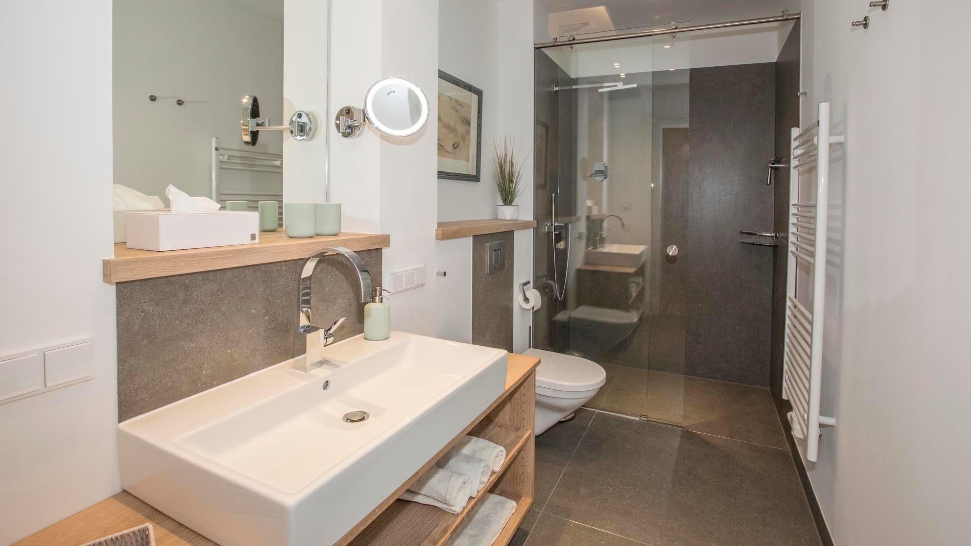 Die 2 Badezimmer en suite, sind jeweils mit ebenerdiger Regendusche, Massivholz-Waschtisch und Fußbodenheizung ausgestattet.