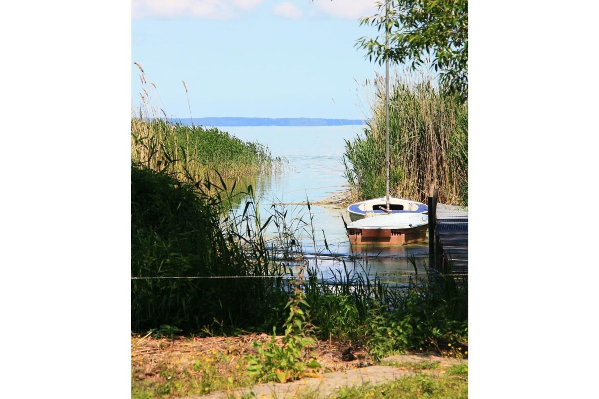 Das romantisch mitten im Grünen gelegene und über 2 Ebenen bewohnbare Ferienhaus ist knapp 20 m vom Wasser entfernt und befindet sich auf dem Grundstück des Besitzers. Vom Wohnzimmer aus schauen Sie über das Stettiner Haff bis zur Insel Usedom. Zahlreiche Wasservögel sorgen für maritime Stimmung. Blumengarten, Terrasse und eigener Bootssteg stehen Ihnen zur Verfügung. Zwei schöne Badestrände sind nur 150 bzw. 600 m entfernt. Genießen Sie die üppige Natur und die saubere Seeluft!