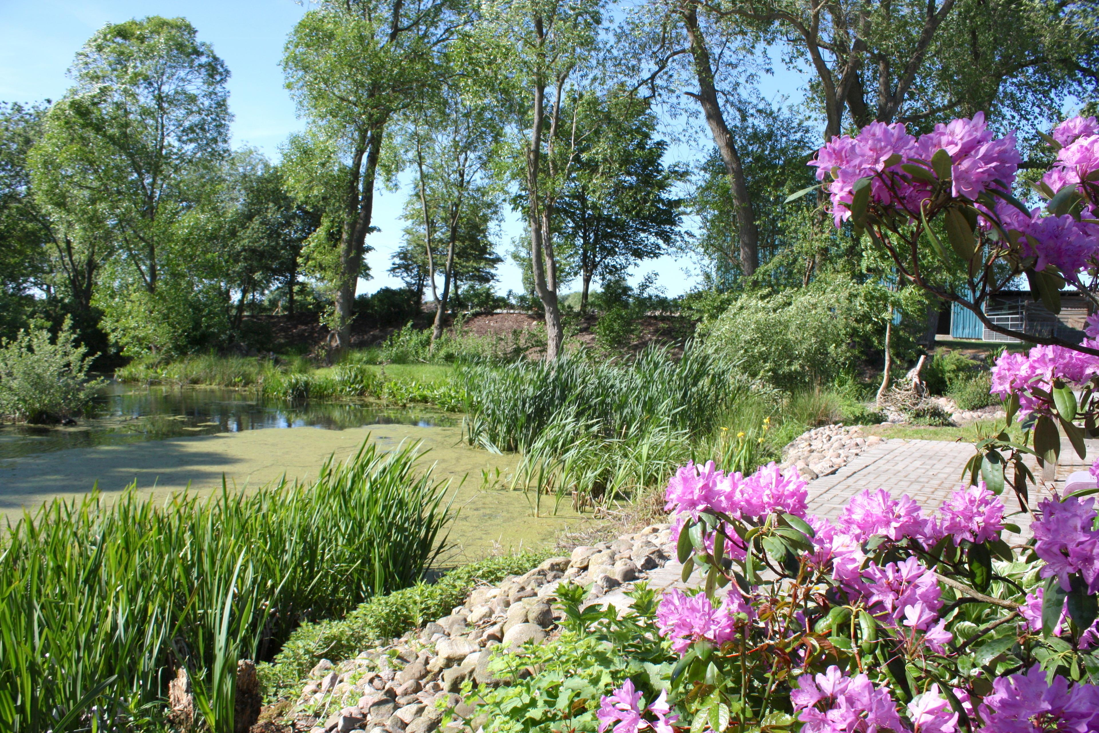An den Hofbereich schließen das Pferdepaddock und der 2000 qm Naturteich mit Teichterasse an, dahinter geht es weiter zum Bolzplatz mit Fußballtoren, zum Reitplatz, zur Steuobstwiese und zur Pferdeweide.