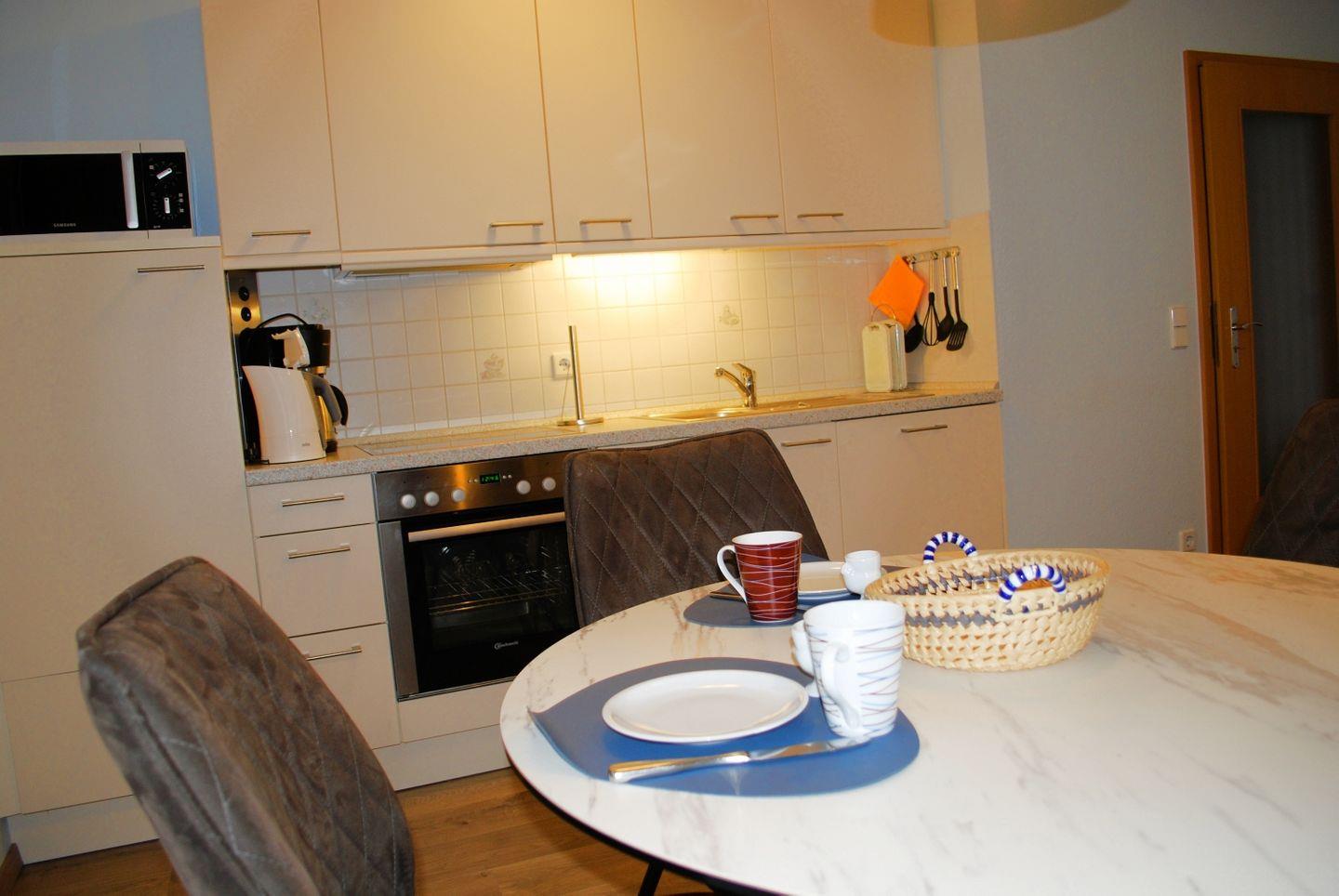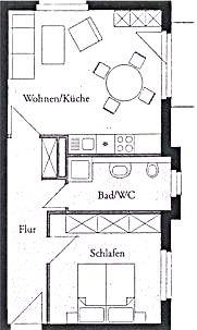 Die 45 m² große Erdgeschoss-Ferienwohnung ist gehoben ausgestattet und verfügt über einen großzügigen Wohnbereich mit Schlafcouch, offener voll ausgestatteter Küchenzeile und Essplatz, einen Schlafraum (Doppelbett) und ein Duschbad. Es stehen kostenfreies Wlan und ein PKW-Stellplatz zur Verfügung. Haustiere sind leider nicht gestattet.