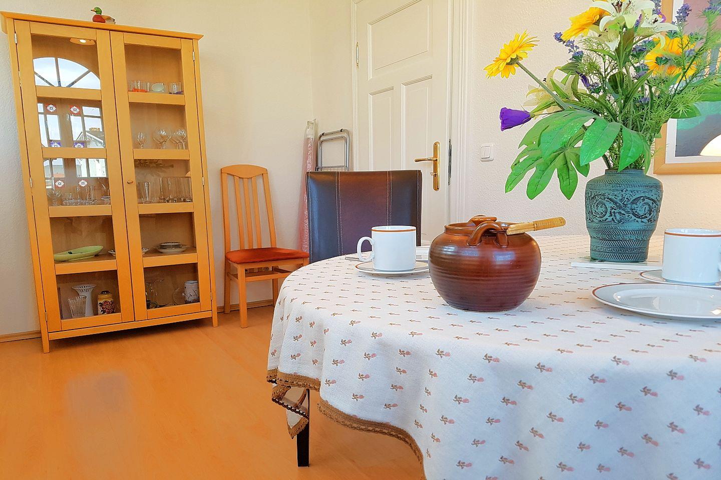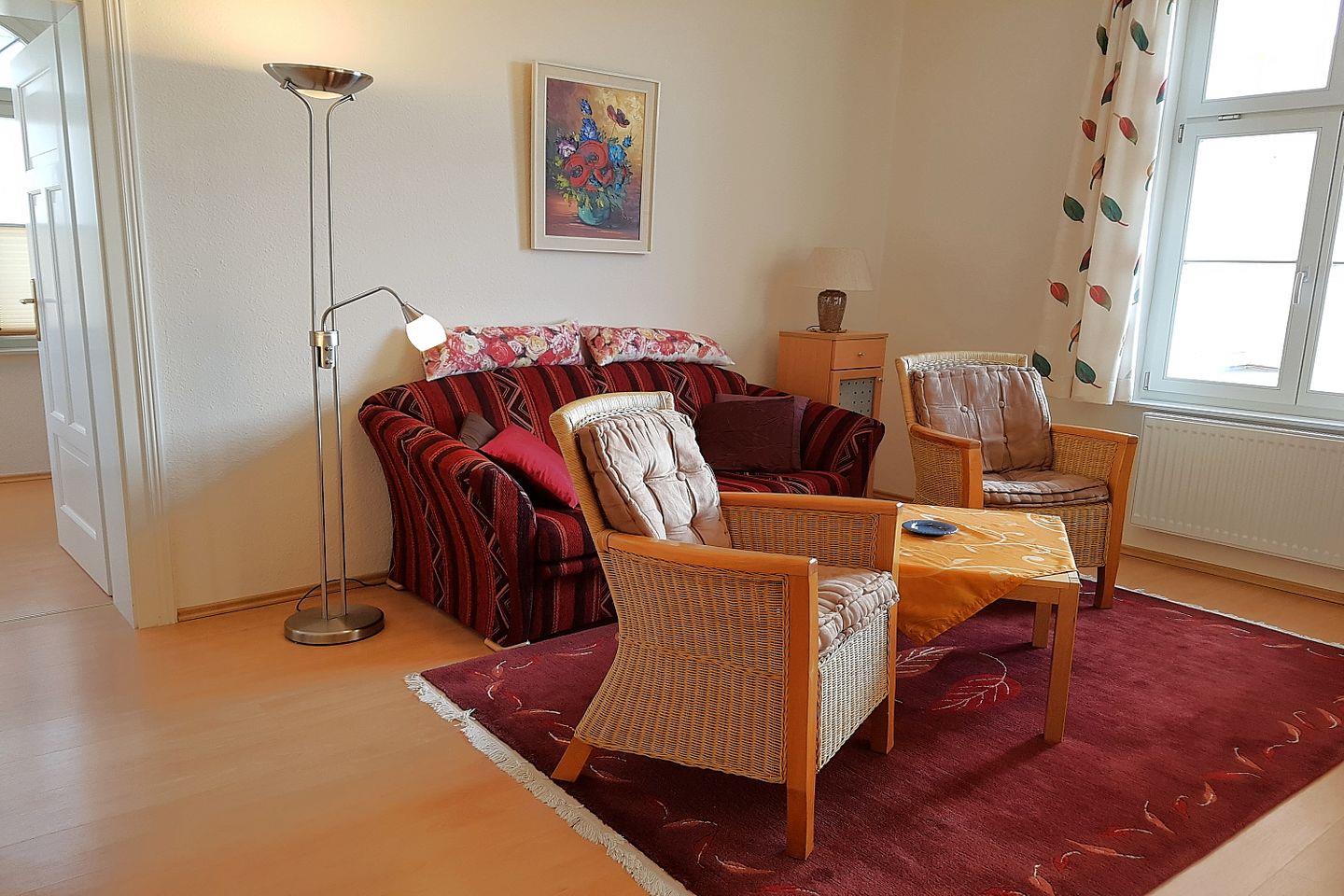 Die geräumige und helle 62 m² große Wohnung befindet sich im 1. OG des Hauses. Das Appartement ist geschmack- und liebevoll eingerichtet und verfügt über einen Wohnraum mit Schlafcouch, offener voll ausgestatteter Küchenzeile und Essplatz sowie eine Veranda, einen Schlafraum