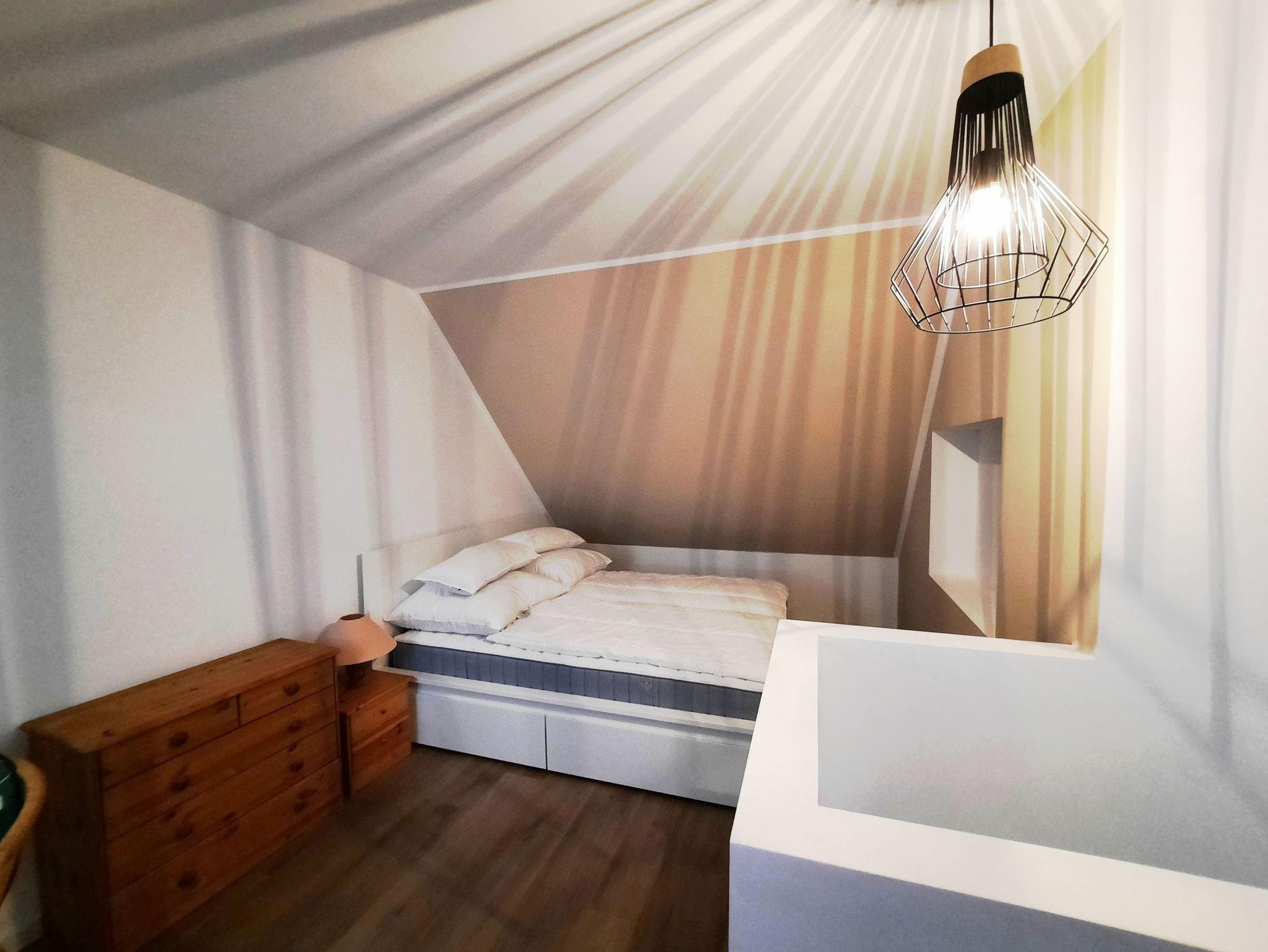 Über eine kleine, steile Treppe erreicht man das zweite Schlafzimmer. Ebenfalls im oberen Wohnbereich gibt es ein weiteres Badezimmer mit WC und ebenerdiger Dusche.