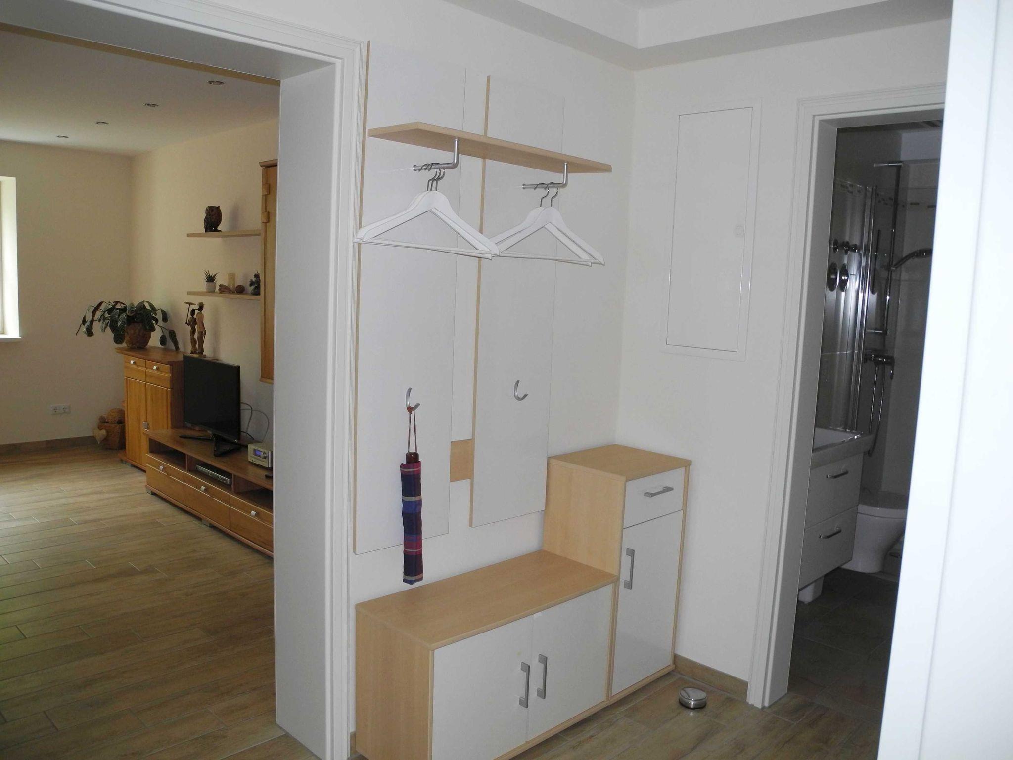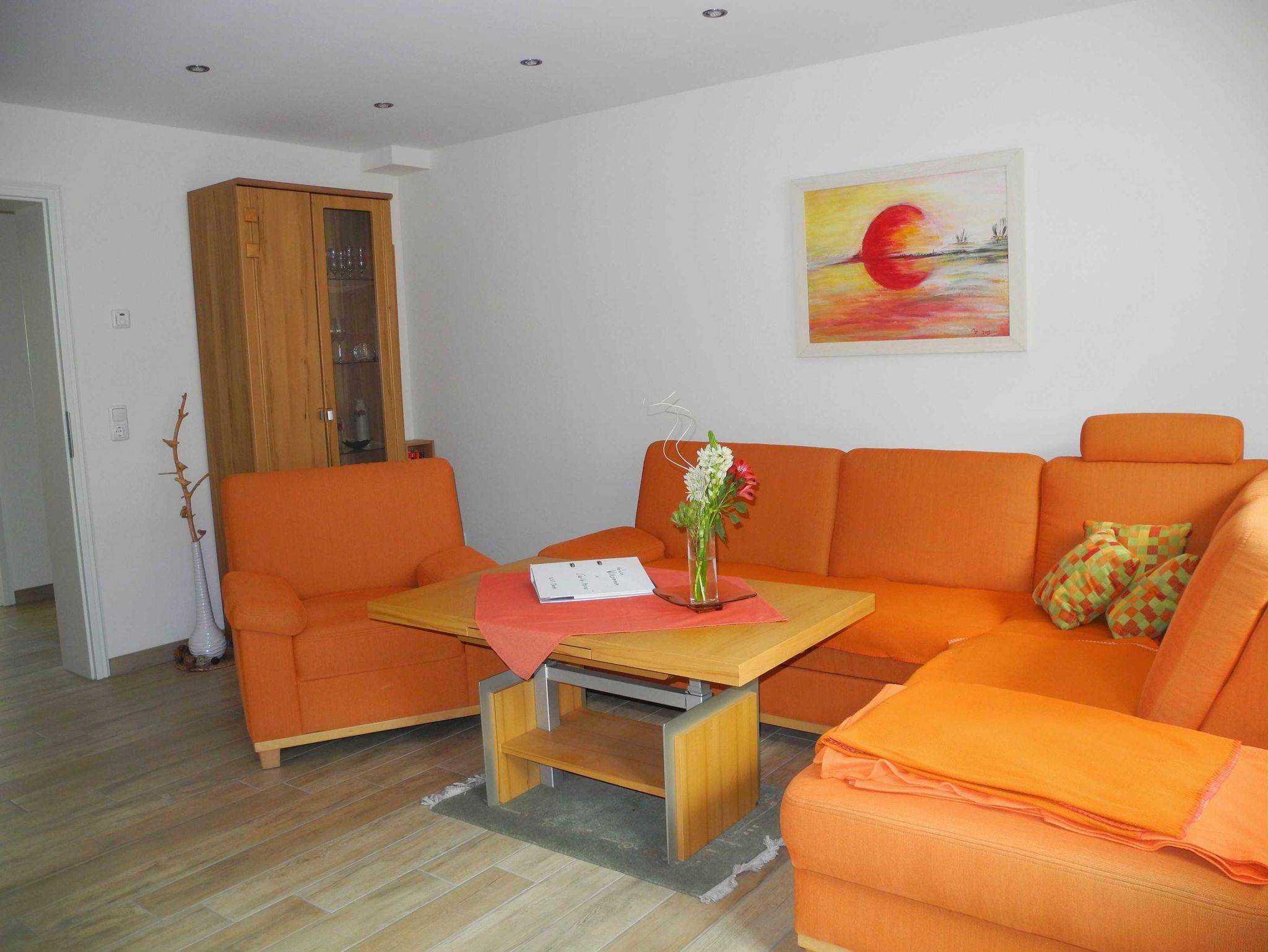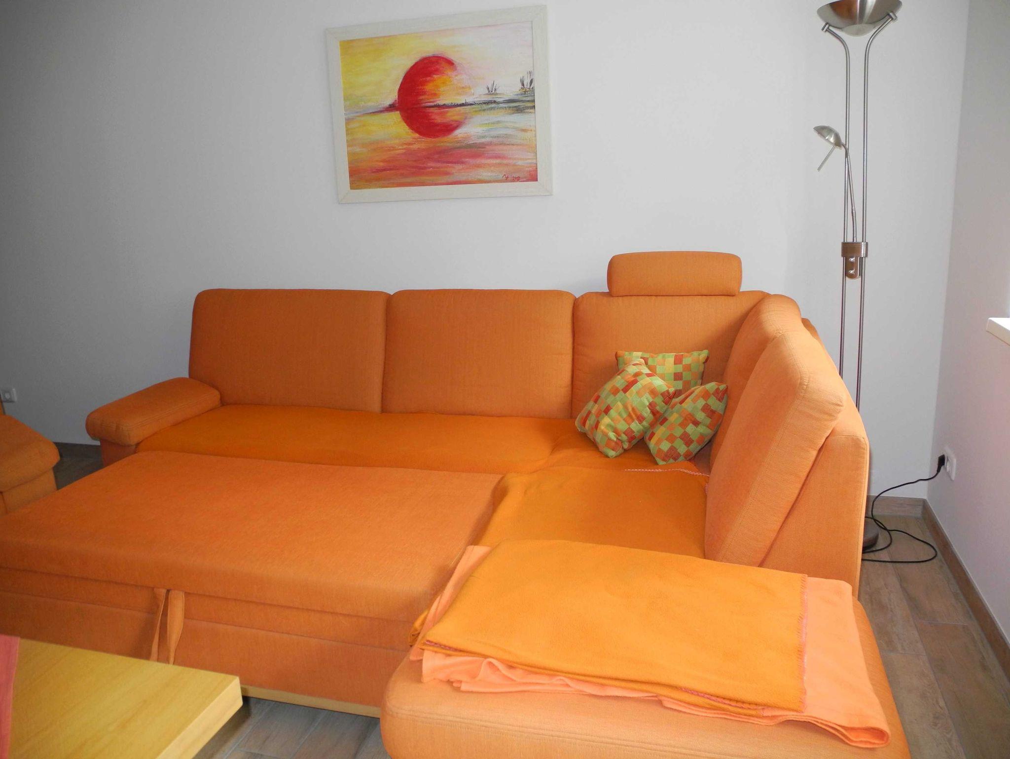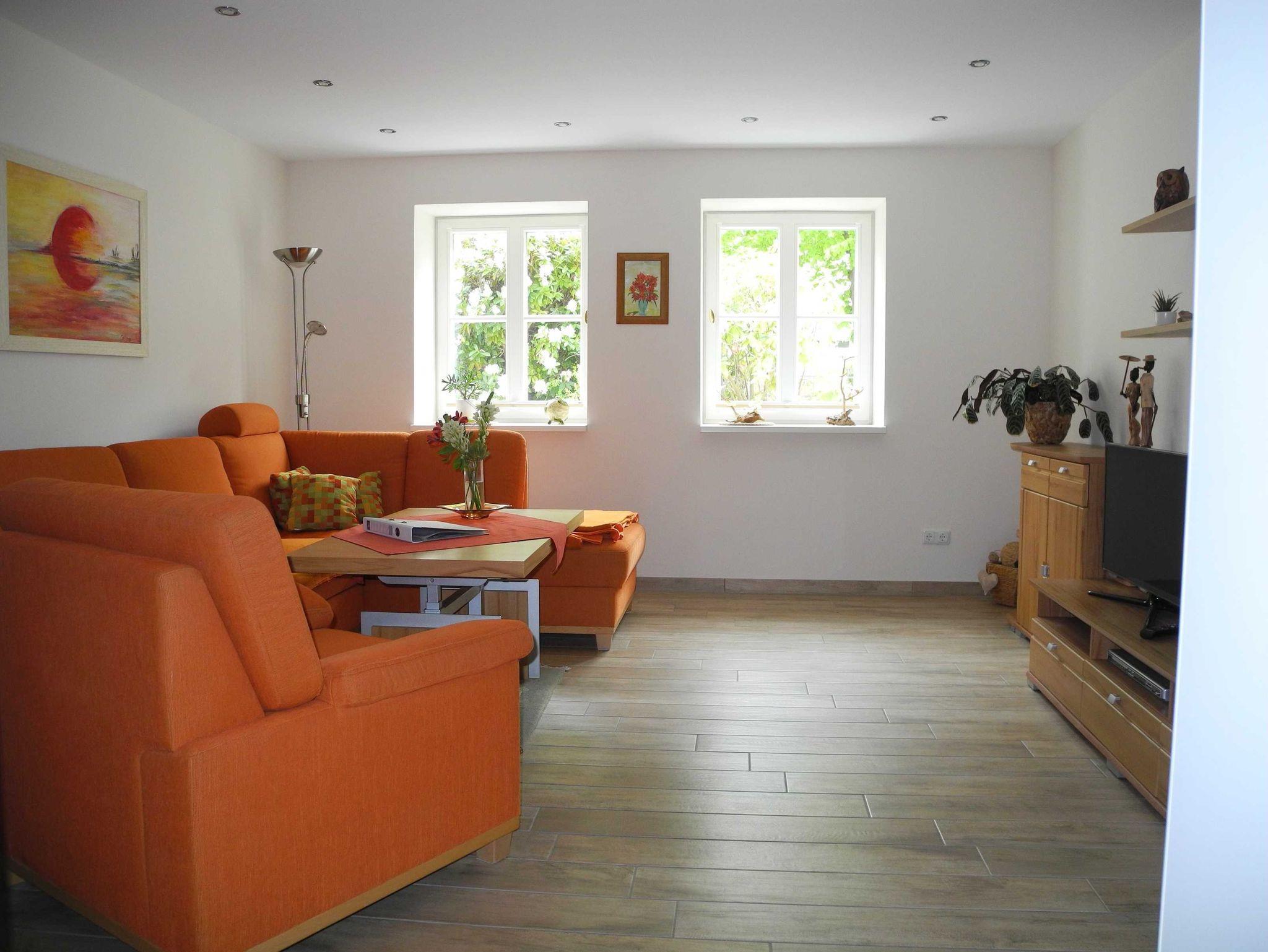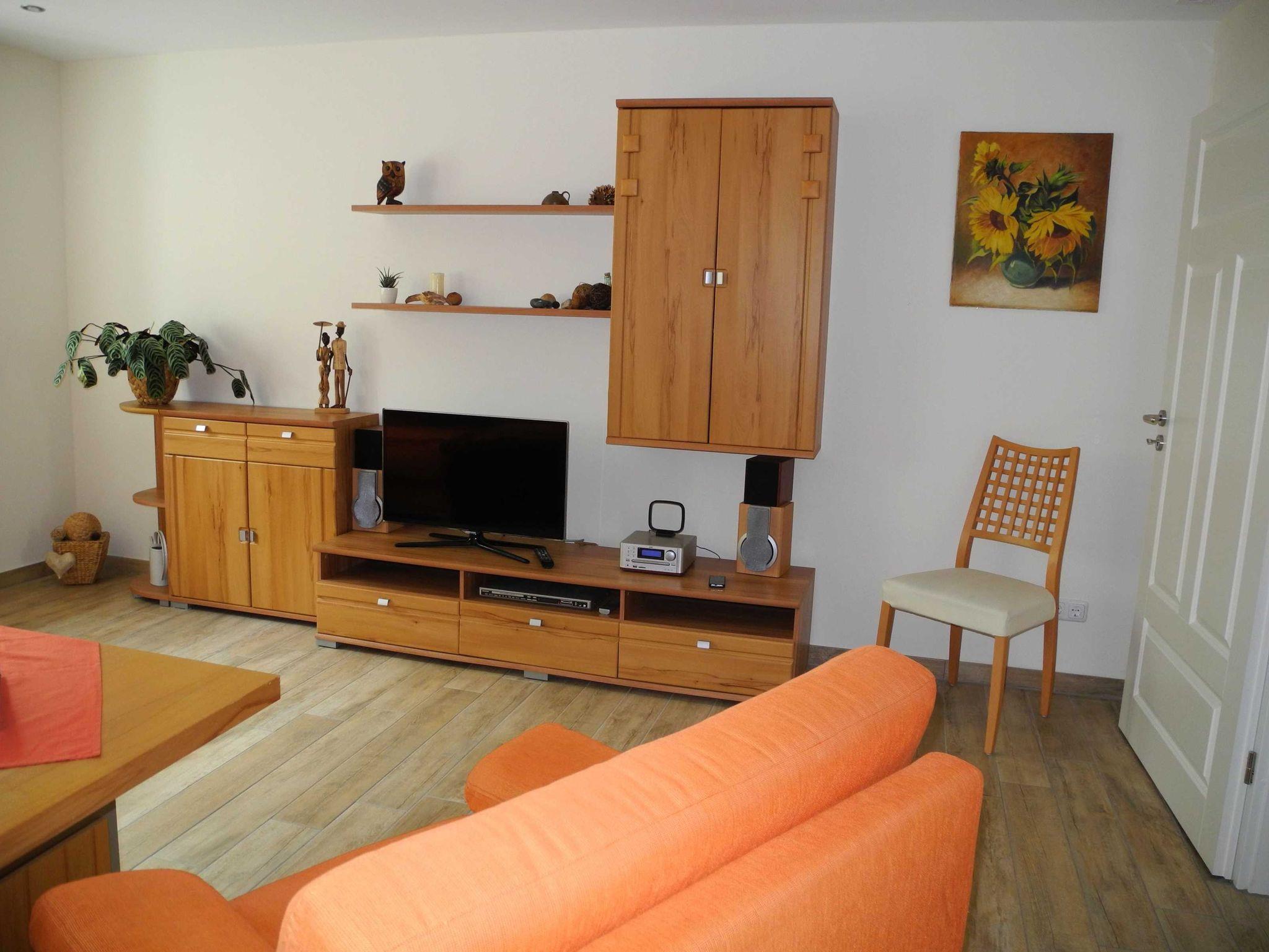 Die Ferienwohnung befindet sich im Souterrain , ist dabei aber ebenerdig zugänglich (barrierefrei), komplett mit Fußbodenheizung ausgestattet, hat ein Schlafzimmer, ein Wohnzimmer, ein modernes Bad, eine offene Küche mit zwei Sitzplätzen und einen Flur. Ein sehr bequemes Bett mit hochwertigen Matratzen u. Federböden in 1,80 m Breite sorgt für guten Schlaf. Mit einer ausziehbaren Doppelcouch im Wohnzimmer stehen Ihnen 2 weitere Schlafmöglichkeiten zur Verfügung. Für Kleinkinder können Sie ein Kinderbett (Reisekinderbett mit Matratze). Bitte denken Sie daran, das Bettzeug dafür selbst mitzubringen. Auch ein Hochstuhl können Sie gern bei Bedarf dazu buchen.